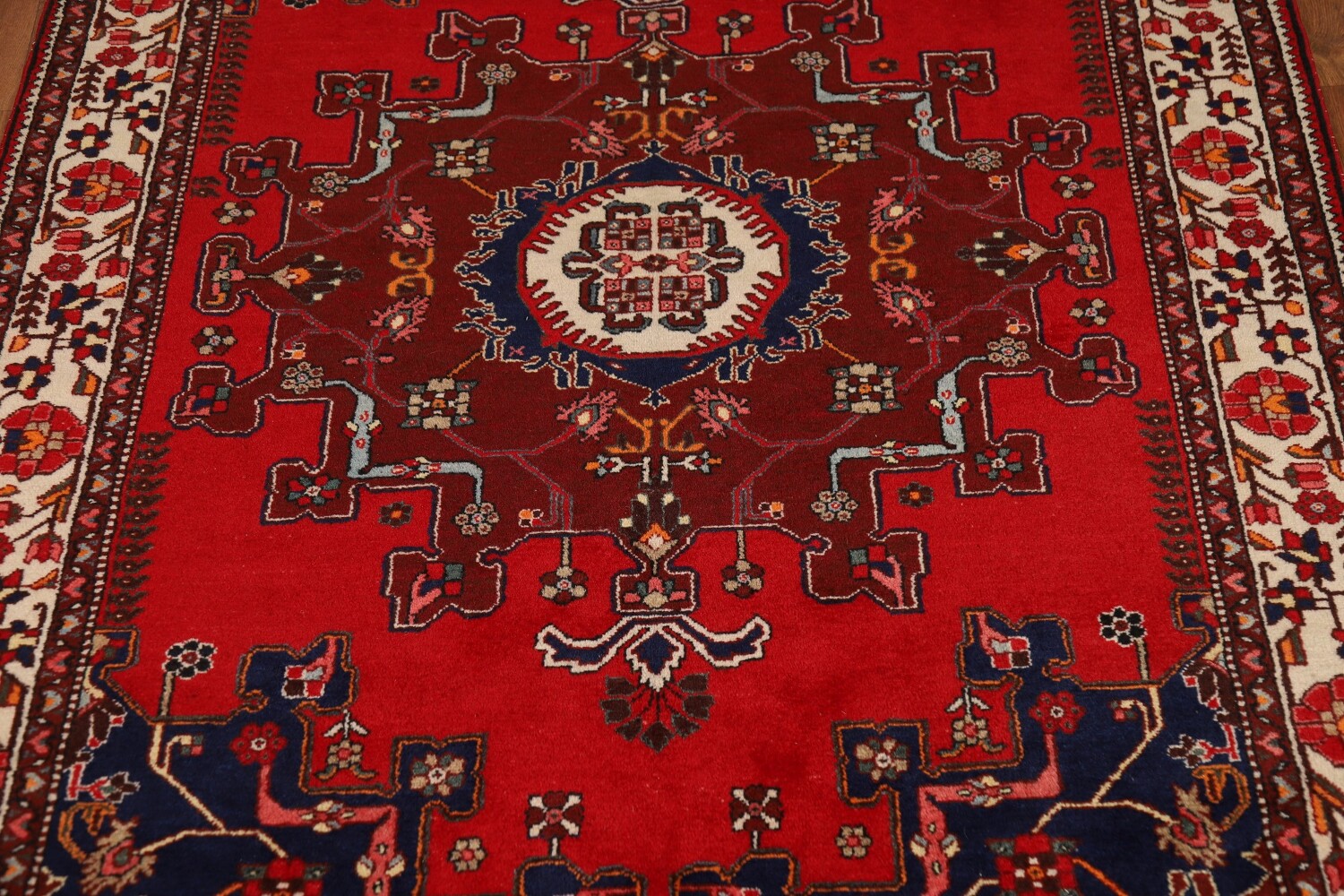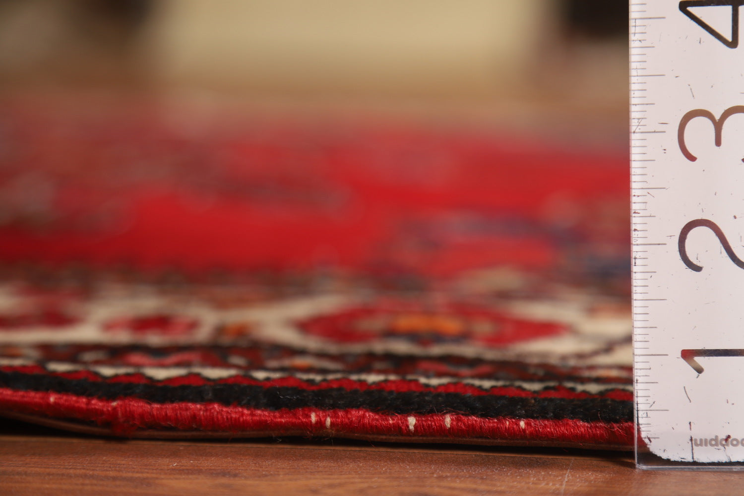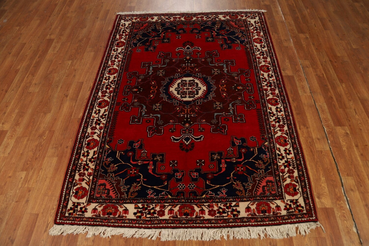 A Beautiful Genuine Persia ( Persia ) Hamedan rug is Hand Knotted by skillful weavers in Persia ( Persia ) with 100% Wool Material. This rug is in Excellent condition. dimensions are 6' 4'' X 4' 8'' in foot and 193 X 142 in centimeter. the primary color is Red.