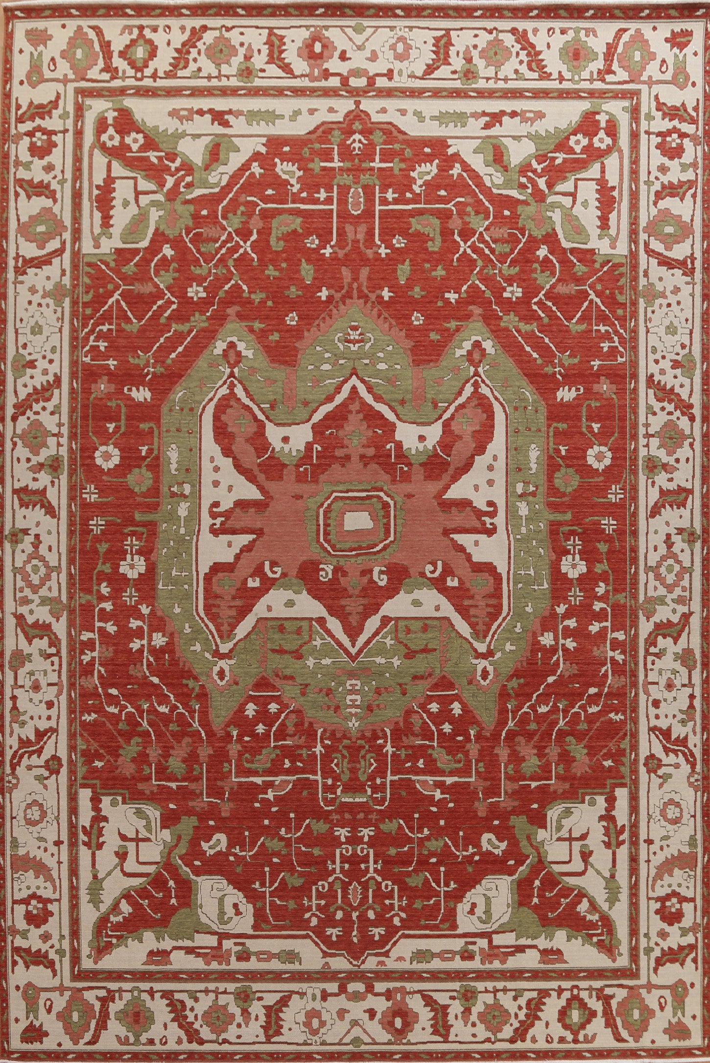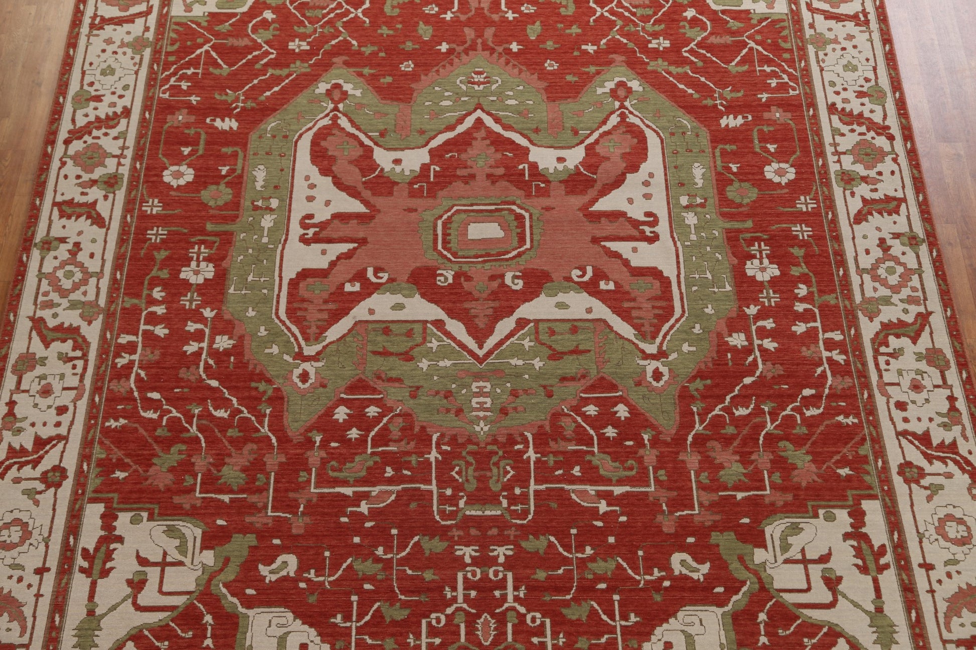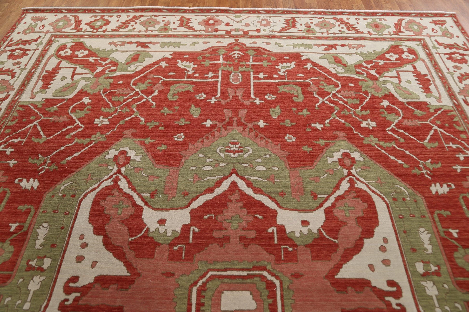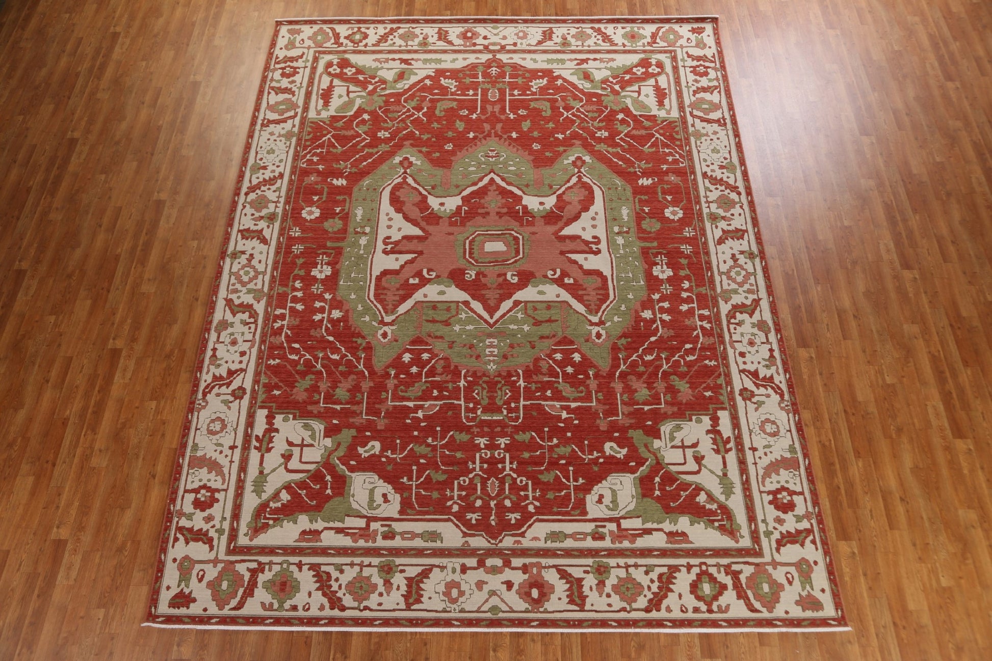 A Beautiful Genuine Turkey Heriz (serapi) rug is Hand Knotted by skillful weavers in Turkey with 100% Wool Material. This rug is in New, First Quality condition. dimensions are 13' 0'' X 9' 9'' in foot and 396 X 297 in centimeter. the primary color is Red.