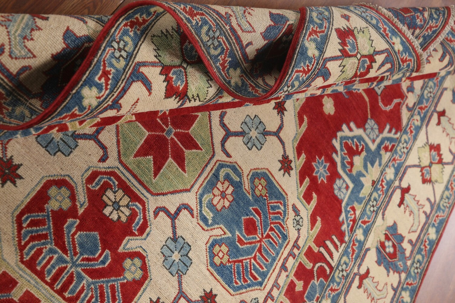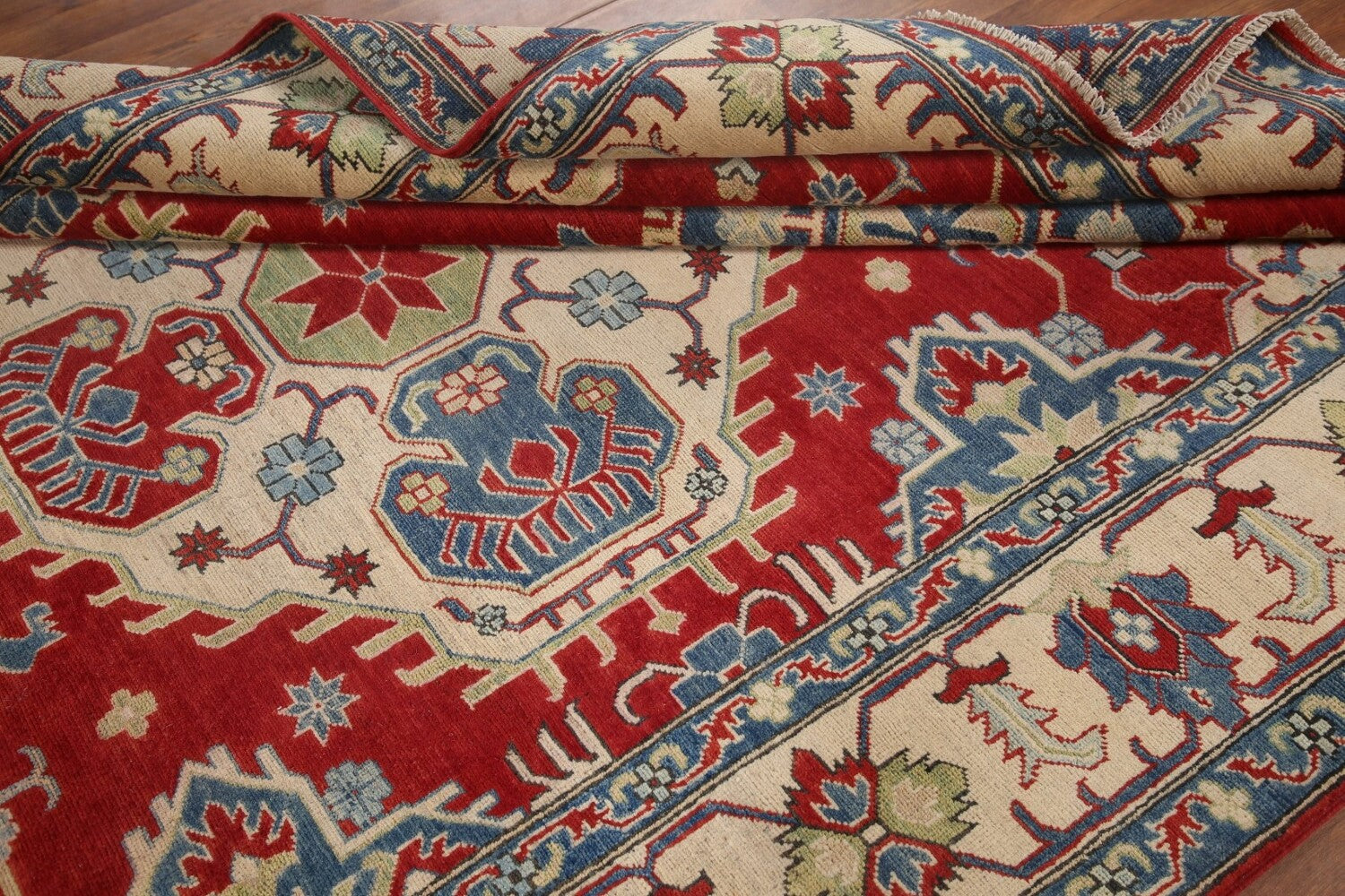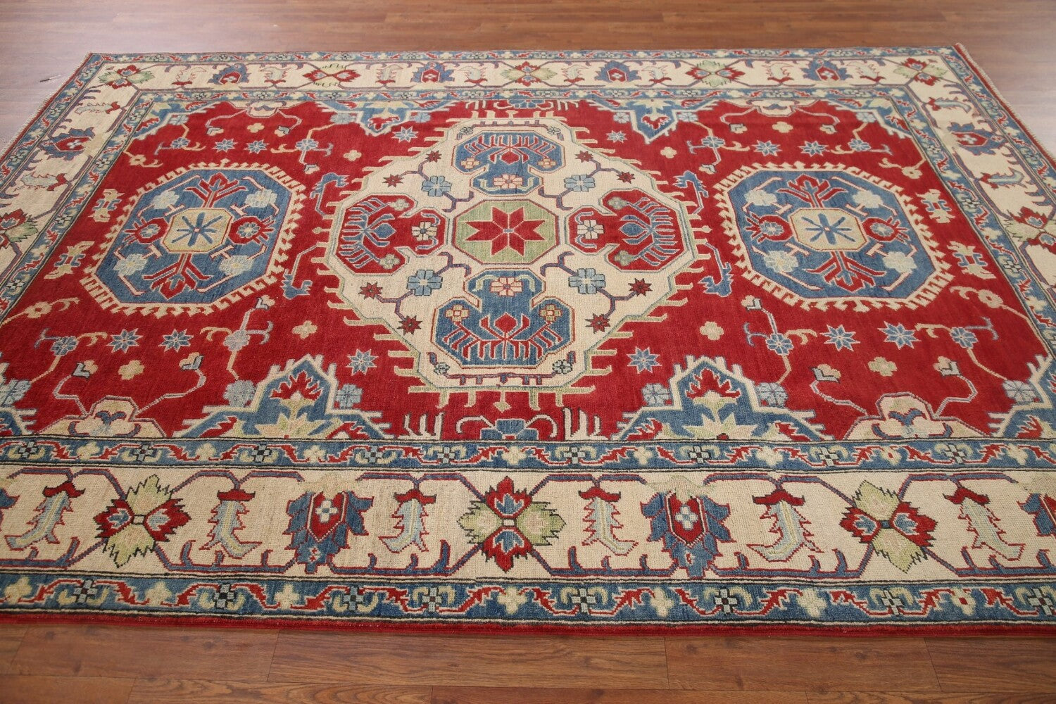 A Beautiful Genuine Pakistan Kazak rug is Hand Knotted by skillful weavers in Pakistan with 100% Wool Material. This rug is in New, First Quality condition. dimensions are 9' 7'' X 6' 7'' in foot and 292 X 201 in centimeter. the primary color is Red.