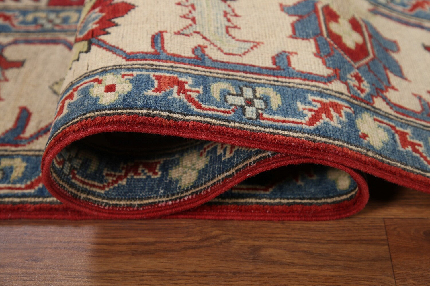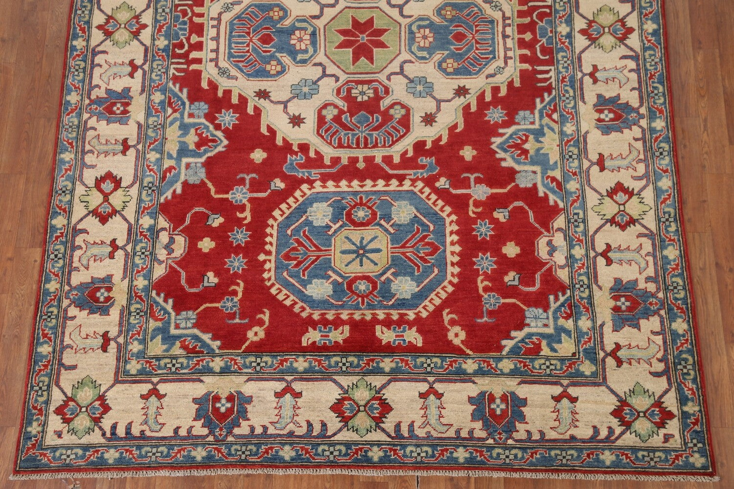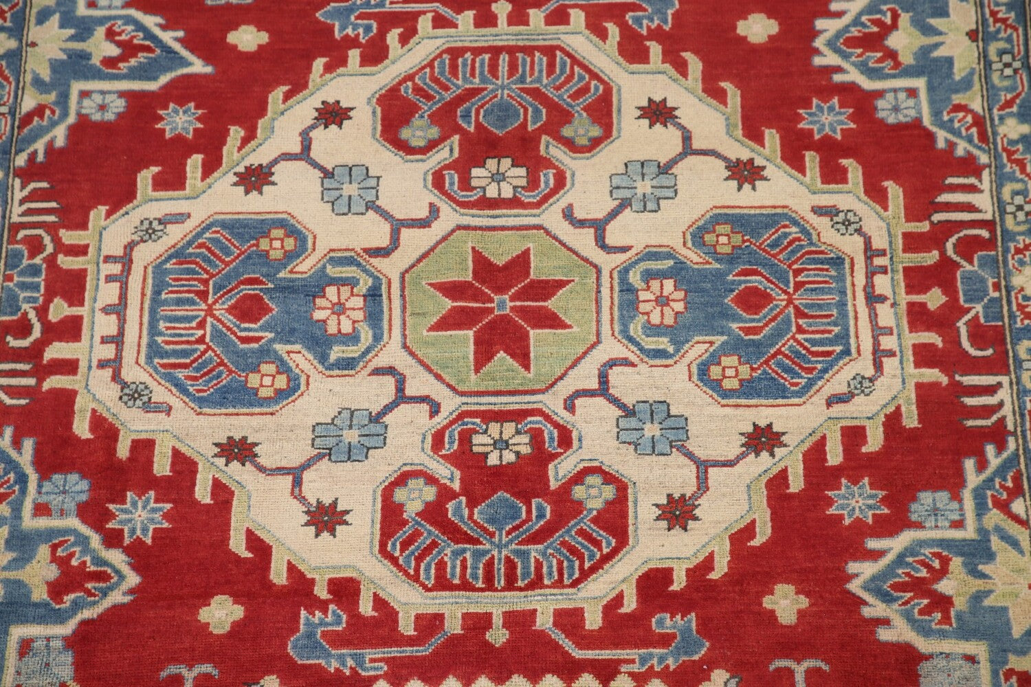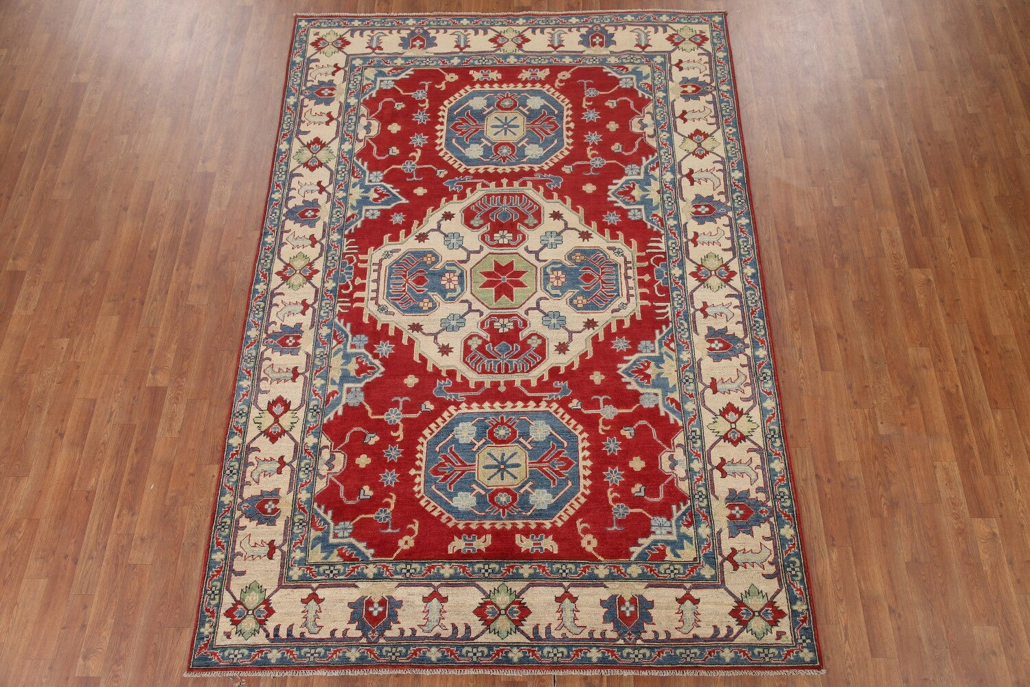 A Beautiful Genuine Pakistan Kazak rug is Hand Knotted by skillful weavers in Pakistan with 100% Wool Material. This rug is in New, First Quality condition. dimensions are 9' 7'' X 6' 7'' in foot and 292 X 201 in centimeter. the primary color is Red.