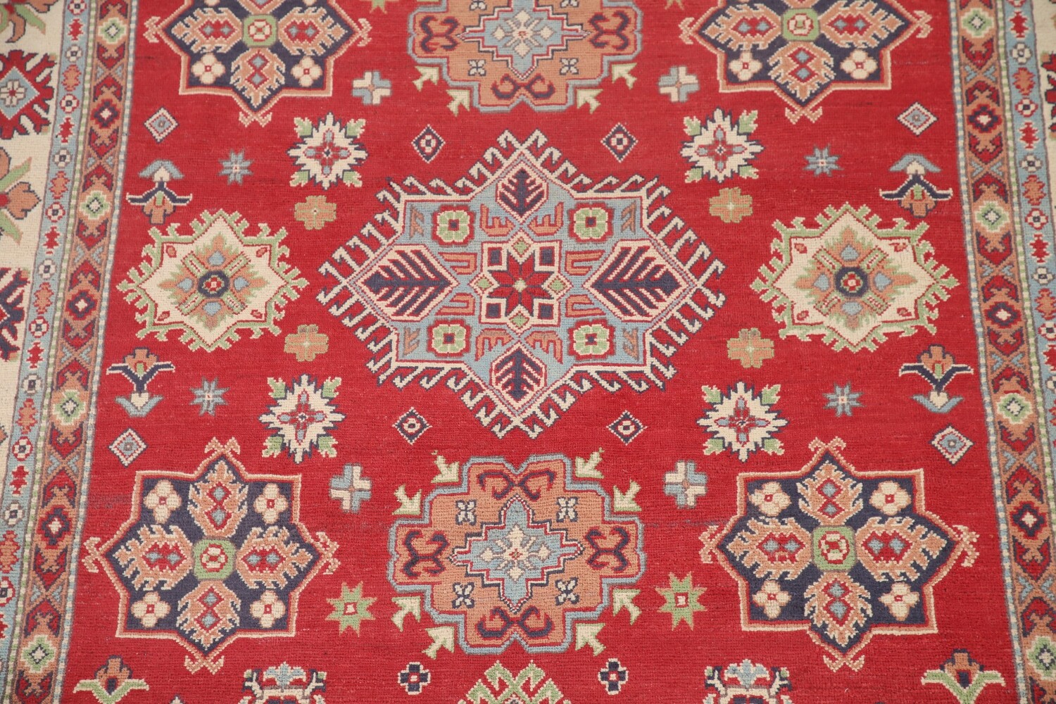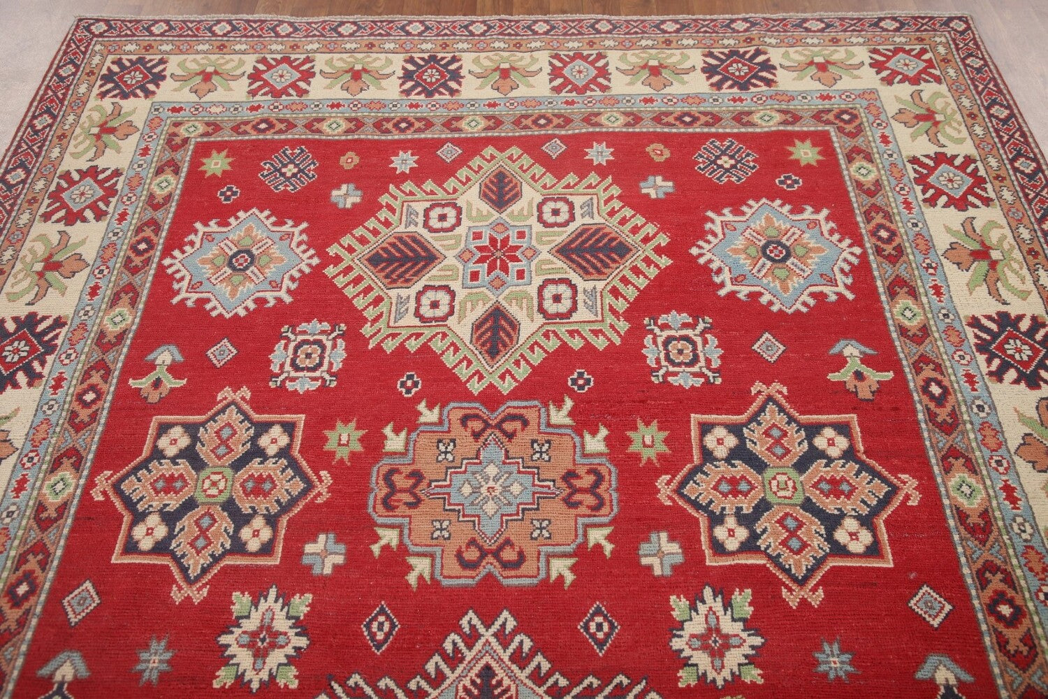 A Beautiful Genuine Pakistan Kazak rug is Hand Knotted by skillful weavers in Pakistan with 100% Wool Material. This rug is in New, First Quality condition. dimensions are 10' 2'' X 6' 4'' in foot and 310 X 193 in centimeter. the primary color is Red.