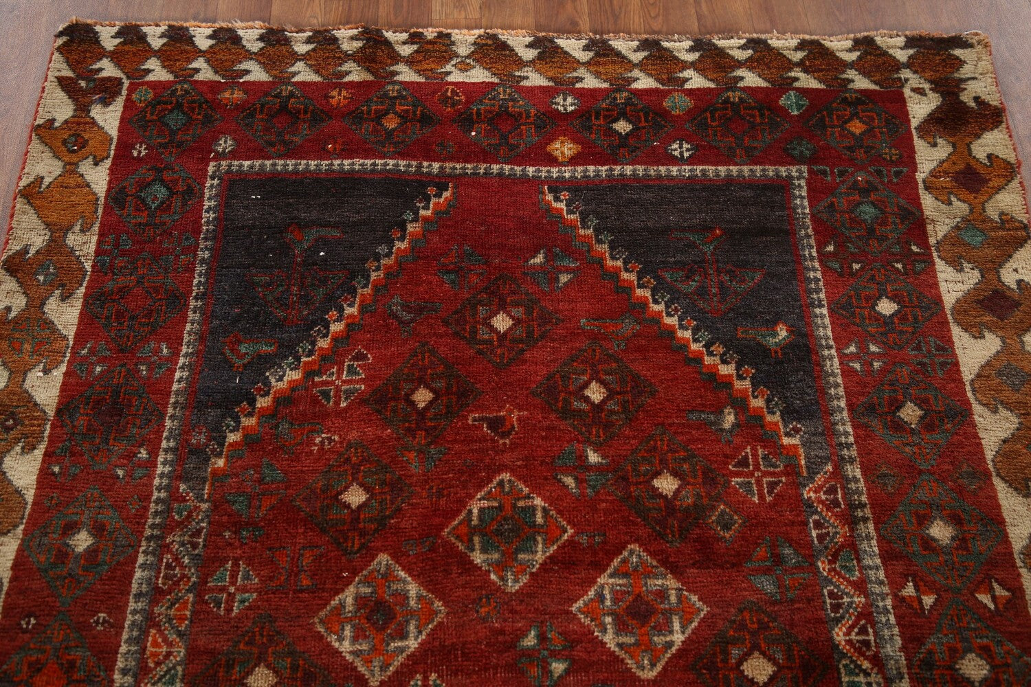 A Beautiful Genuine Persia ( Persia ) Shiraz rug is Hand Knotted by skillful weavers in Persia ( Persia ) with 100% Wool Material. This rug is in Very Good(Evenly Low Pile) condition. dimensions are 8' 5'' X 4' 6'' in foot and 257 X 137 in centimeter. the primary color is Red.