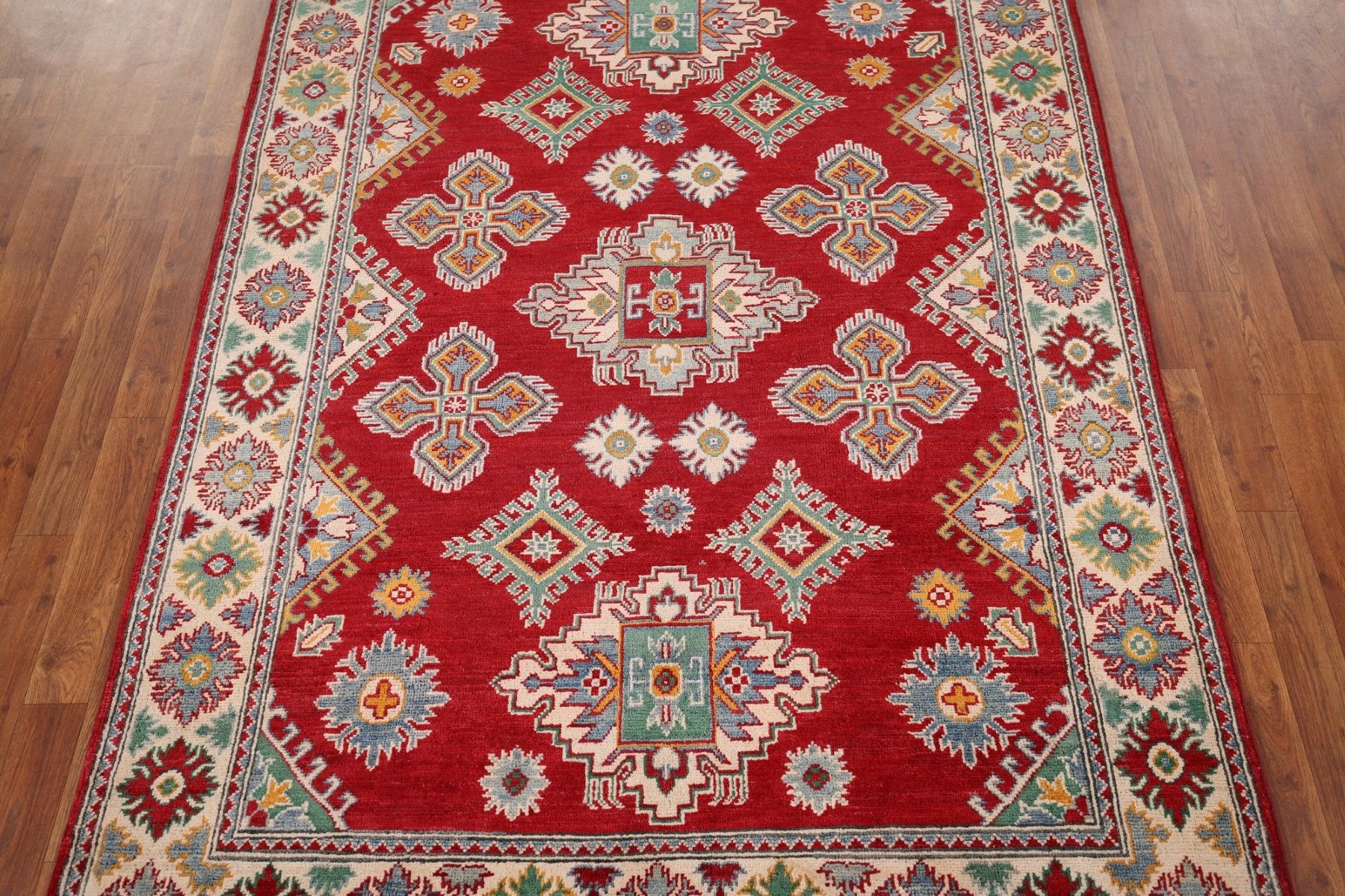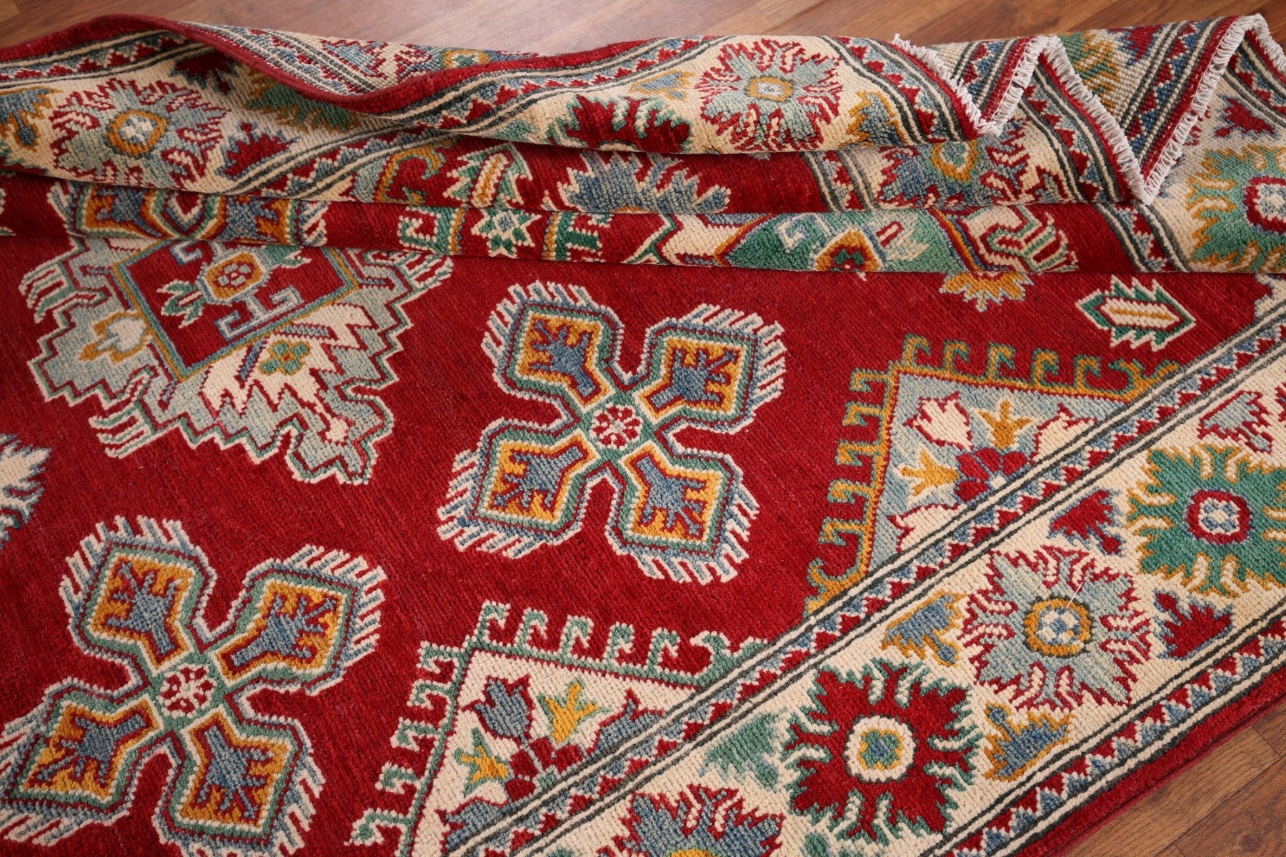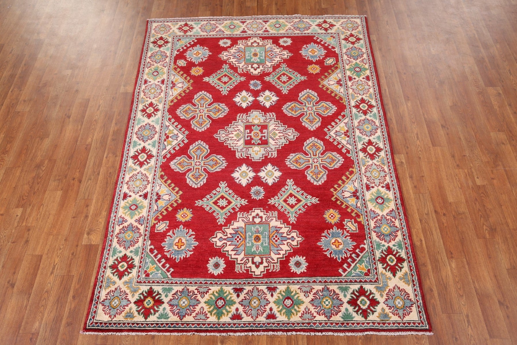 A Beautiful Genuine Pakistan Kazak rug is Hand Knotted by skillful weavers in Pakistan with 100% Wool Material. This rug is in New, First Quality condition. dimensions are 6' 11'' X 4' 10'' in foot and  211 X 147 in centimeter. the primary color is Red.