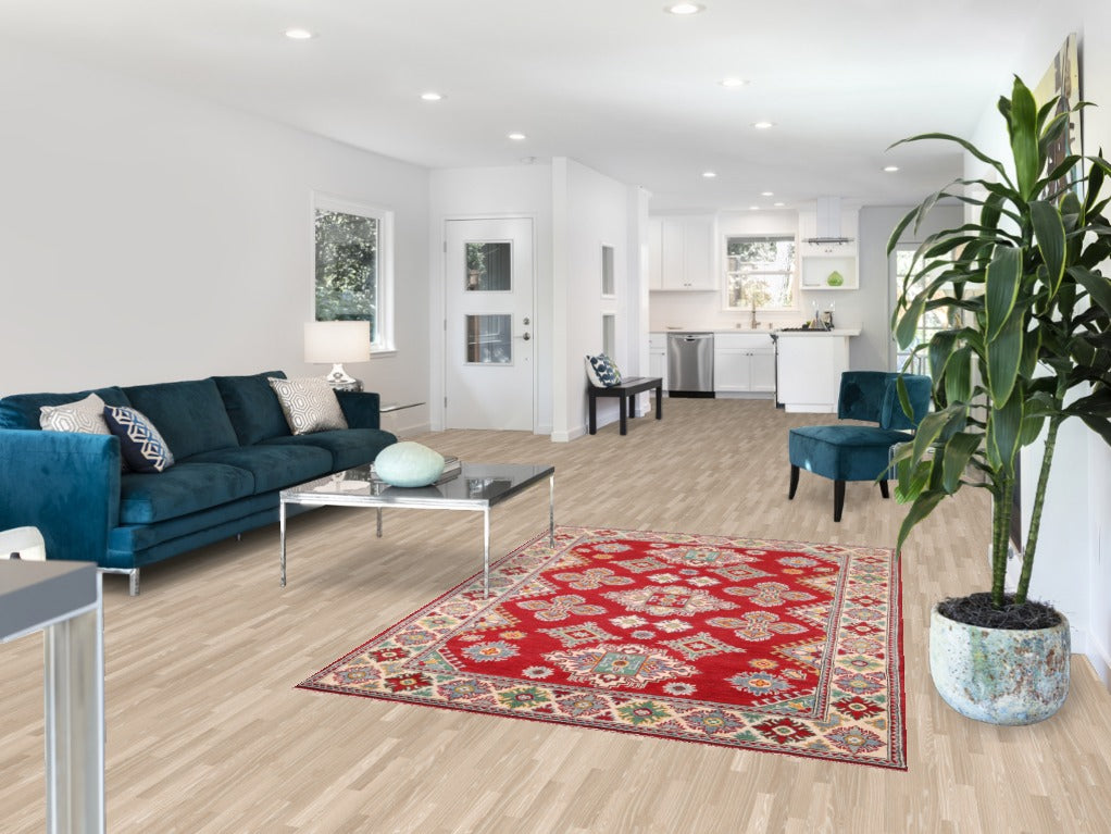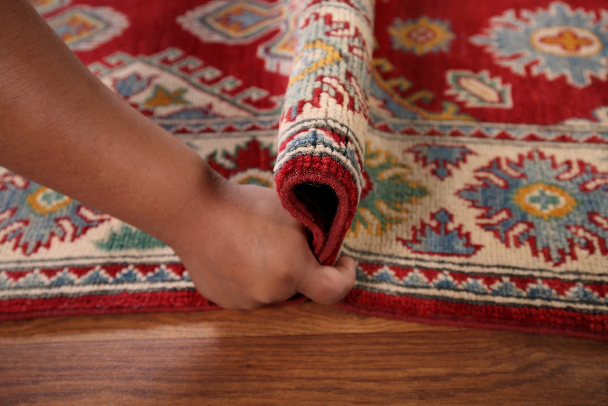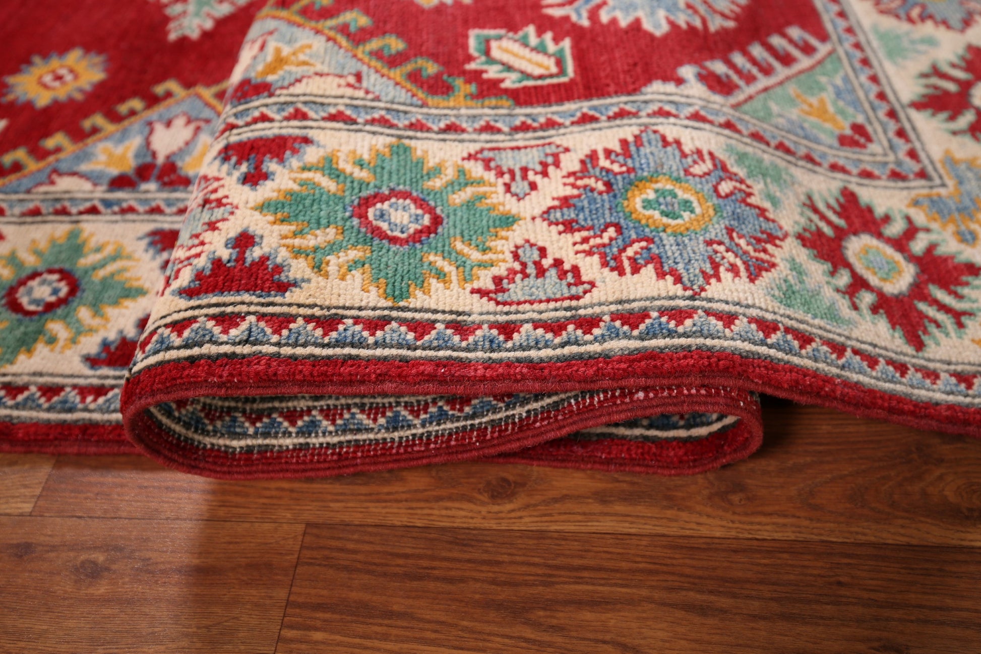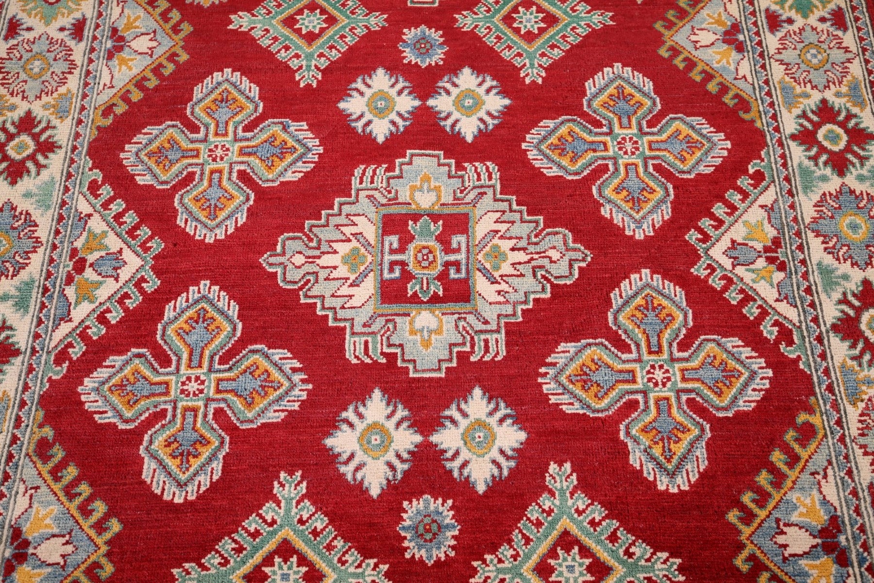 A Beautiful Genuine Pakistan Kazak rug is Hand Knotted by skillful weavers in Pakistan with 100% Wool Material. This rug is in New, First Quality condition. dimensions are 6' 11'' X 4' 10'' in foot and  211 X 147 in centimeter. the primary color is Red.