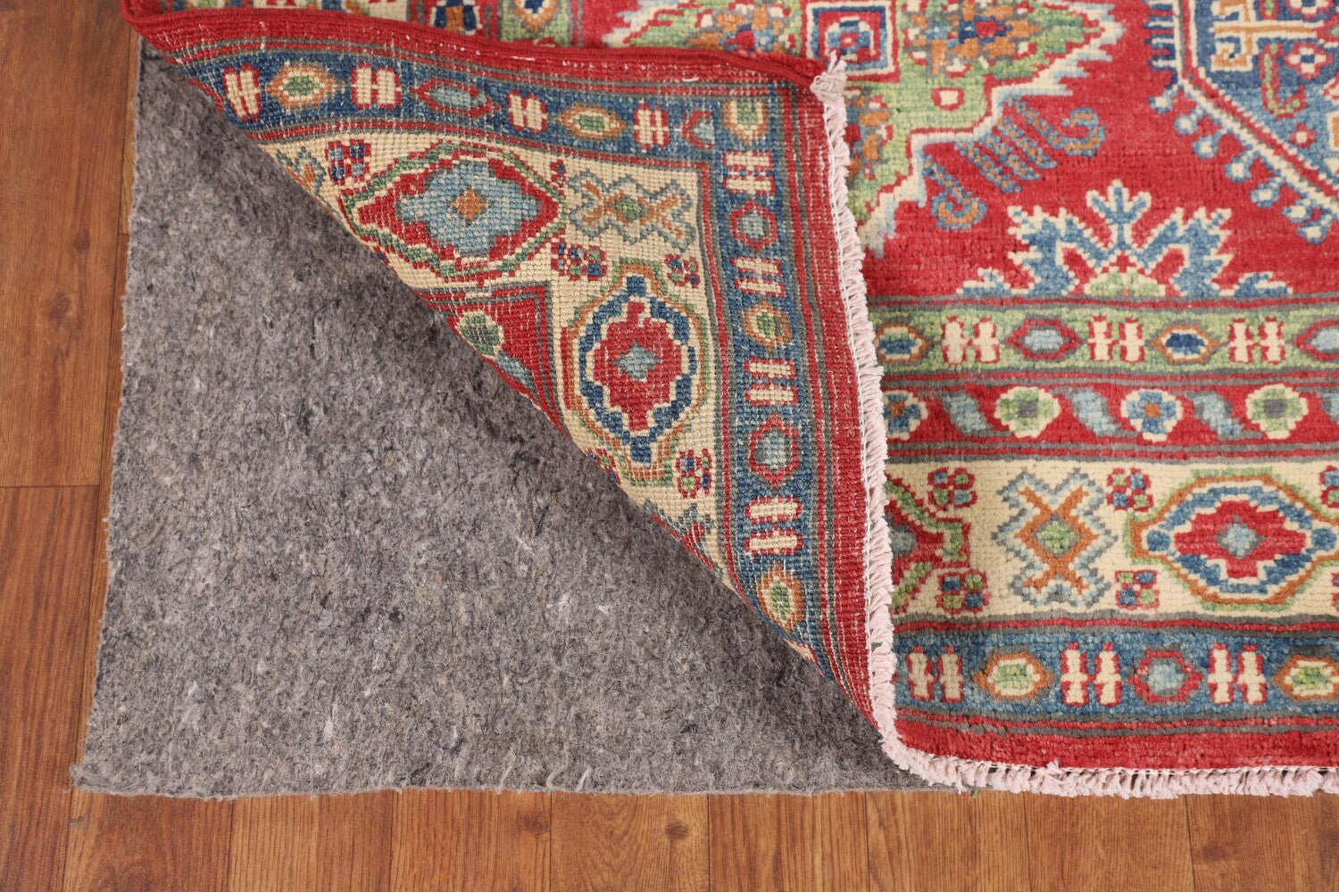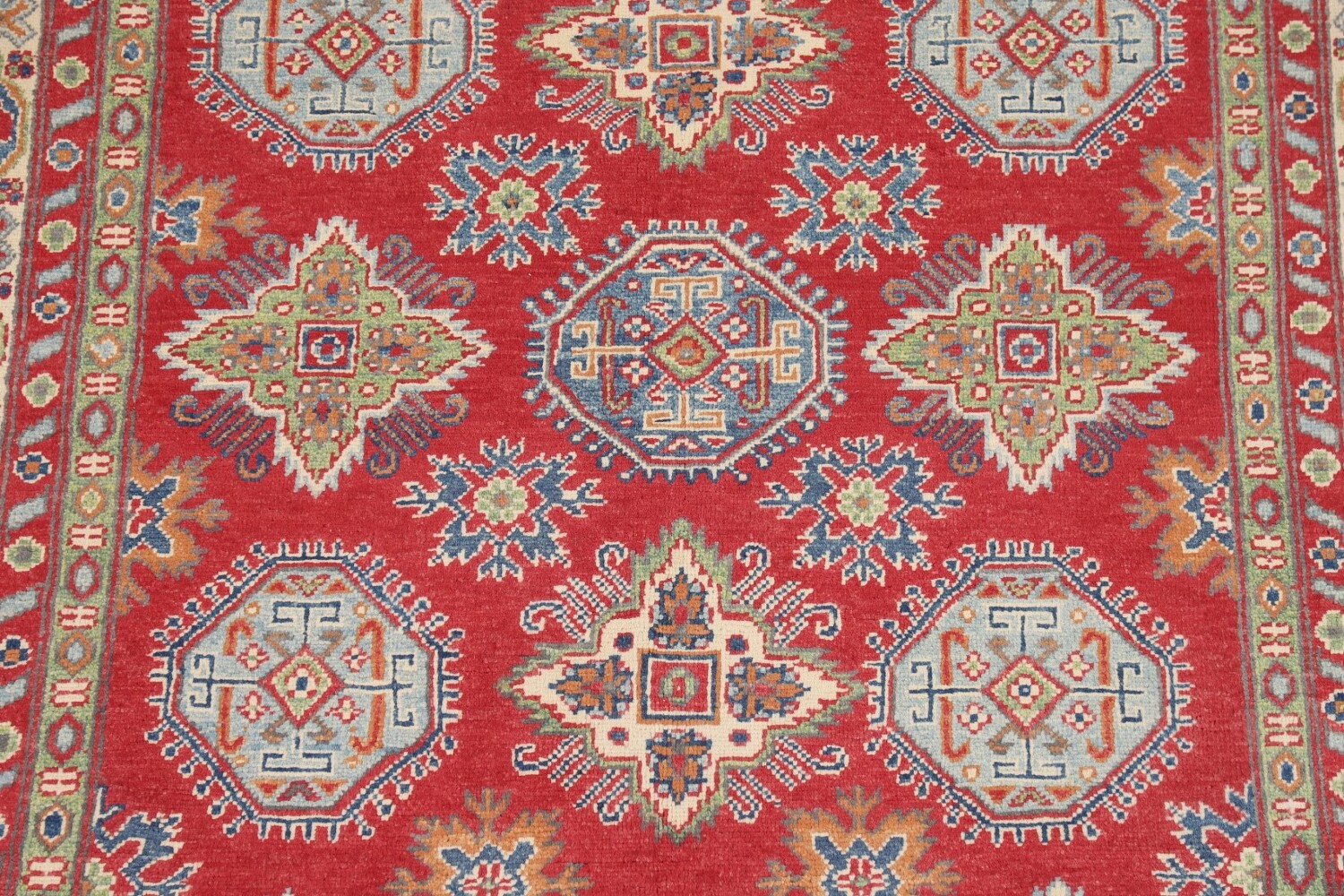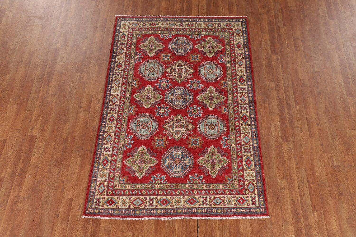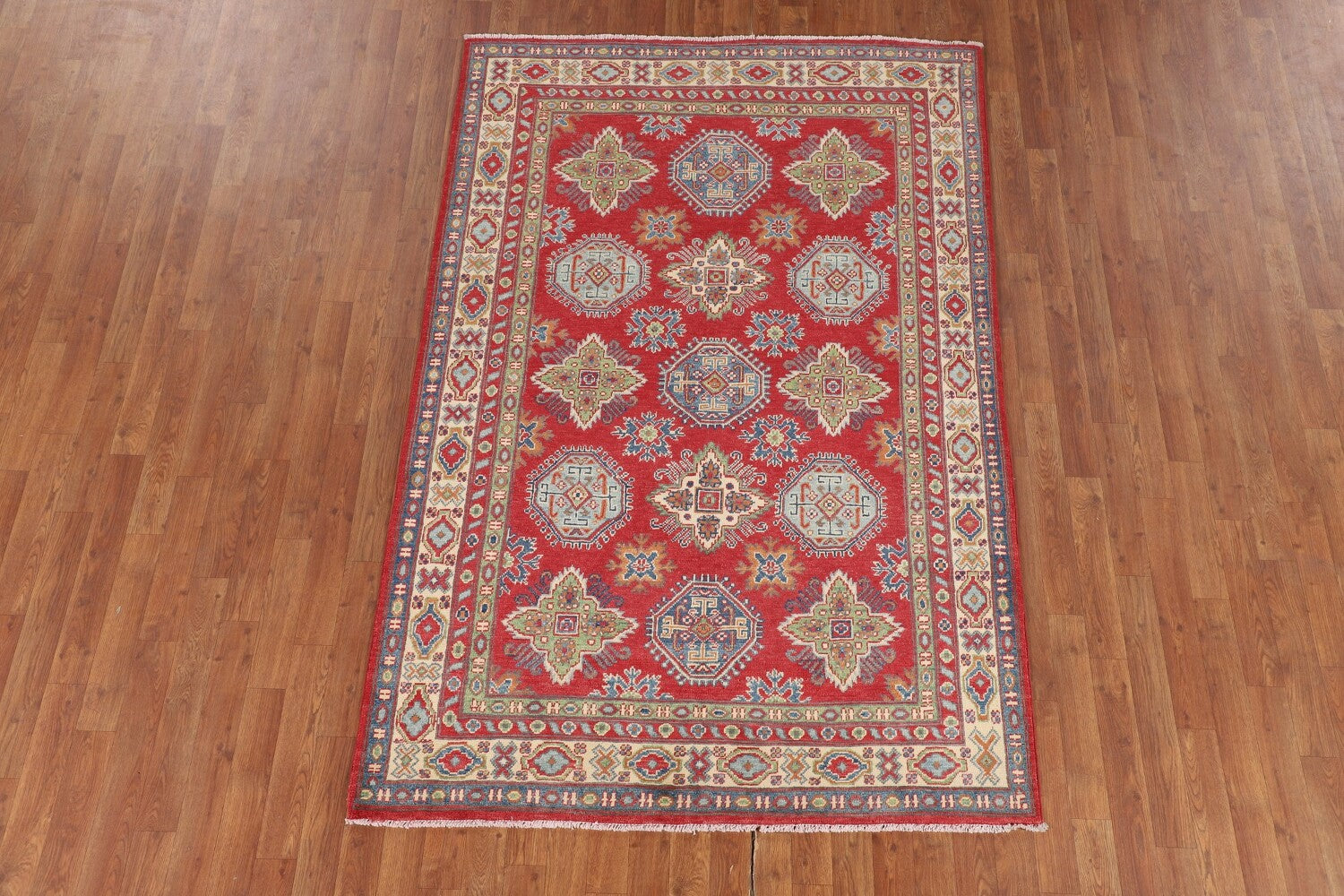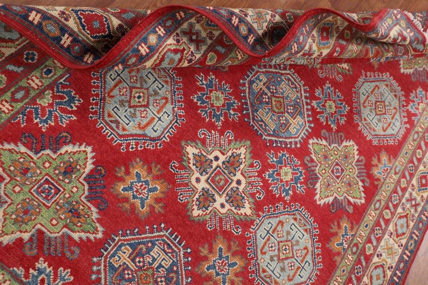 A Beautiful Genuine Pakistan Kazak rug is Hand Knotted by skillful weavers in Pakistan with 100% Wool Material. This rug is in New, First Quality condition. dimensions are 7' 2'' X 4' 8'' in foot and 218 X 142 in centimeter. the primary color is Red.