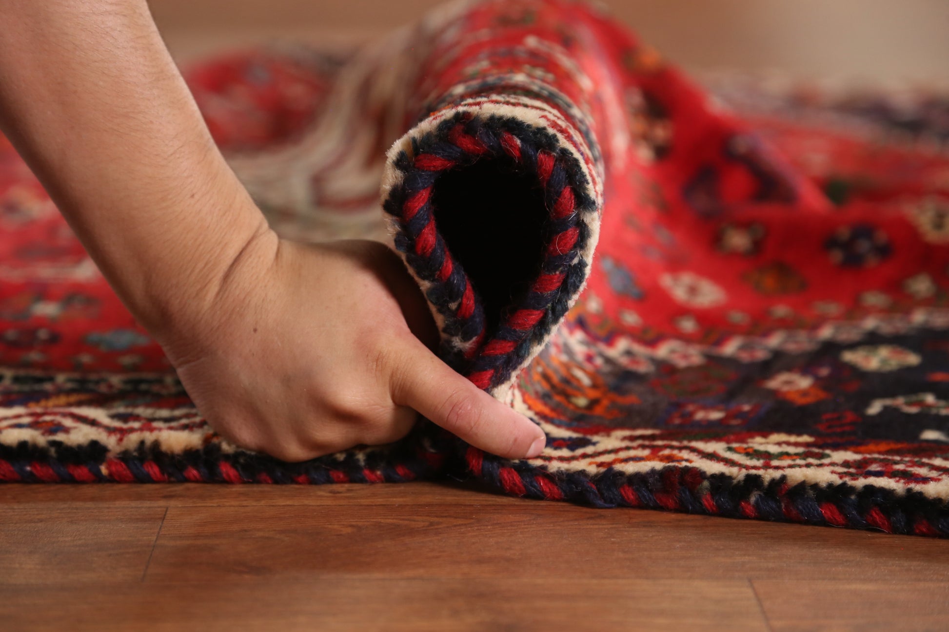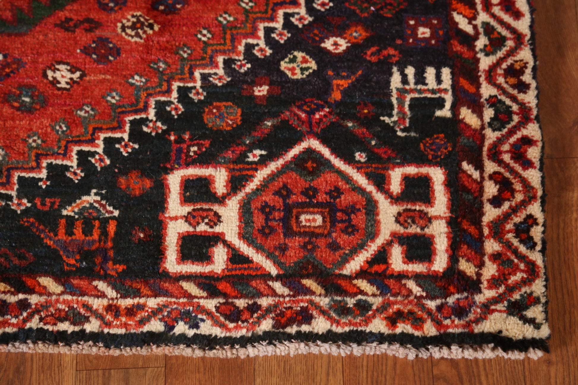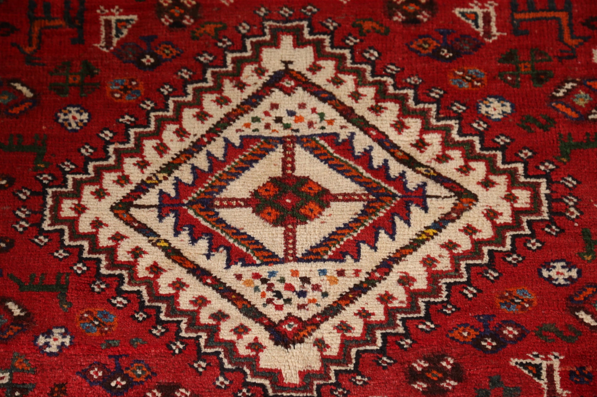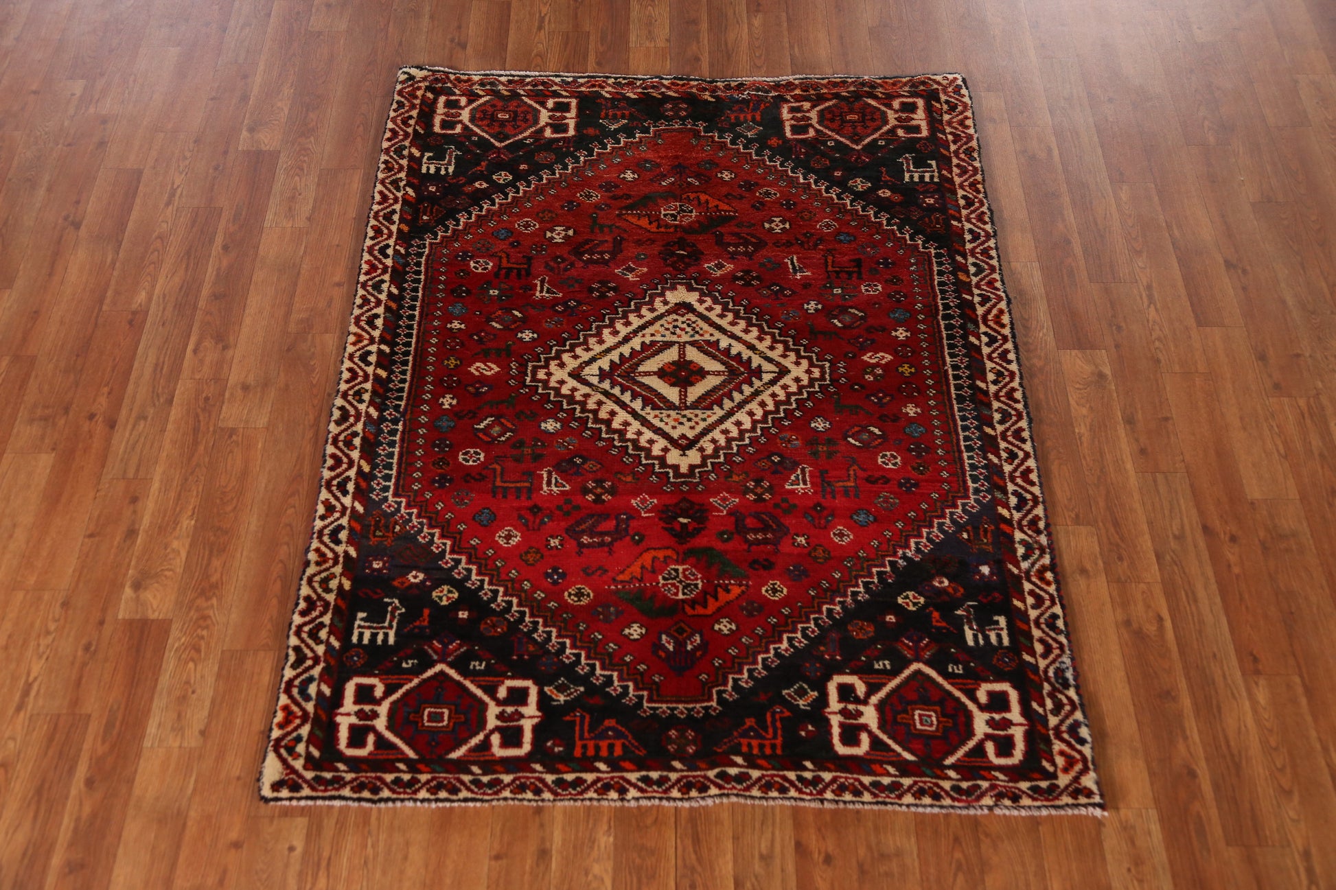 A Beautiful Genuine Persia ( Persia ) Shiraz rug is Hand Knotted by skillful weavers in Persia ( Persia ) with 100% Wool Material. This rug is in Very Good condition. dimensions are 4' 10'' X 3' 9'' in foot and 147 X 114 in centimeter. the primary color is Red.