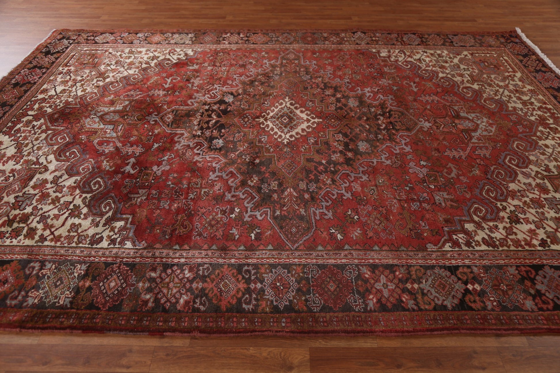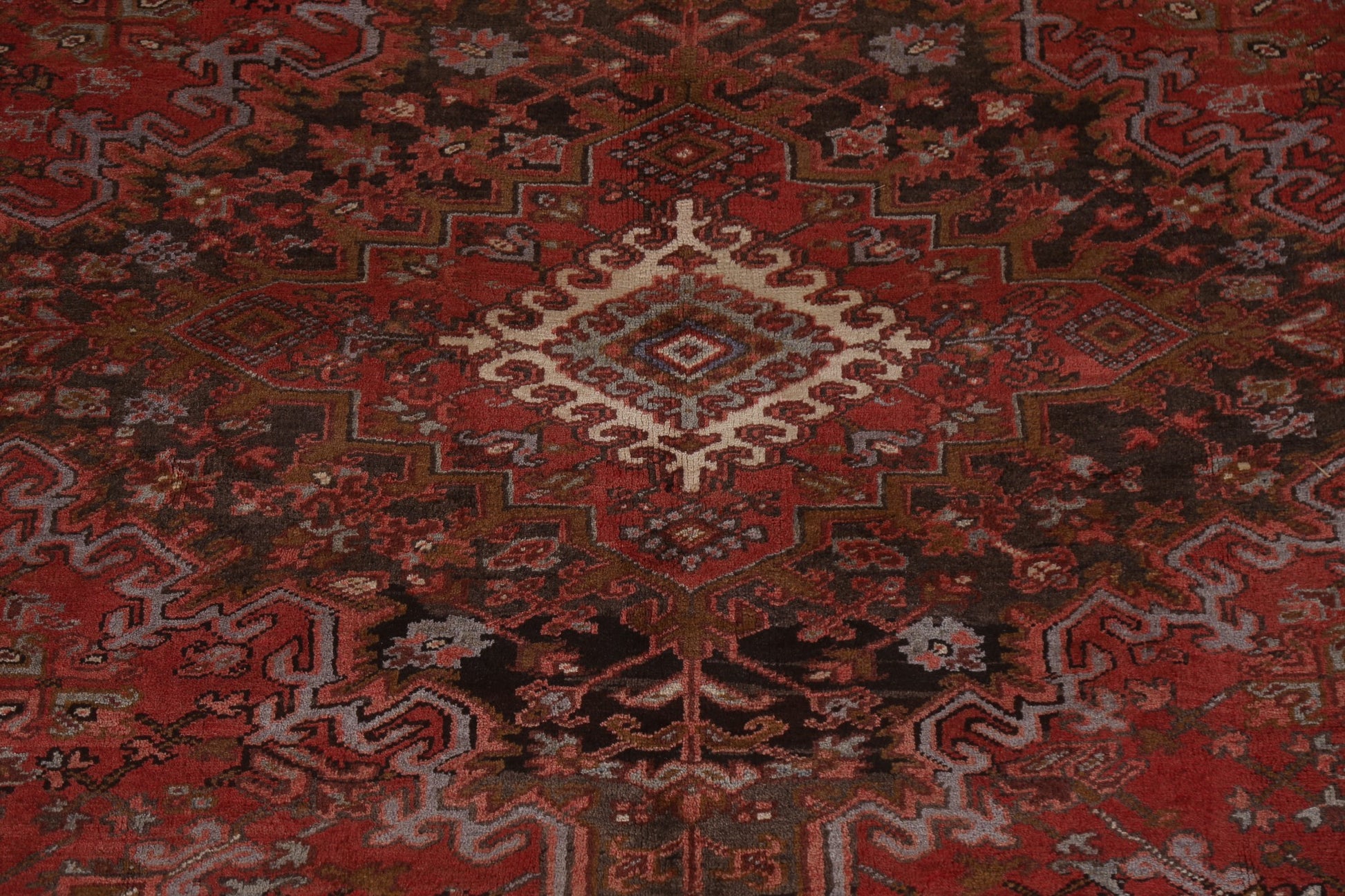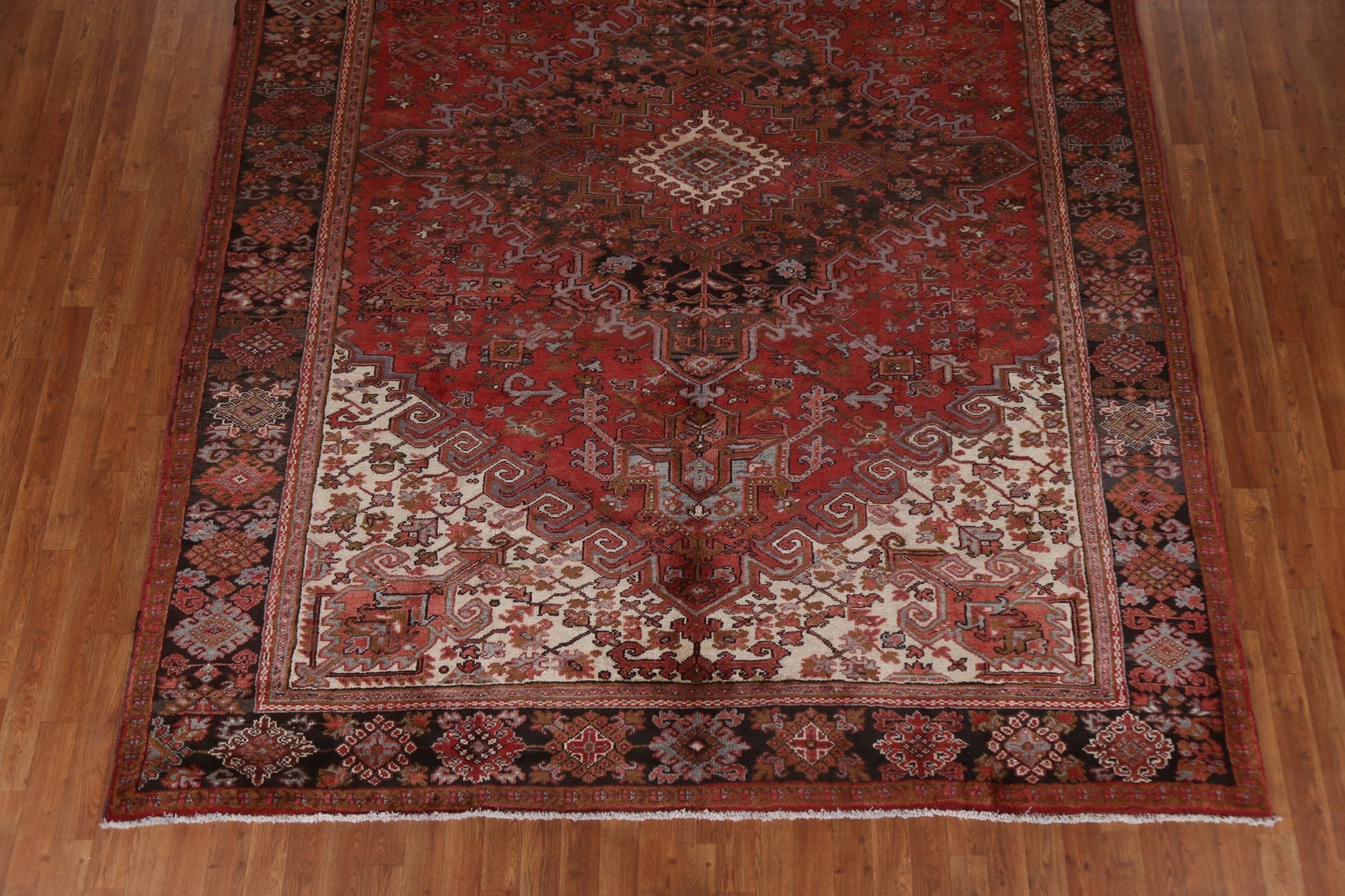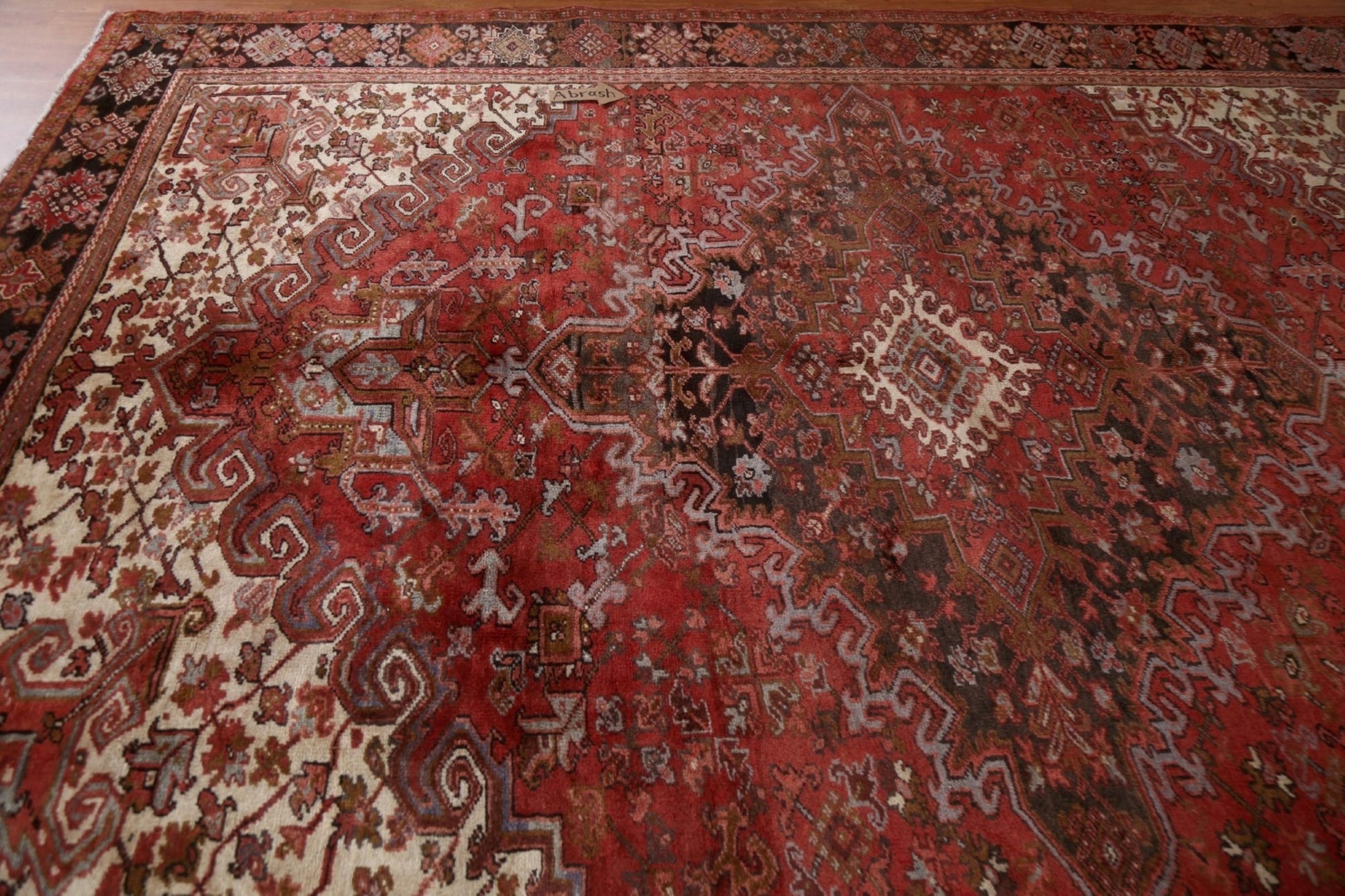 A Beautiful Genuine Persia ( Persia ) Heriz rug is Hand Knotted by skillful weavers in Persia ( Persia ) with 100% Wool Material. This rug is in Very Good (Abrash) condition. dimensions are 11' 1'' X 8' 5'' in foot and 338 X 257 in centimeter. the primary color is Red.