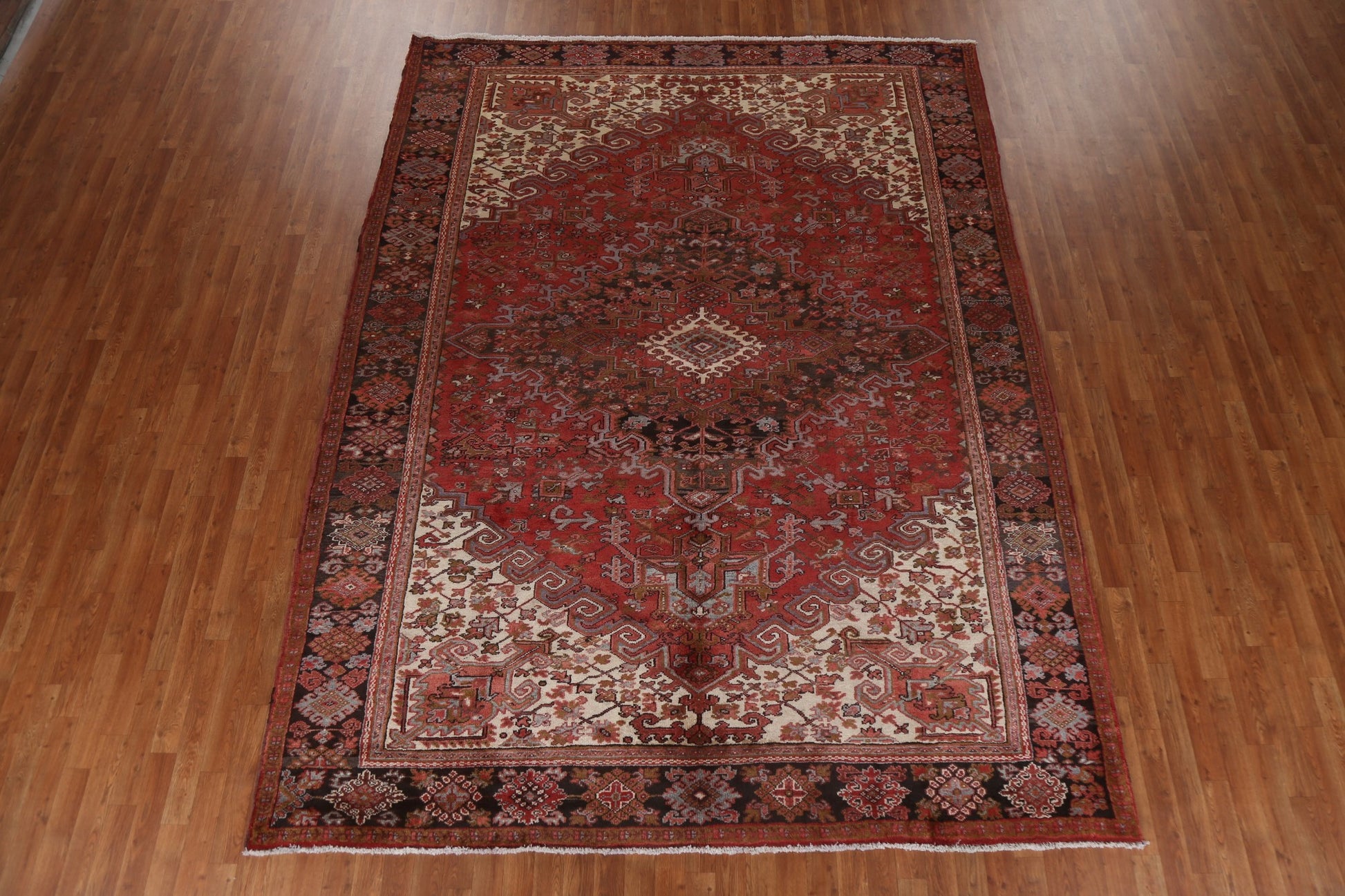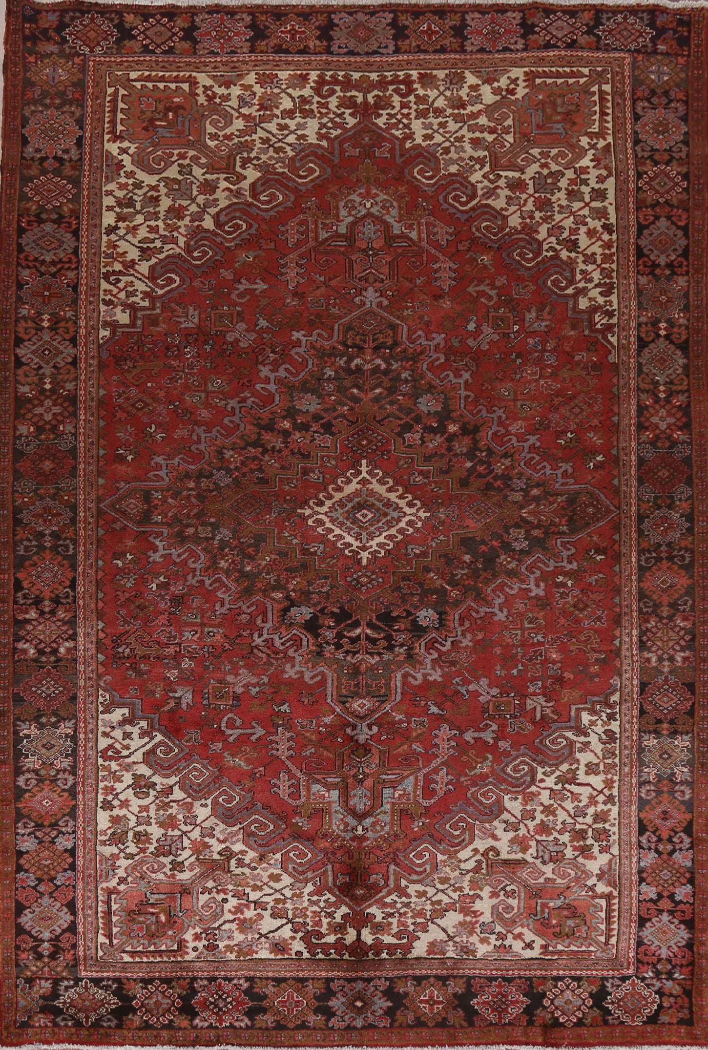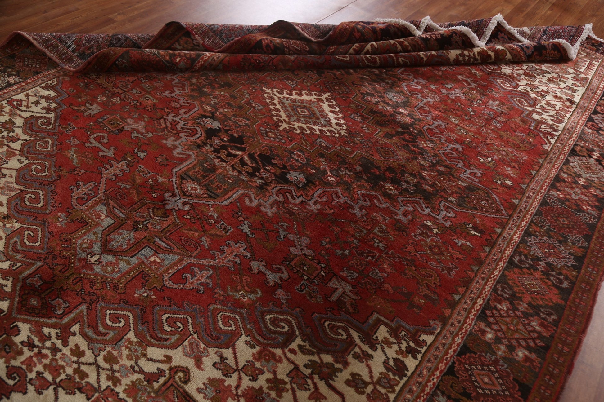 A Beautiful Genuine Persia ( Persia ) Heriz rug is Hand Knotted by skillful weavers in Persia ( Persia ) with 100% Wool Material. This rug is in Very Good (Abrash) condition. dimensions are 11' 1'' X 8' 5'' in foot and 338 X 257 in centimeter. the primary color is Red.