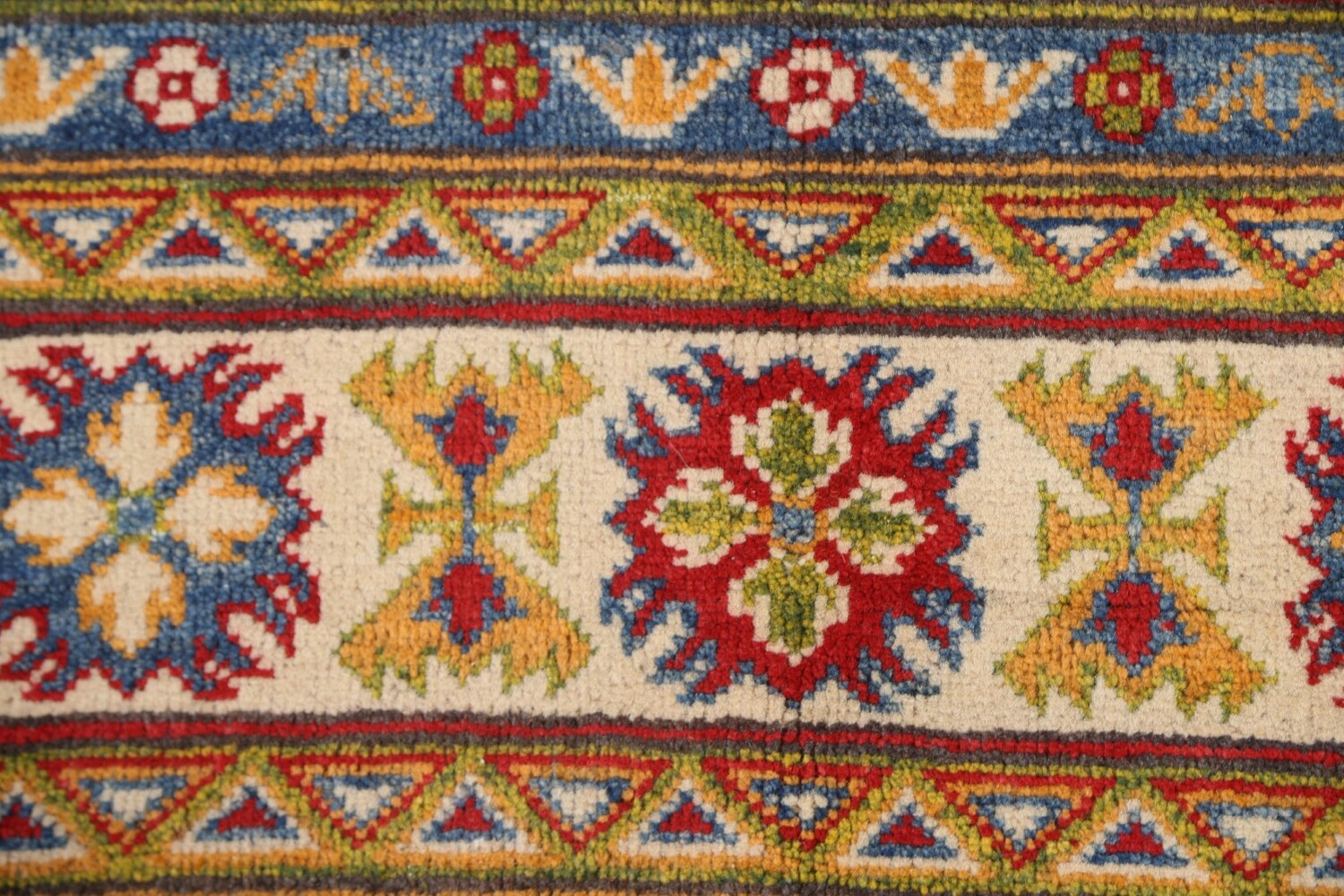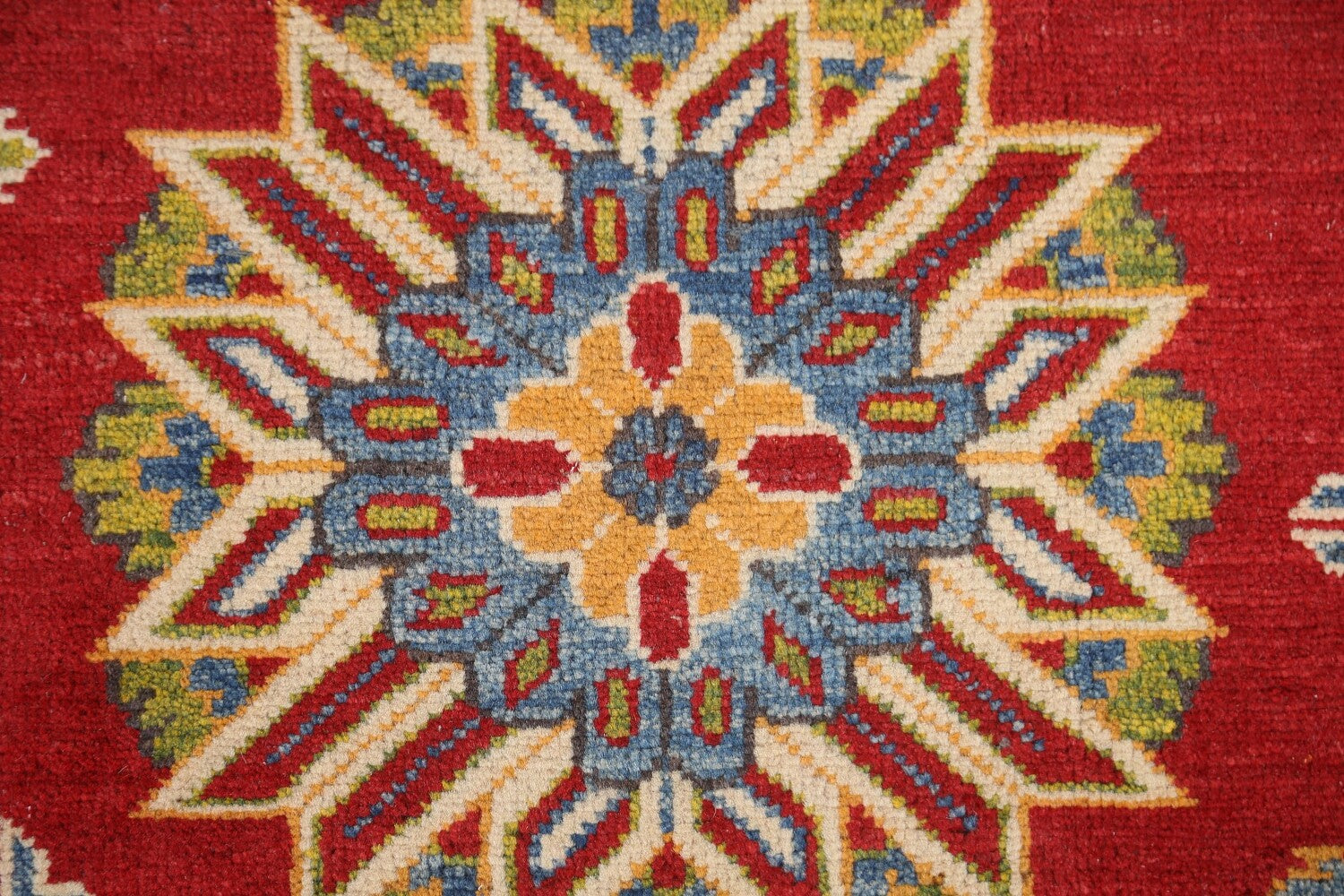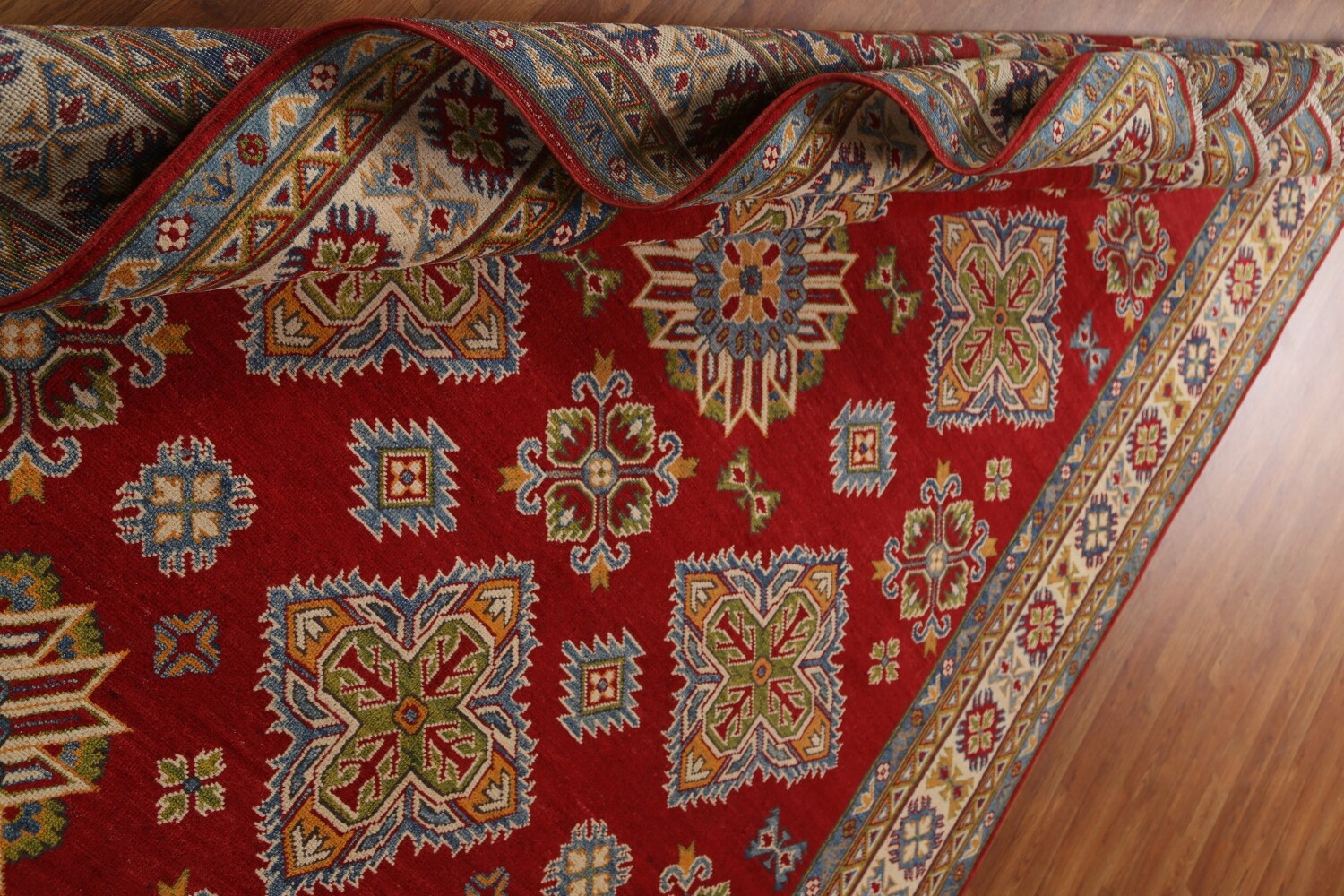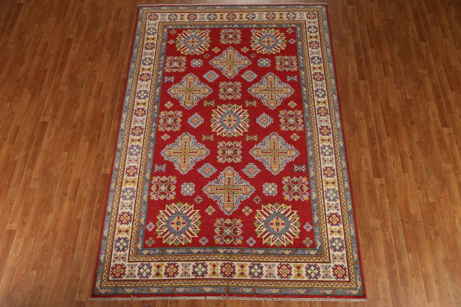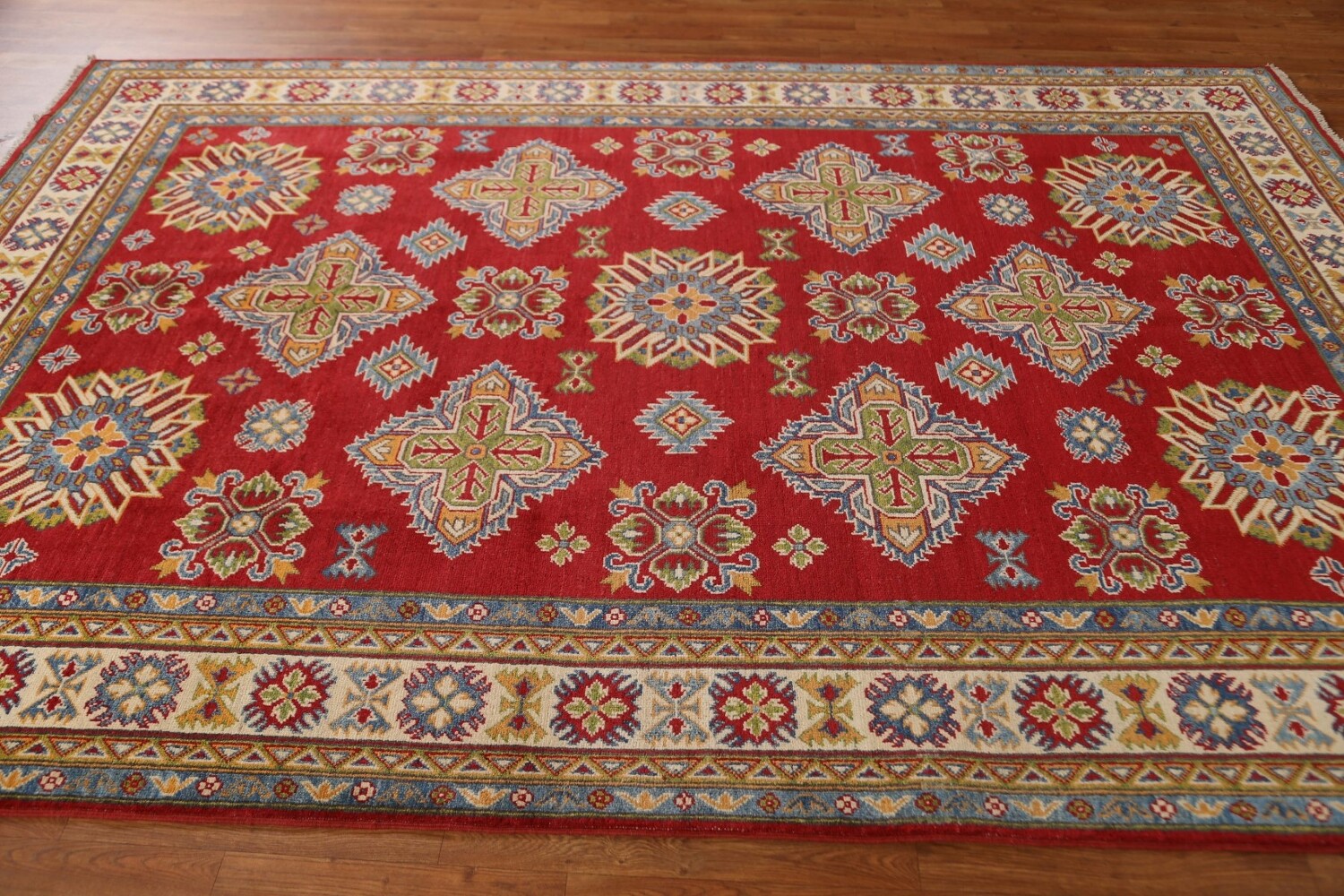 A Beautiful Genuine Pakistan Kazak rug is Hand Knotted by skillful weavers in Pakistan with 100% Wool Material. This rug is in New, First Quality condition. dimensions are 9' 8'' X 6' 7'' in foot and 295 X 201 in centimeter. the primary color is Red.