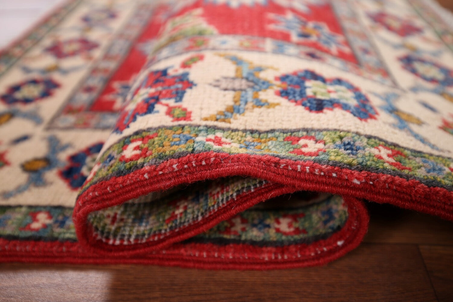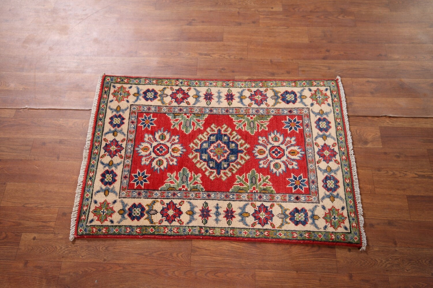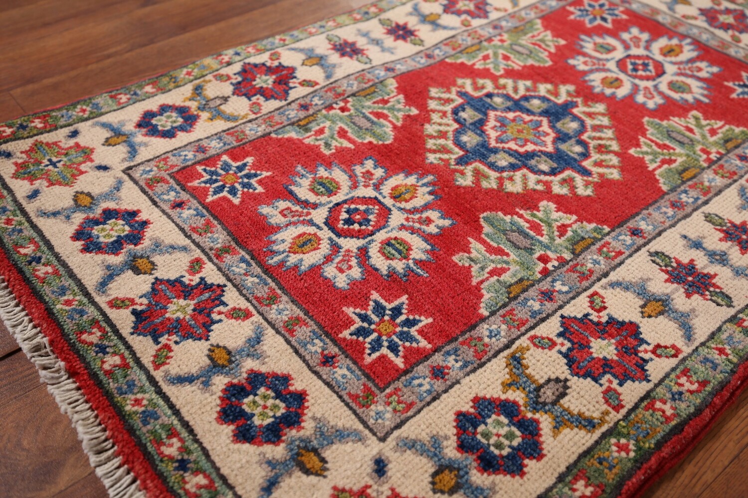 A Beautiful Genuine Pakistan Kazak rug is Hand Knotted by skillful weavers in Pakistan with 100% Wool Material. This rug is in New, First Quality condition. dimensions are 3' 0'' X 2' 0'' in foot and 91 X 61 in centimeter. the primary color is Red.