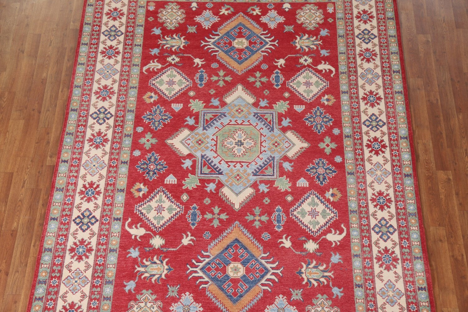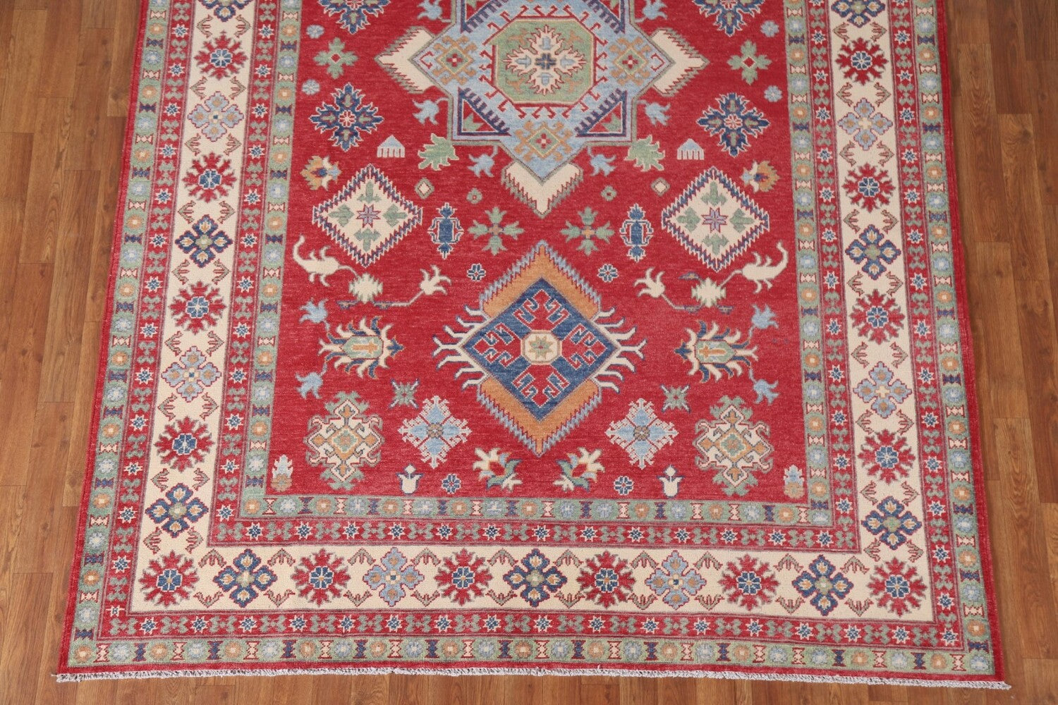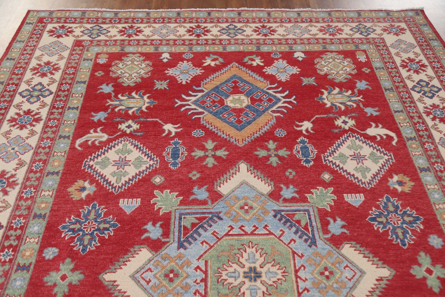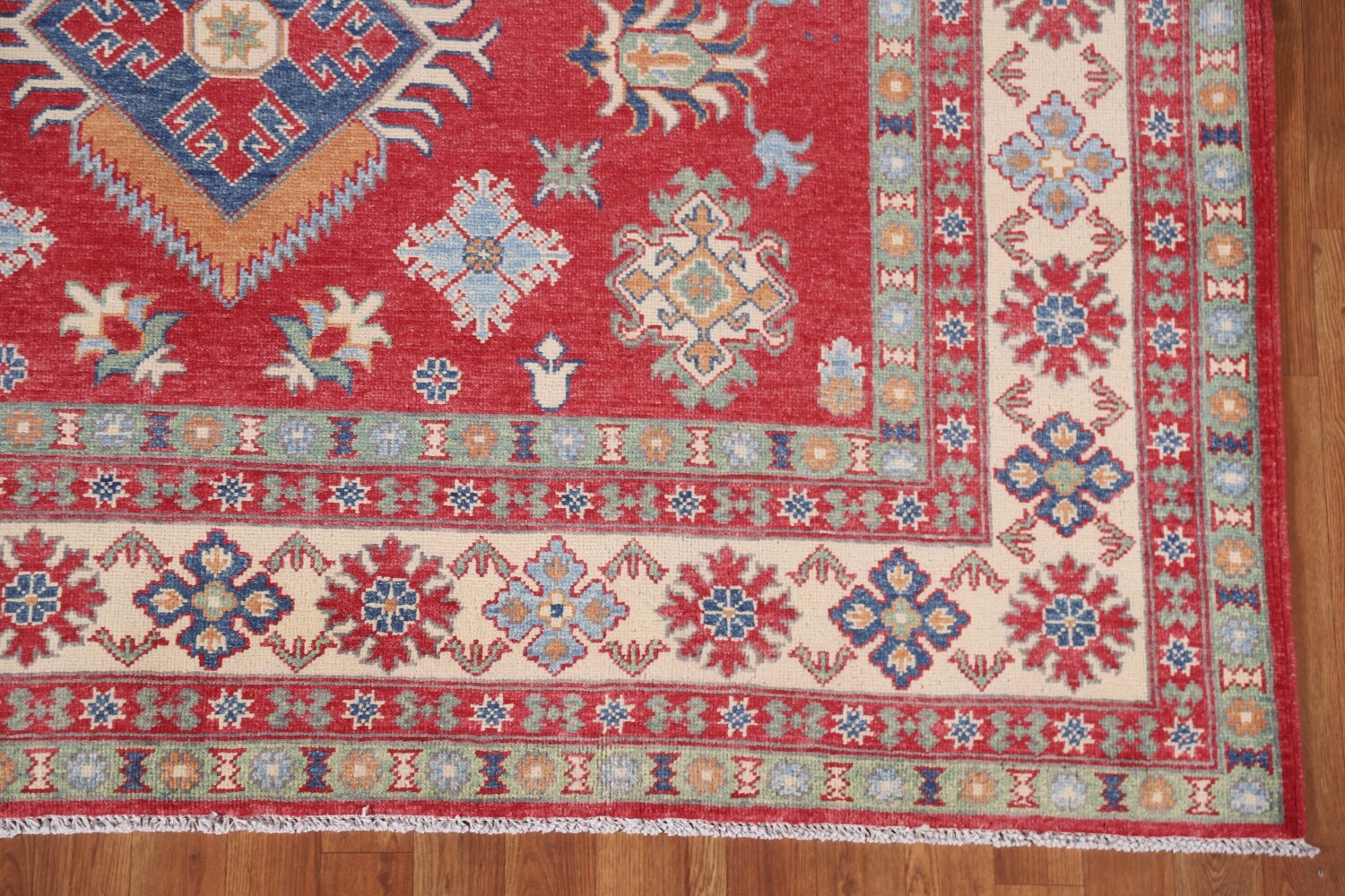 A Beautiful Genuine Pakistan Kazak rug is Hand Knotted by skillful weavers in Pakistan with 100% Wool Material. This rug is in New, First Quality condition. dimensions are 9' 9'' X 6' 8'' in foot and 297 X 203 in centimeter. the primary color is Red.