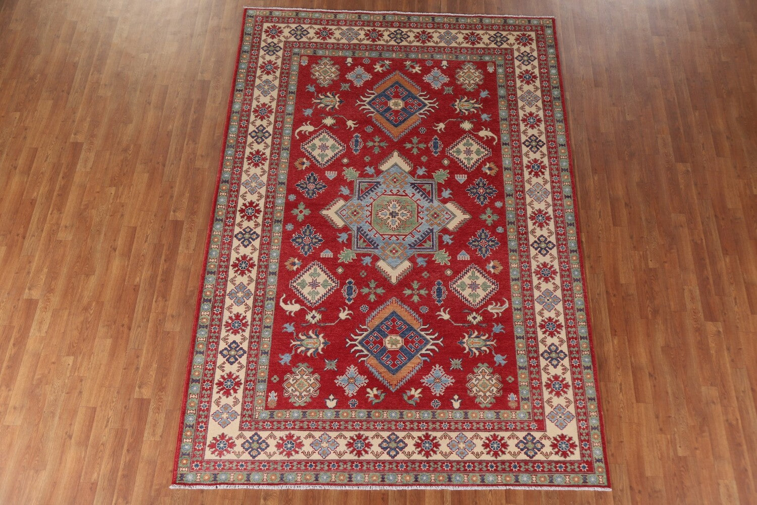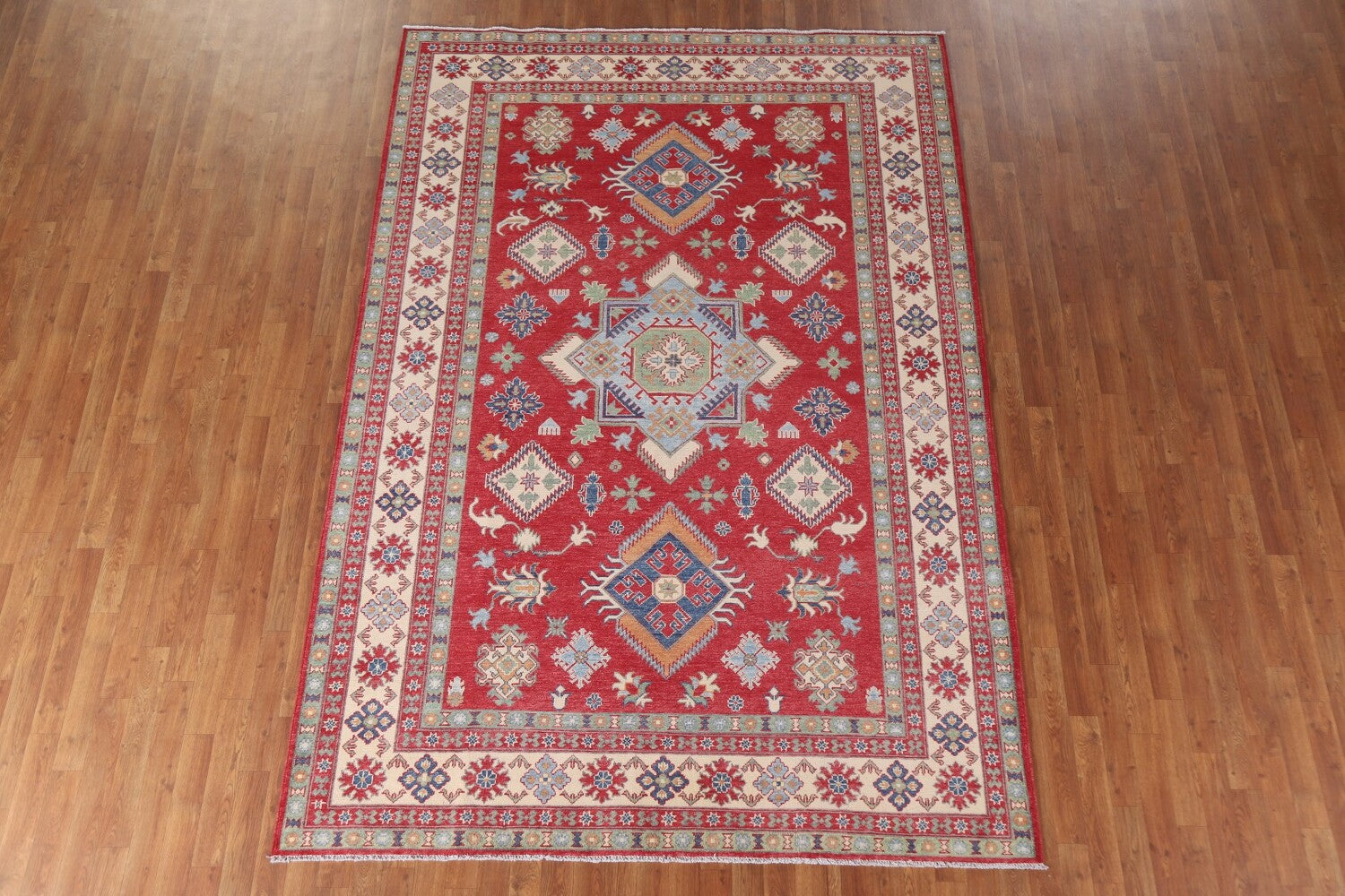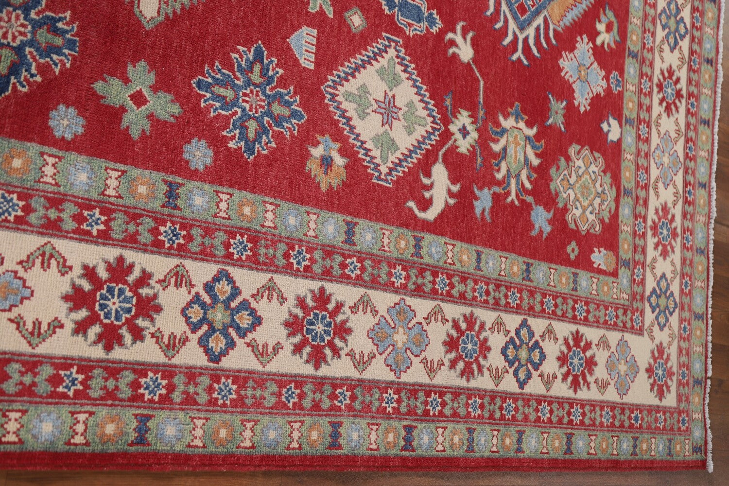 A Beautiful Genuine Pakistan Kazak rug is Hand Knotted by skillful weavers in Pakistan with 100% Wool Material. This rug is in New, First Quality condition. dimensions are 9' 9'' X 6' 8'' in foot and 297 X 203 in centimeter. the primary color is Red.