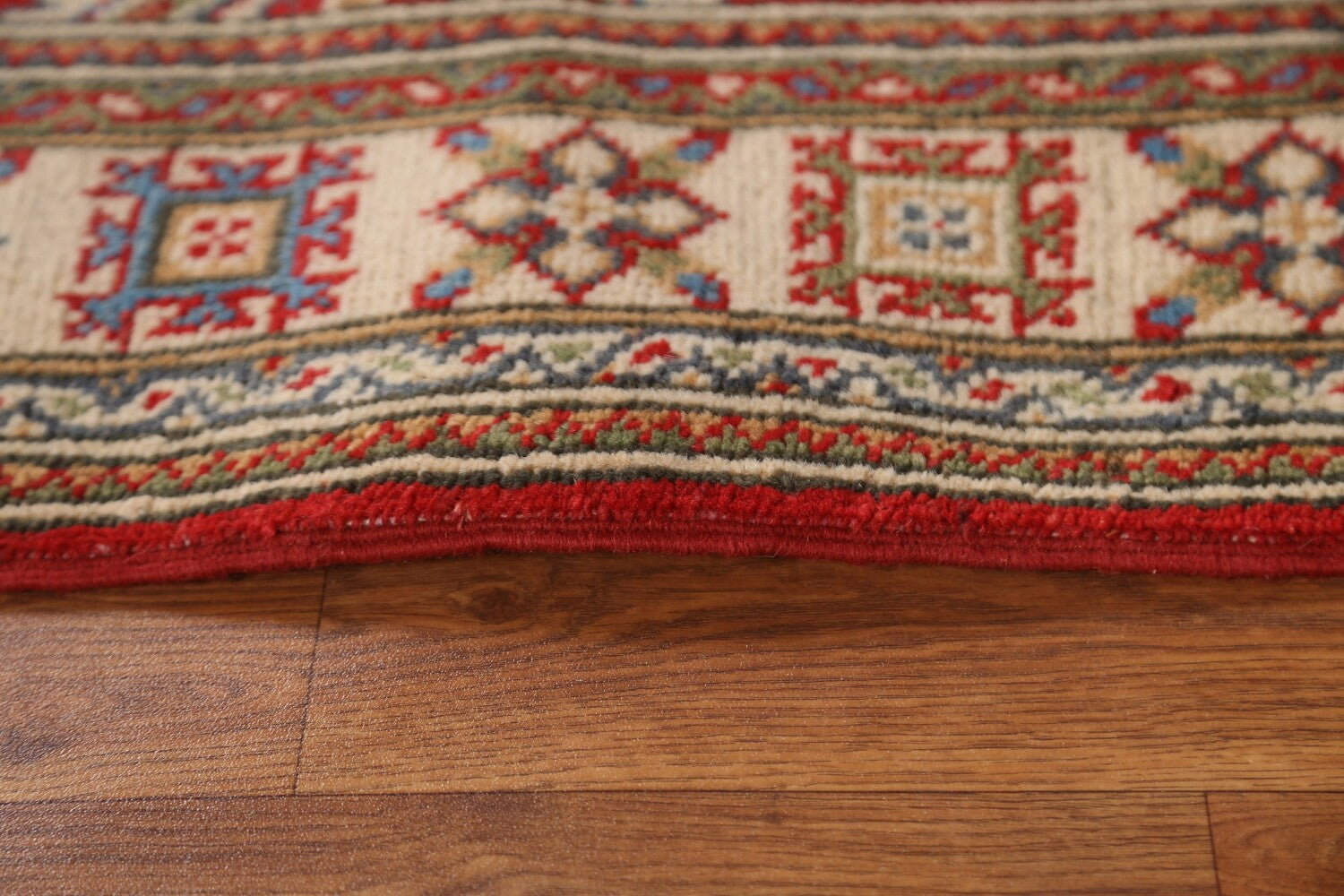 A Beautiful Genuine Pakistan Kazak rug is Hand Knotted by skillful weavers in Pakistan with 100% Wool Material. This rug is in New, First Quality condition. dimensions are 9' 6'' X 2' 6'' in foot and 290 X 76 in centimeter. the primary color is Red.