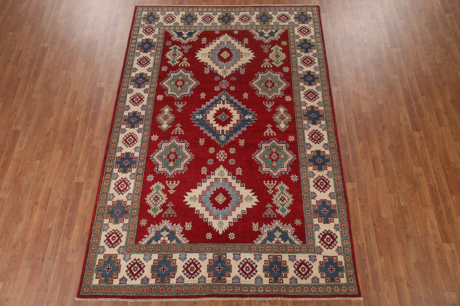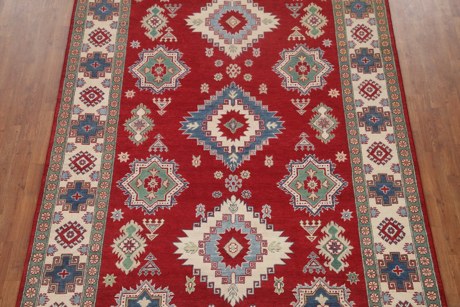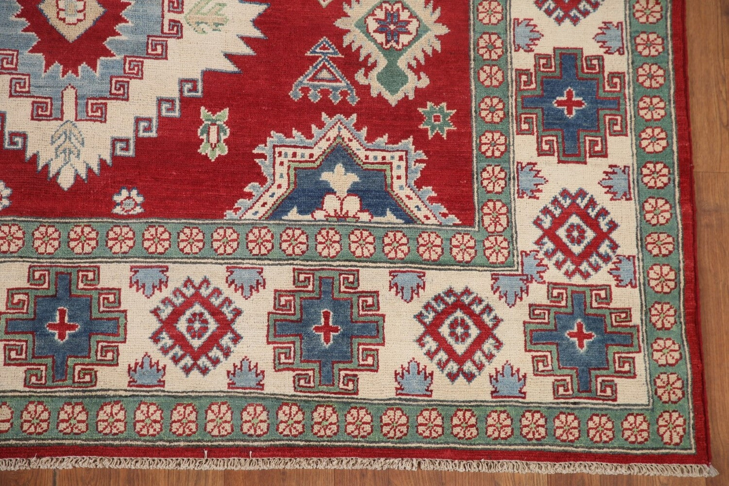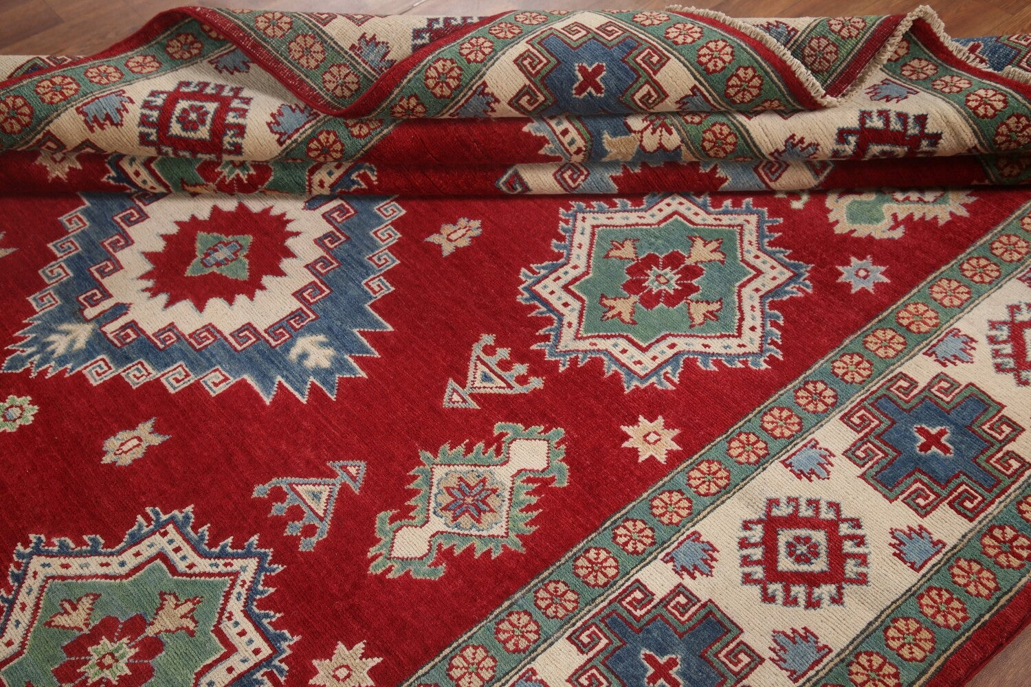 A Beautiful Genuine Pakistan Kazak rug is Hand Knotted by skillful weavers in Pakistan with 100% Wool Material. This rug is in New, First Quality condition. dimensions are 9' 10'' X 6' 8'' in foot and 300 X 203 in centimeter. the primary color is Red.