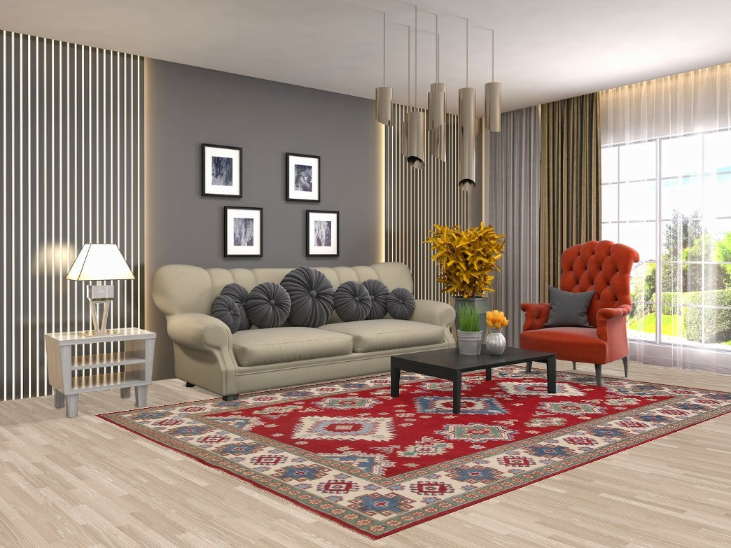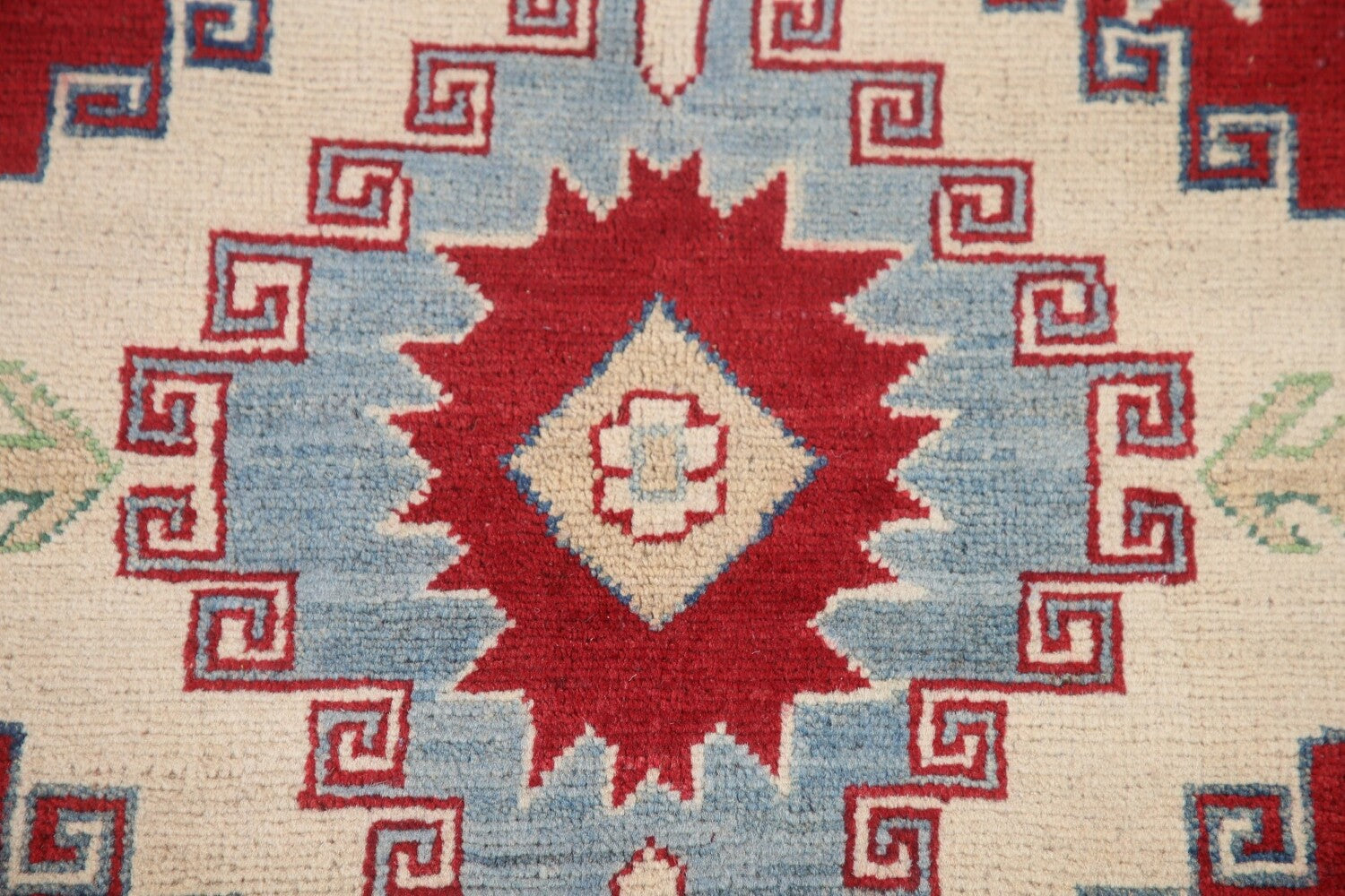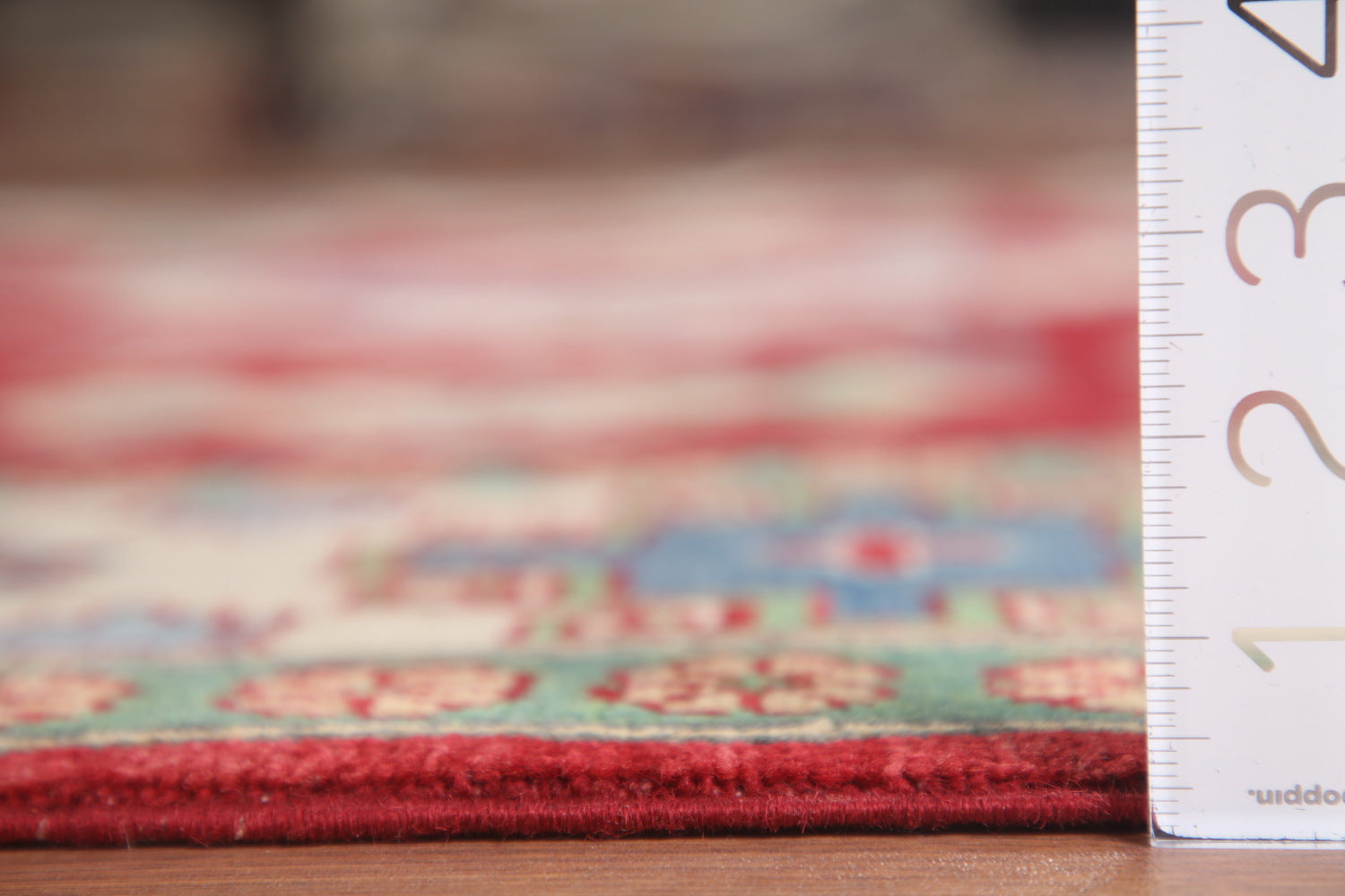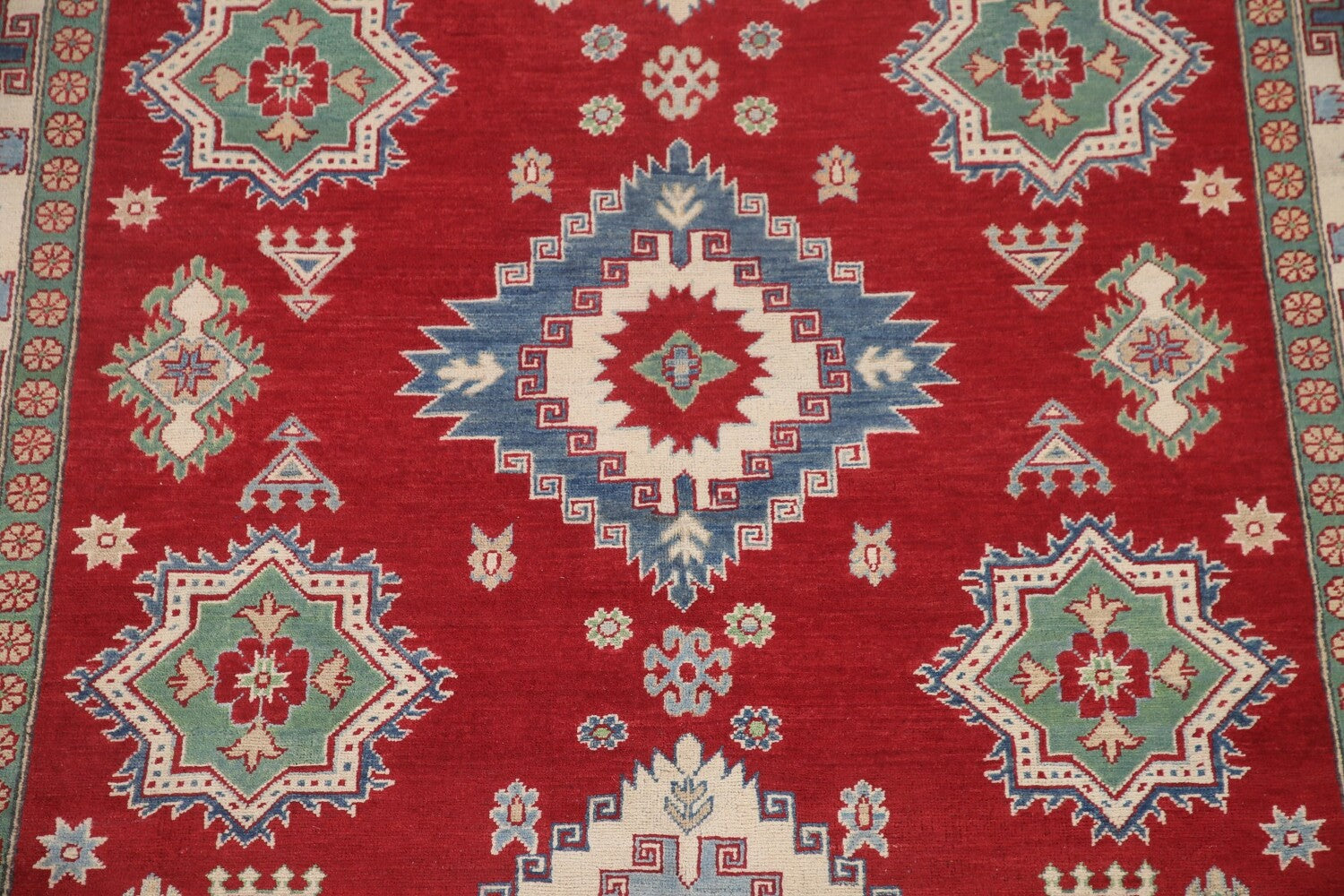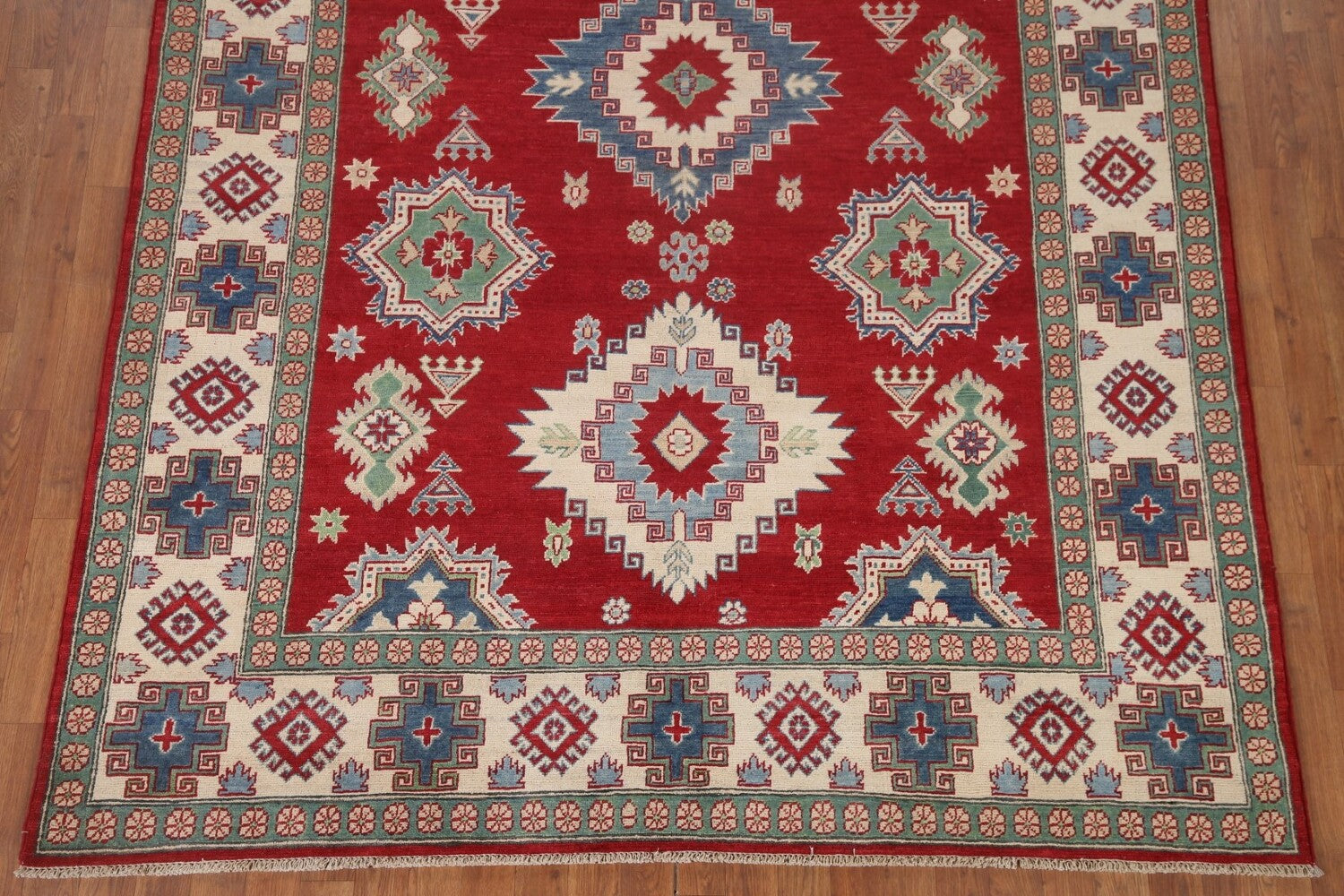 A Beautiful Genuine Pakistan Kazak rug is Hand Knotted by skillful weavers in Pakistan with 100% Wool Material. This rug is in New, First Quality condition. dimensions are 9' 10'' X 6' 8'' in foot and 300 X 203 in centimeter. the primary color is Red.