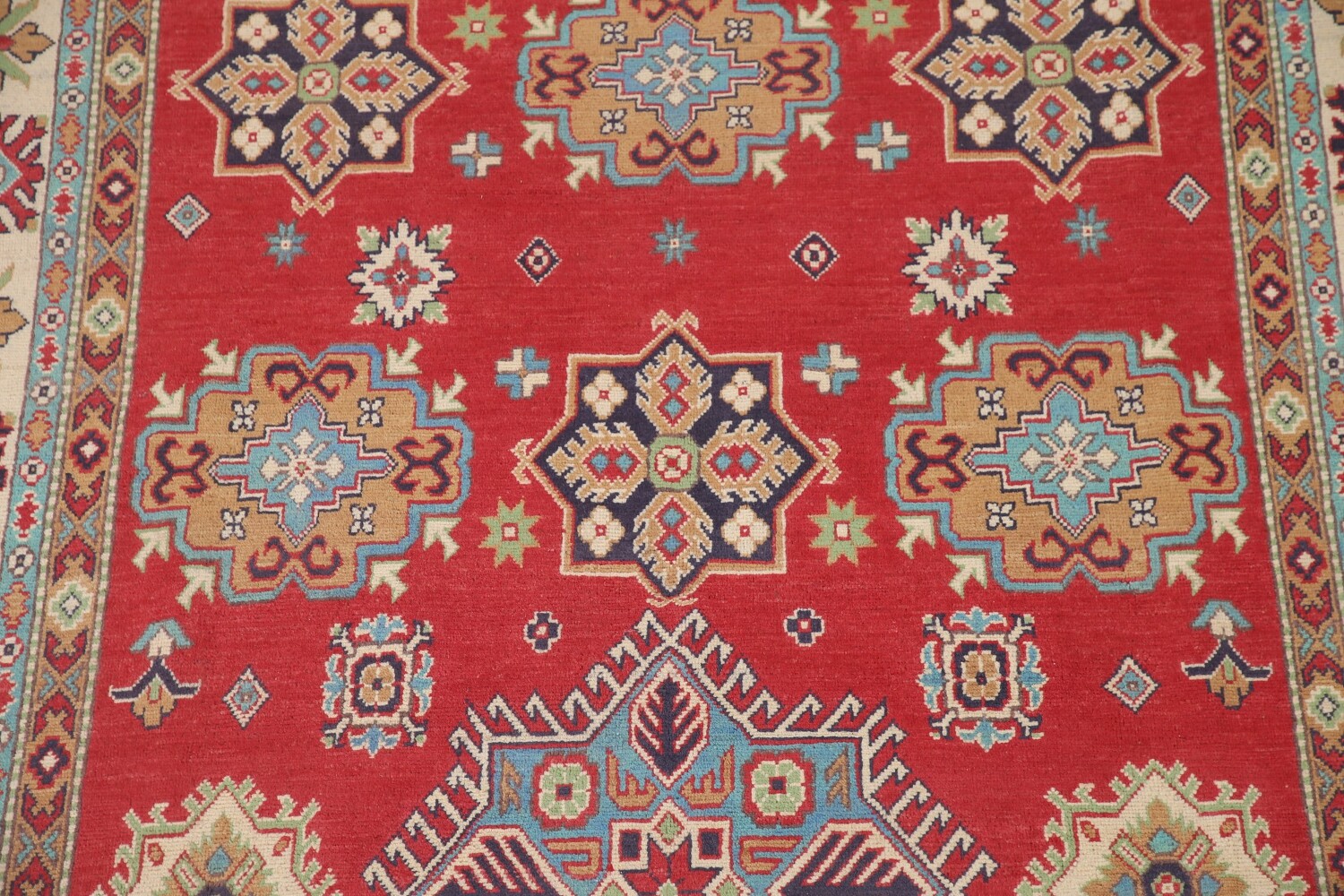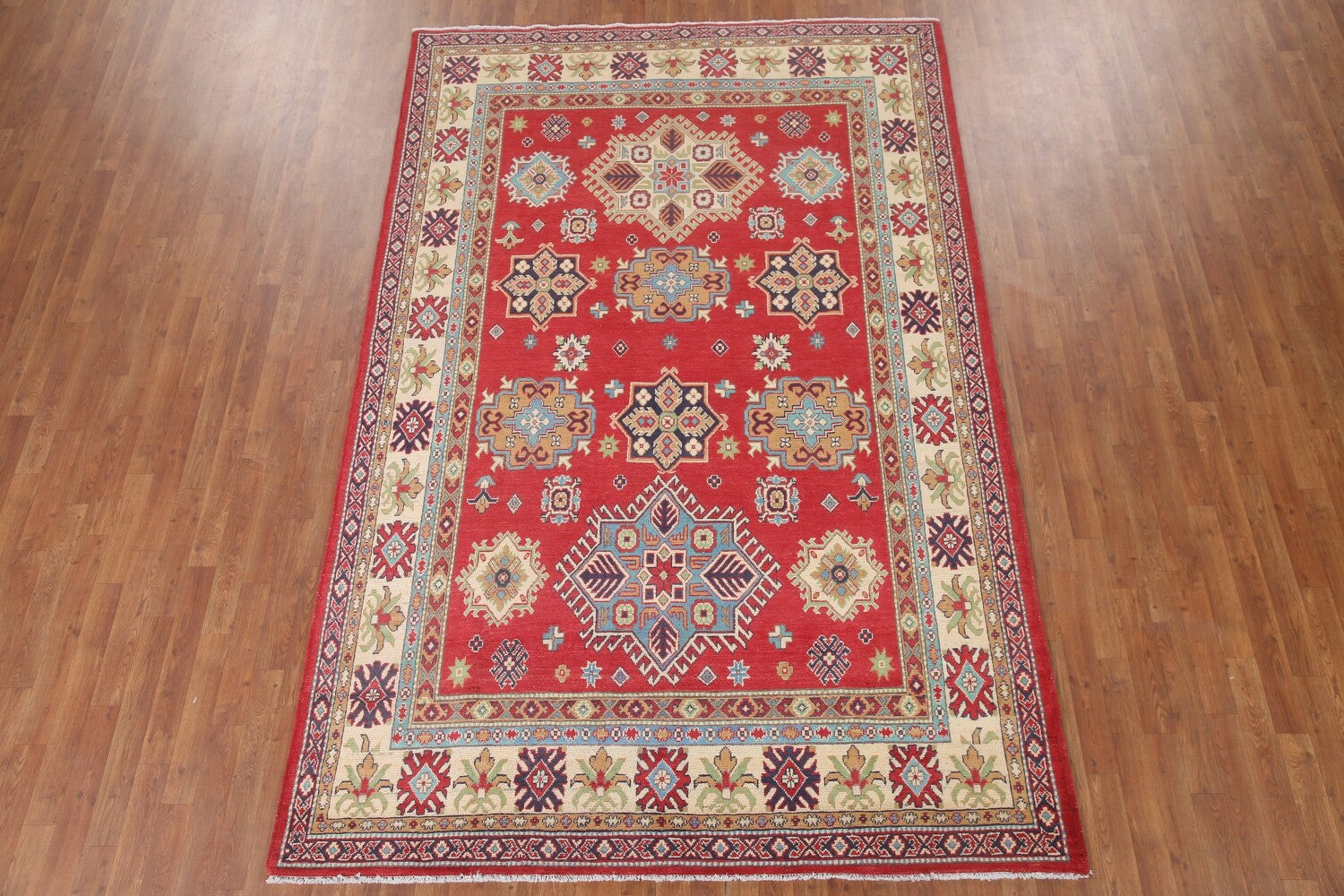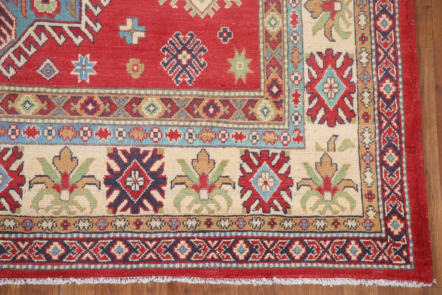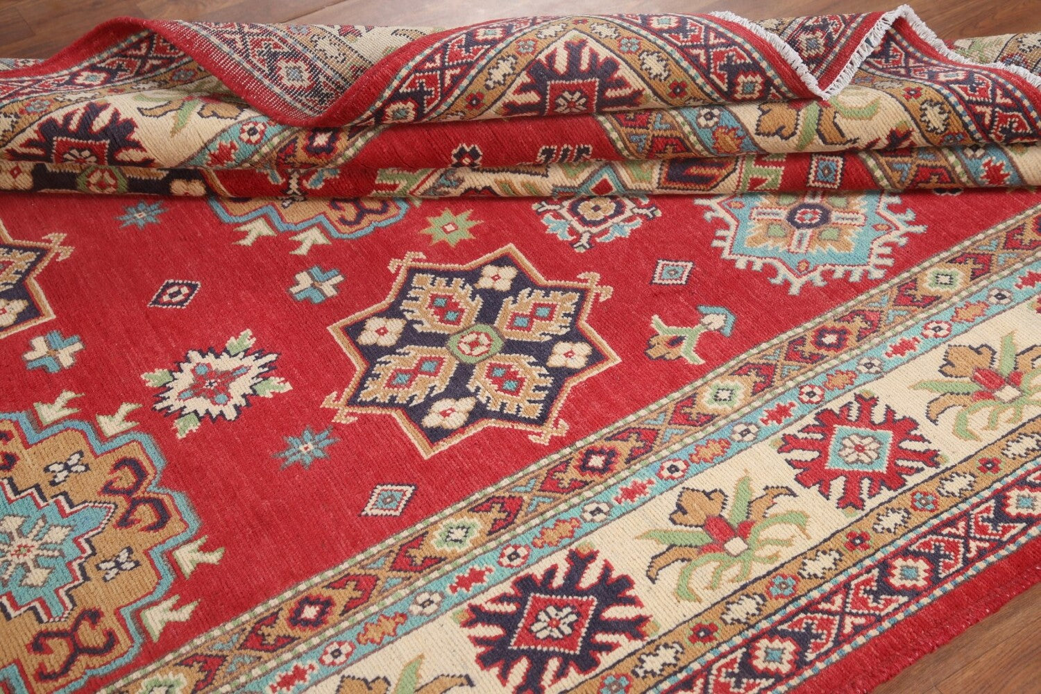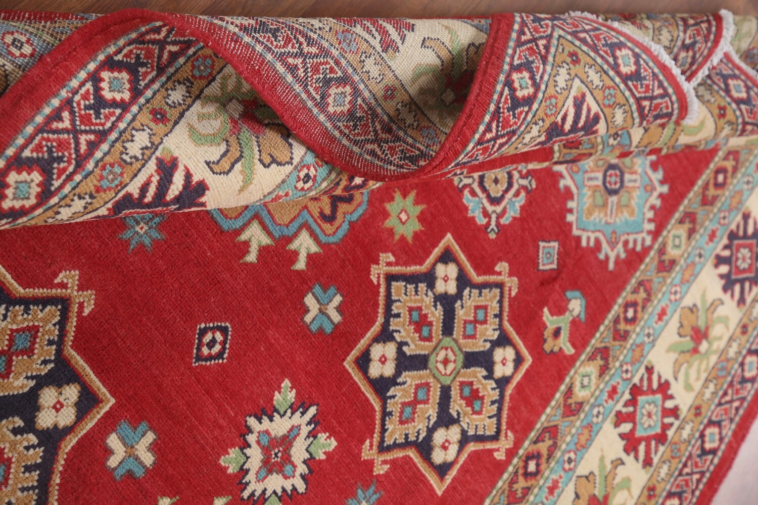 A Beautiful Genuine Pakistan Kazak rug is Hand Knotted by skillful weavers in Pakistan with 100% Wool Material. This rug is in New, First Quality condition. dimensions are 9' 11'' X 6' 6'' in foot and 302 X 198 in centimeter. the primary color is Red.