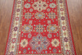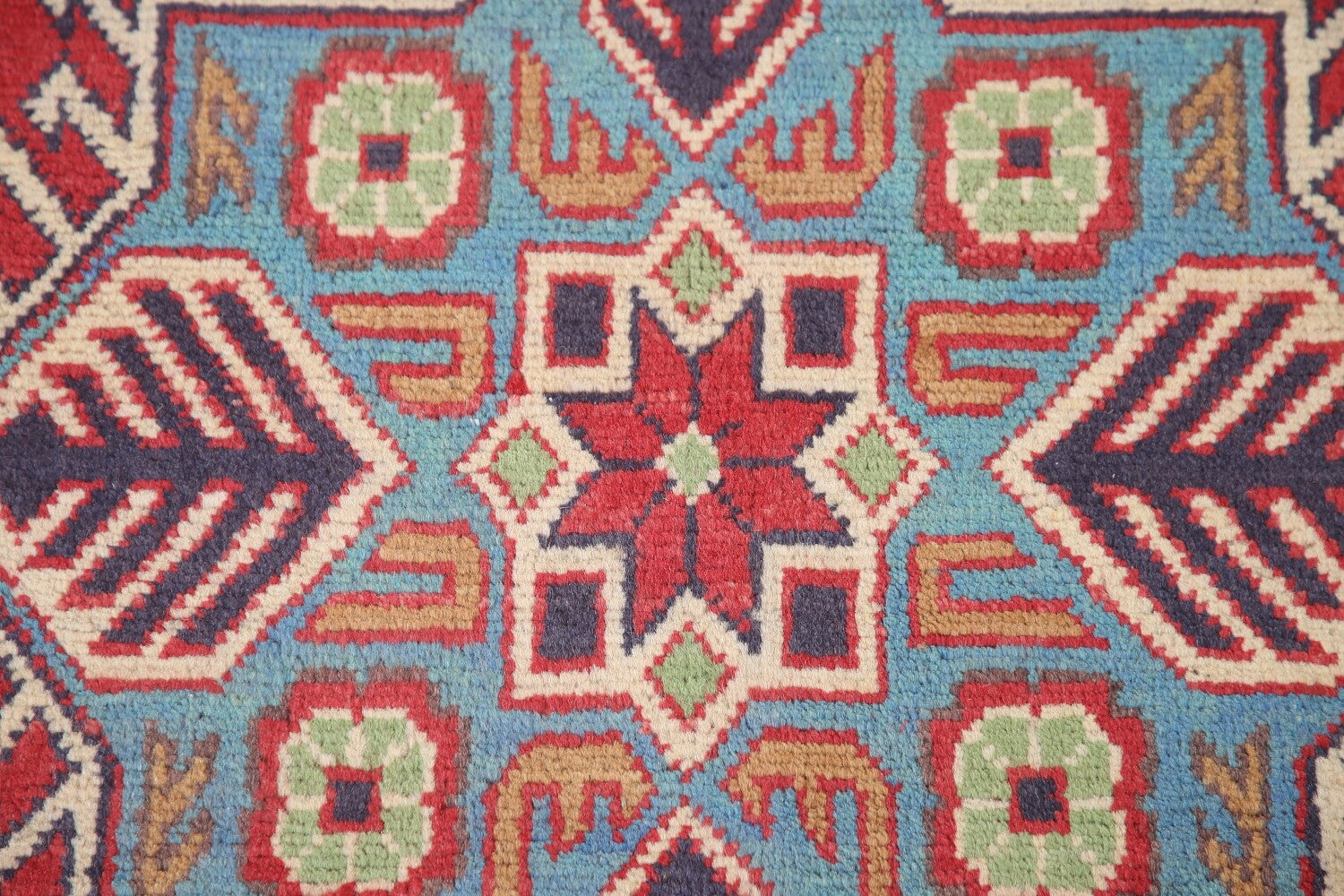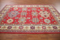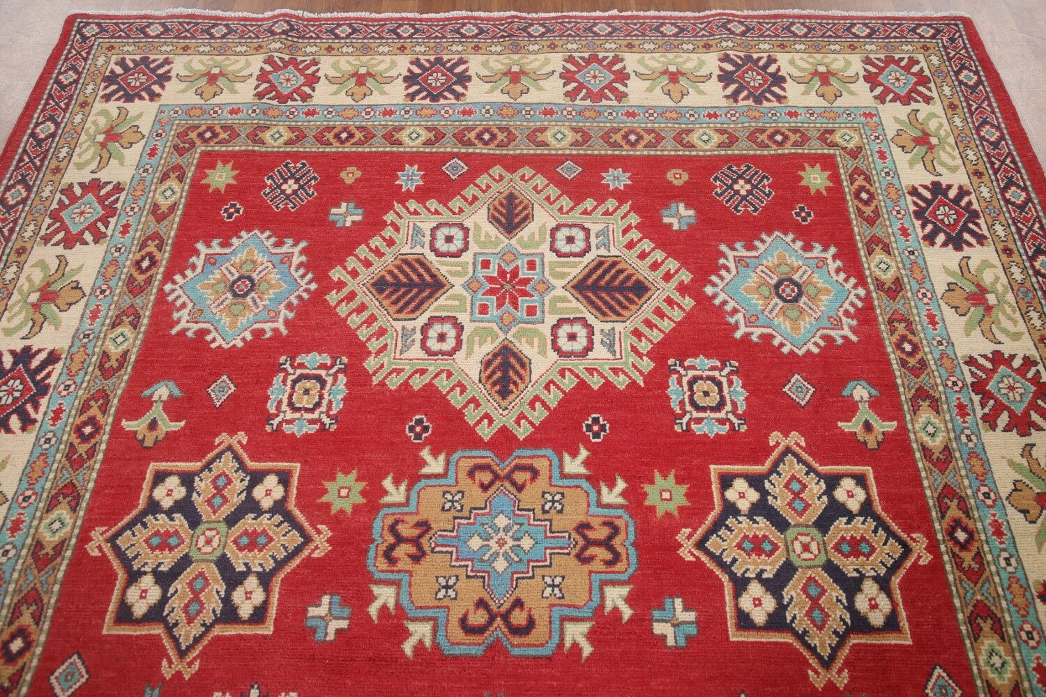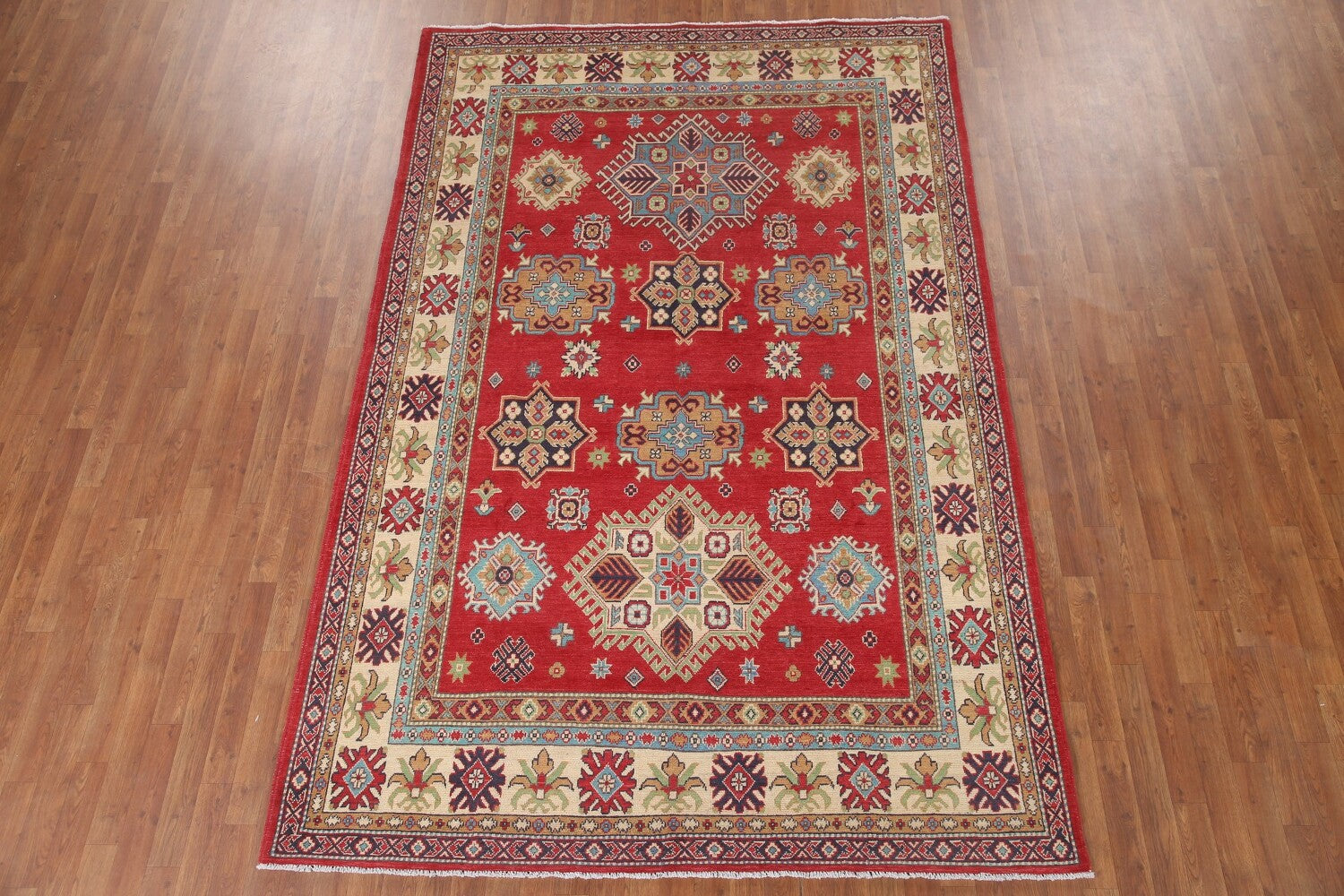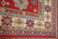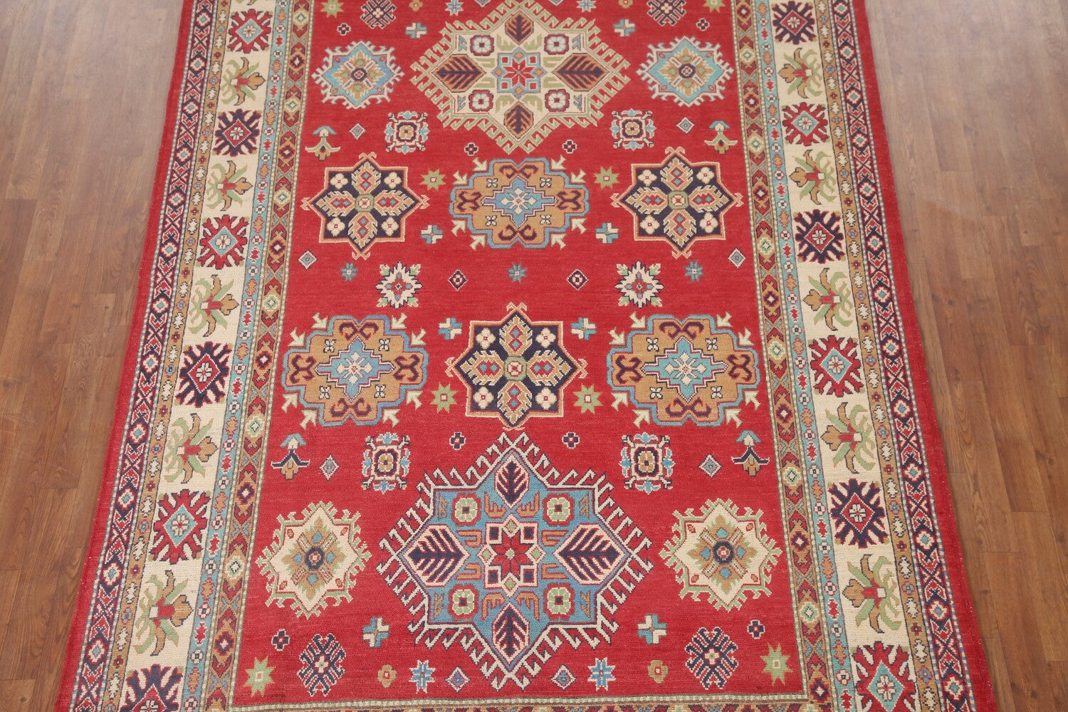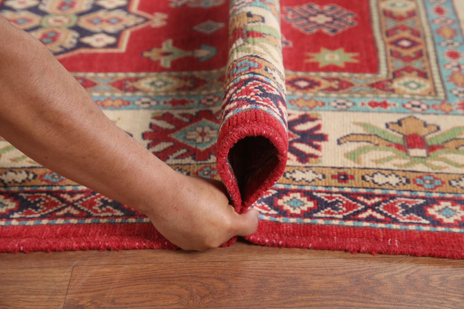 A Beautiful Genuine Pakistan Kazak rug is Hand Knotted by skillful weavers in Pakistan with 100% Wool Material. This rug is in New, First Quality condition. dimensions are 9' 11'' X 6' 6'' in foot and 302 X 198 in centimeter. the primary color is Red.