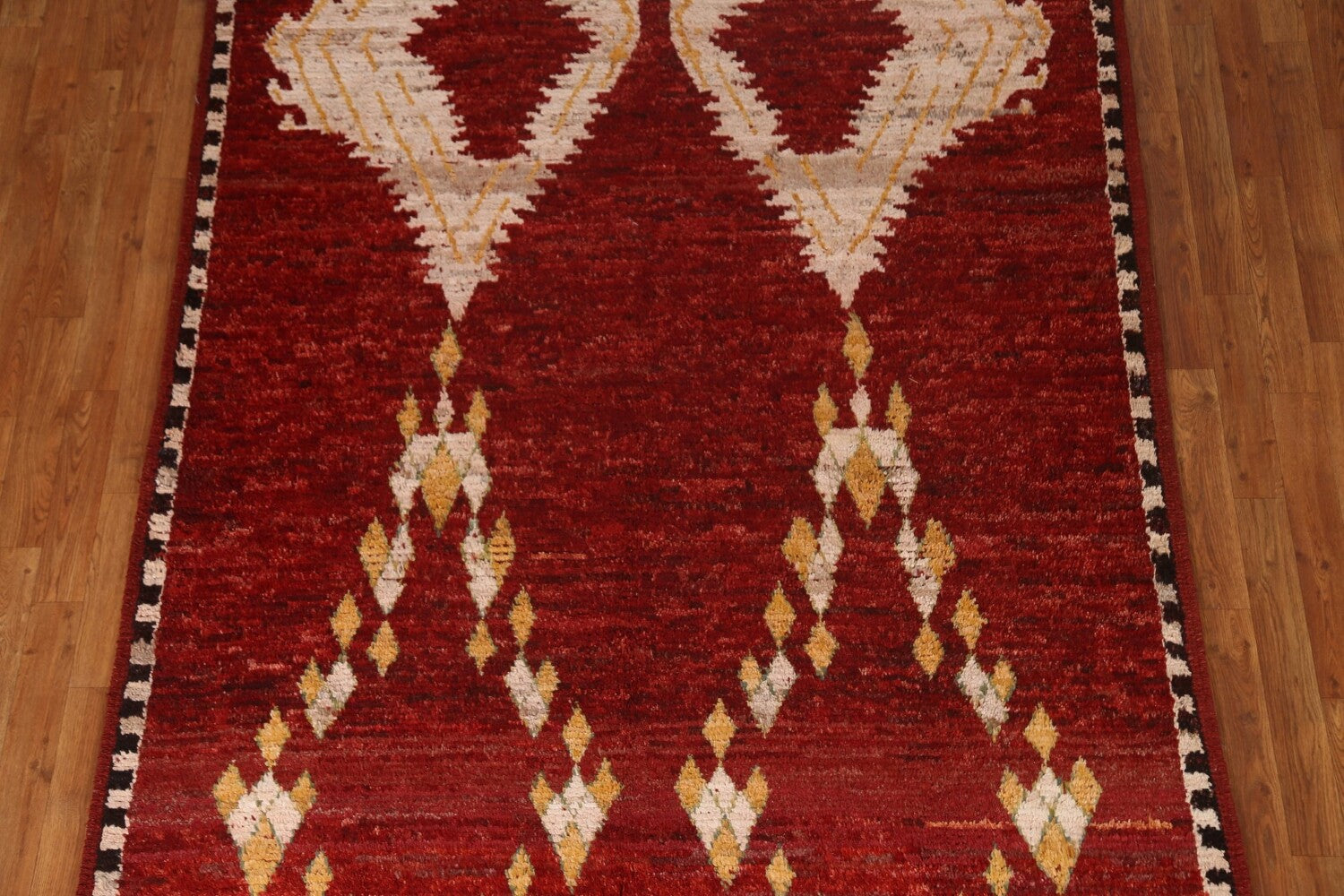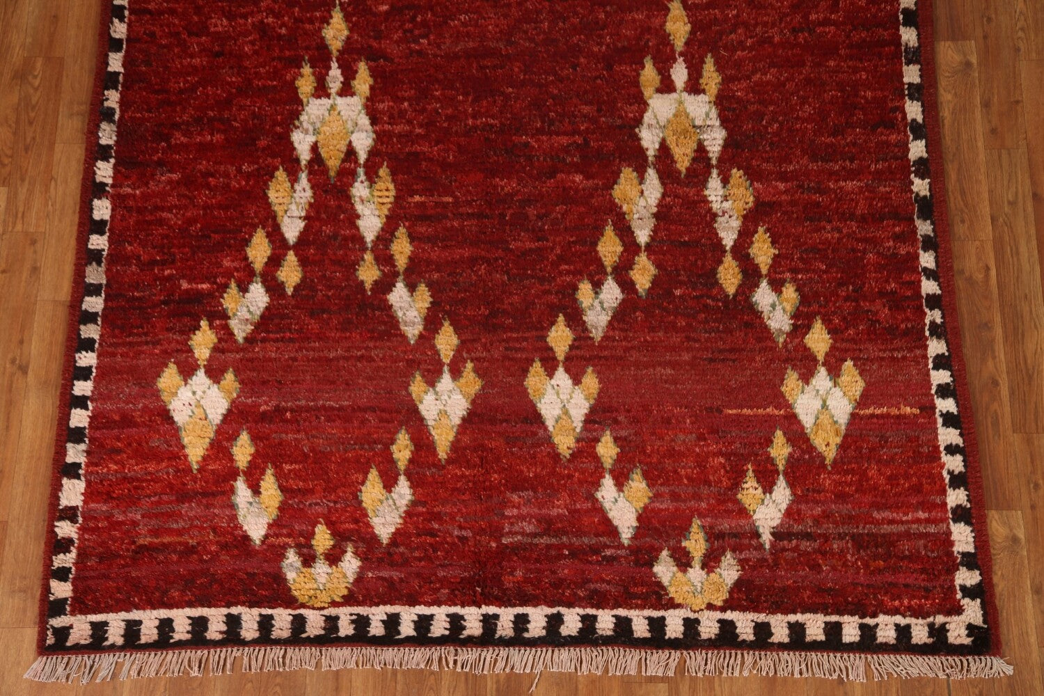 A Beautiful Genuine Pakistan Moroccan rug is Hand Knotted by skillful weavers in Pakistan with 100% Wool Material. This rug is in condition. dimensions are 7' 11'' X 5' 9'' in foot and 241 X 175 in centimeter. the primary color is Red.