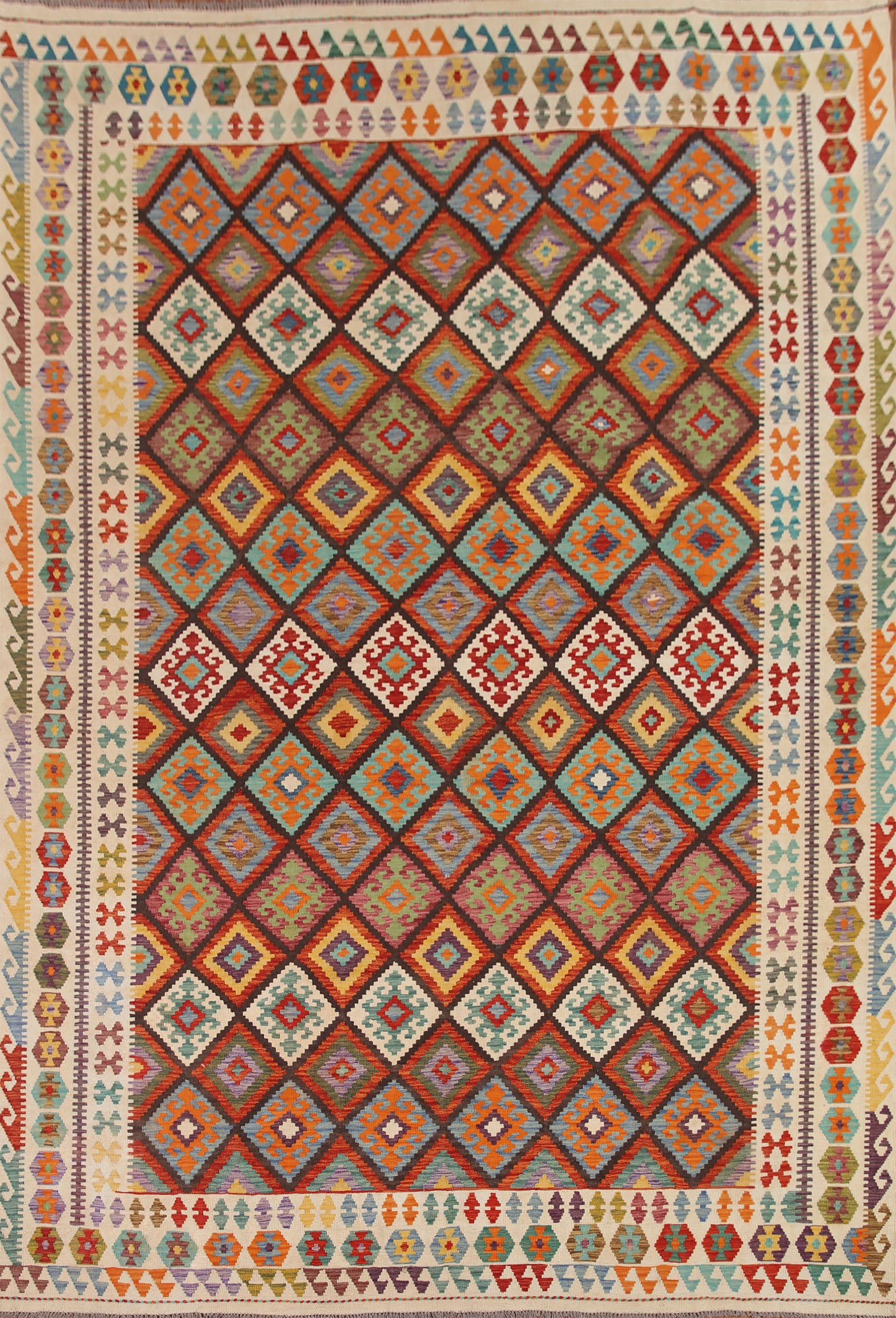 A Beautiful Genuine Pakistan Kilim rug is Hand Woven by skillful weavers in Pakistan with 100% Wool Material. This rug is in New, First Quality condition. dimensions are 12' 7'' X 10' 0'' in foot and 384 X 305 in centimeter. the primary color is Multi-Colored.