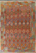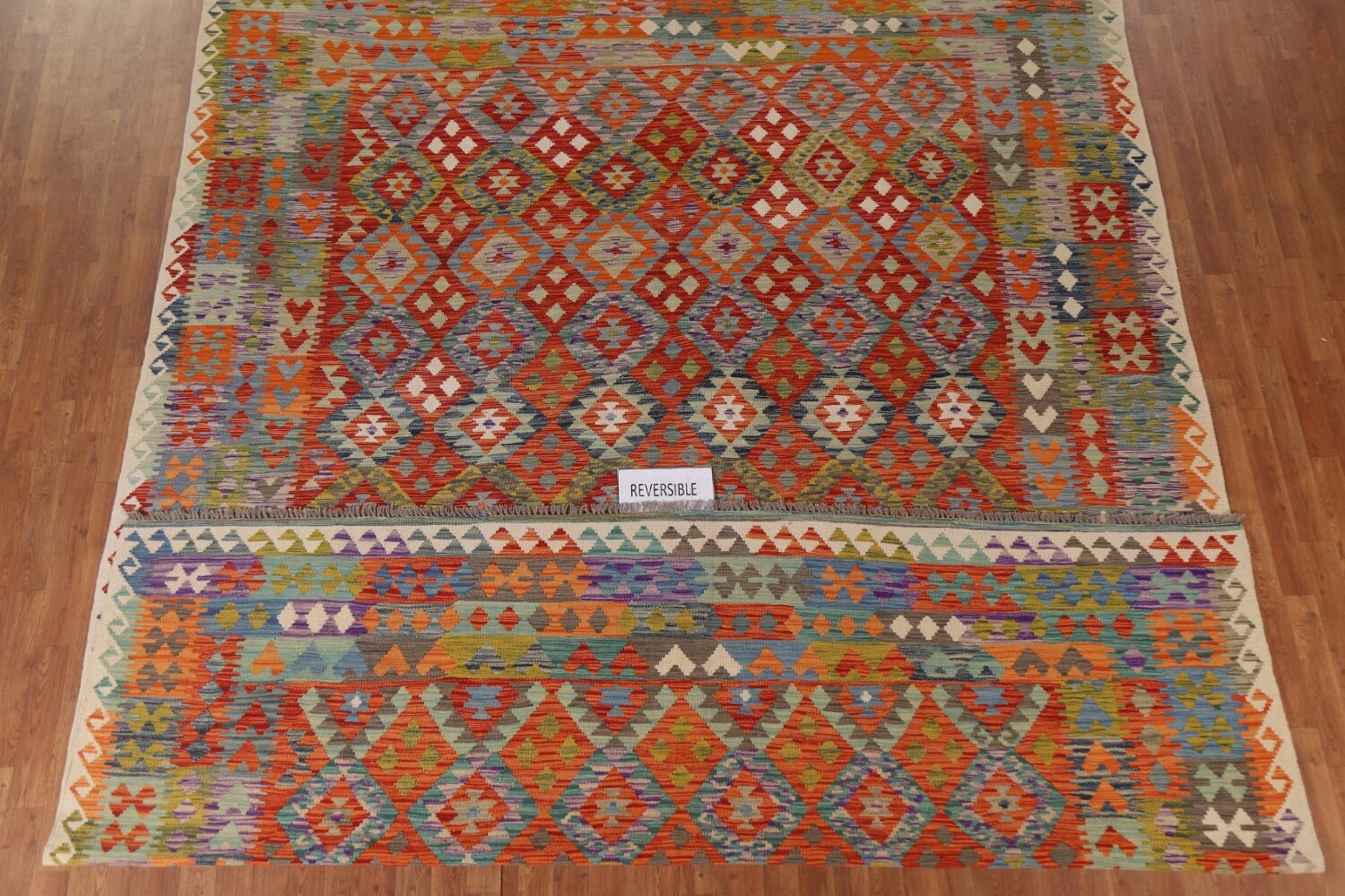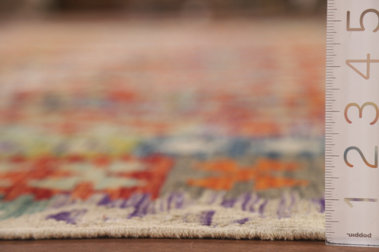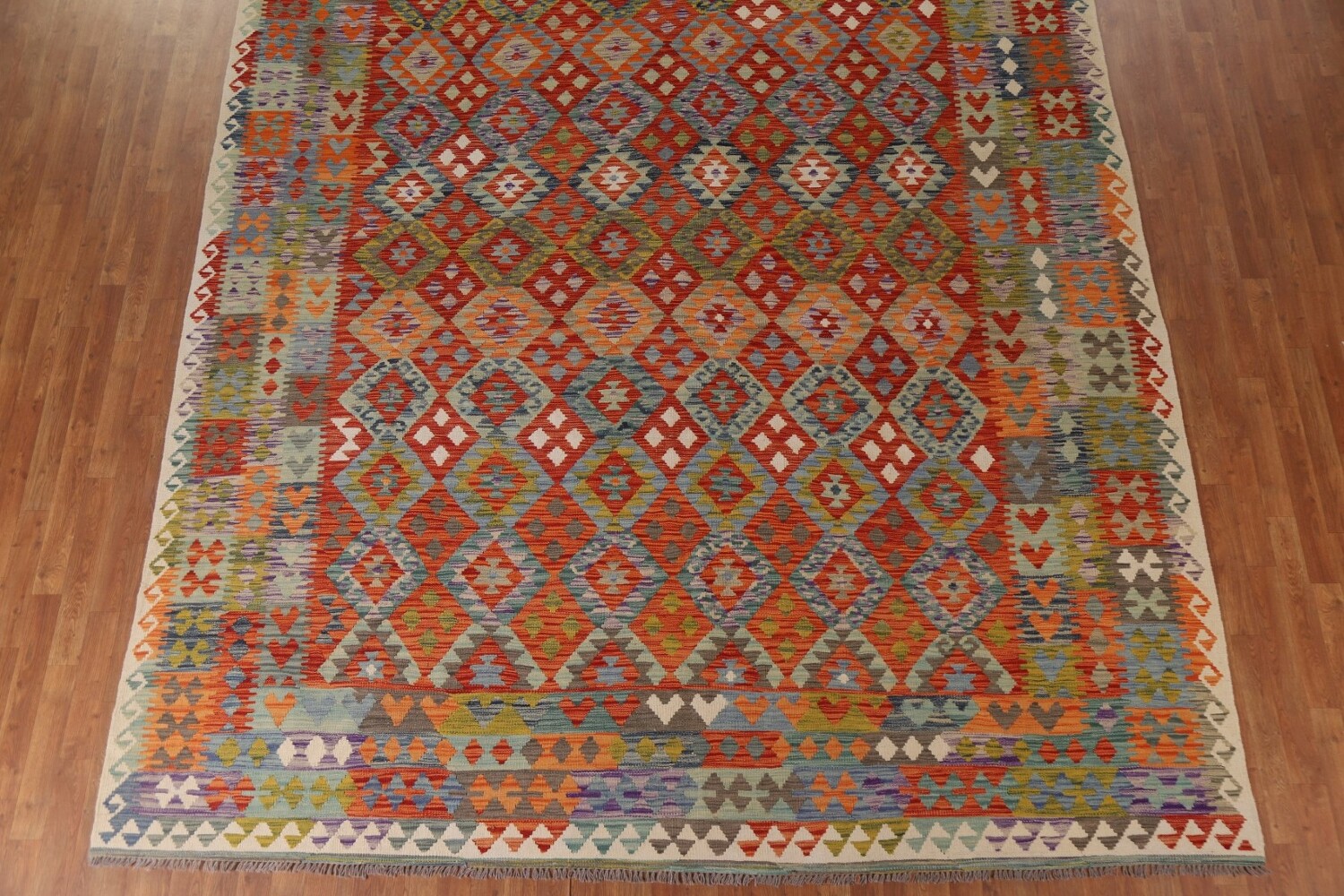 A Beautiful Genuine Pakistan Kilim rug is Hand Woven by skillful weavers in Pakistan with 100% Wool Material. This rug is in New, First Quality condition. dimensions are 12' 8'' X 9' 7'' in foot and 386 X 292 in centimeter. the primary color is Multi-Colored.