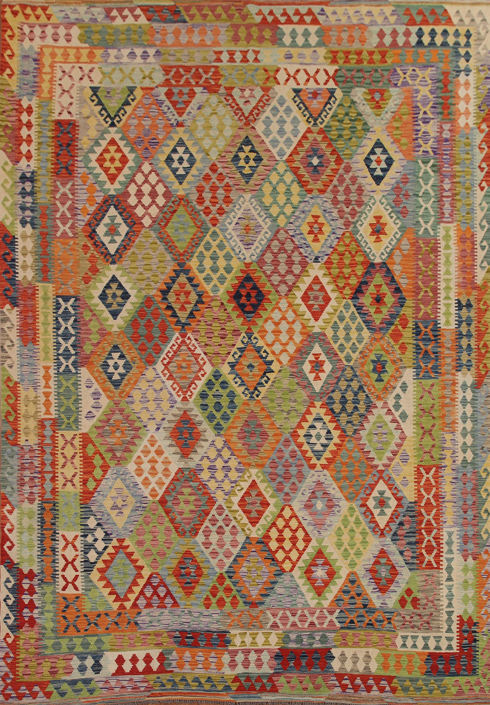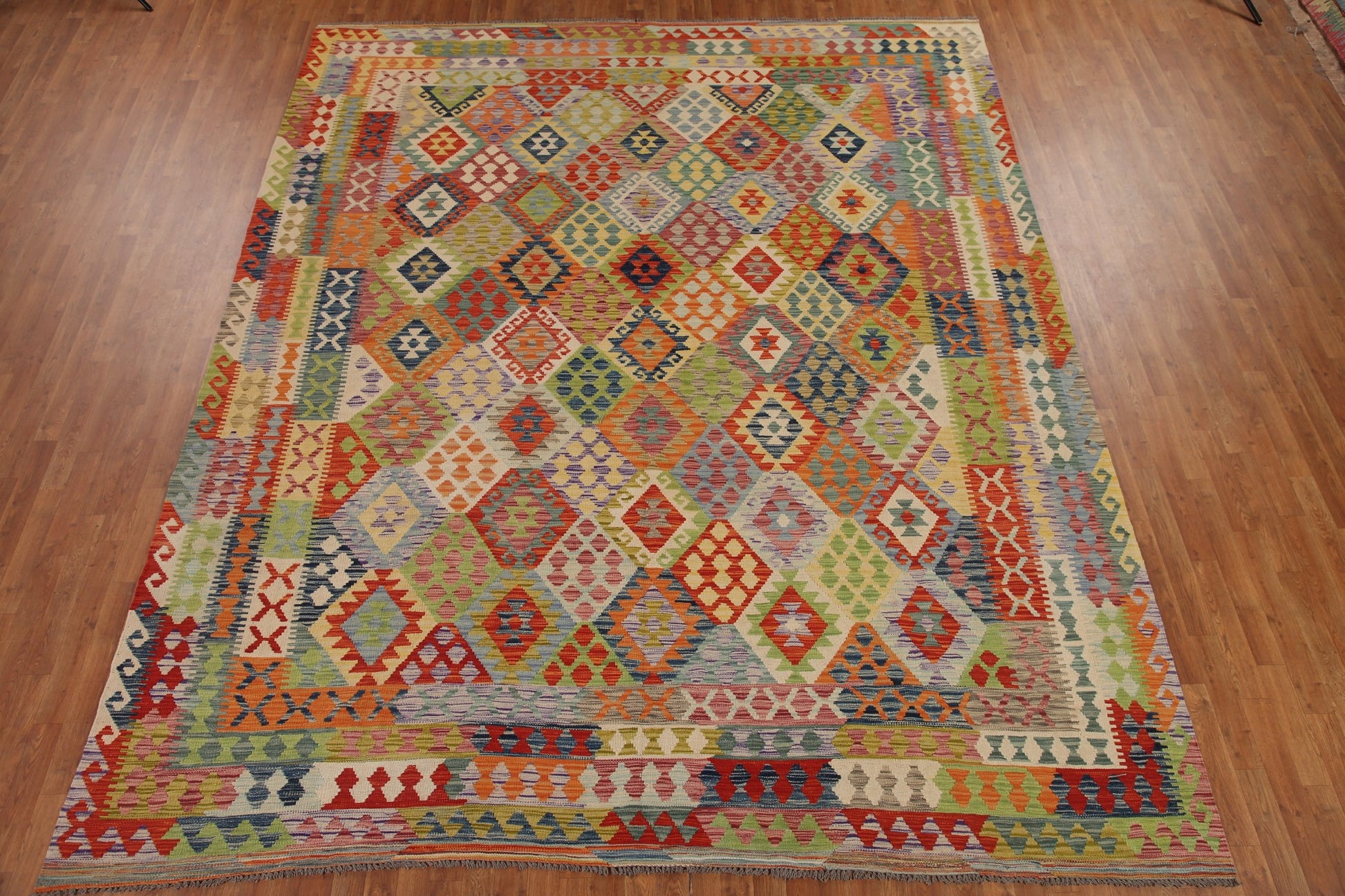 A Beautiful Genuine Pakistan Kilim rug is Hand Woven by skillful weavers in Pakistan with 100% Wool Material. This rug is in New, First Quality condition. dimensions are 12' 6'' X 10' 3'' in foot and 381 X 312 in centimeter. the primary color is Multi-Colored.