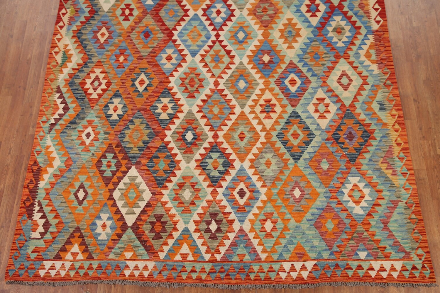 A Beautiful Genuine Pakistan Kilim rug is Hand Woven by skillful weavers in Pakistan with 100% Wool Material. This rug is in New, First Quality condition. dimensions are 11' 1'' X 8' 0'' in foot and 338 X 244 in centimeter. the primary color is Multi-Colored.