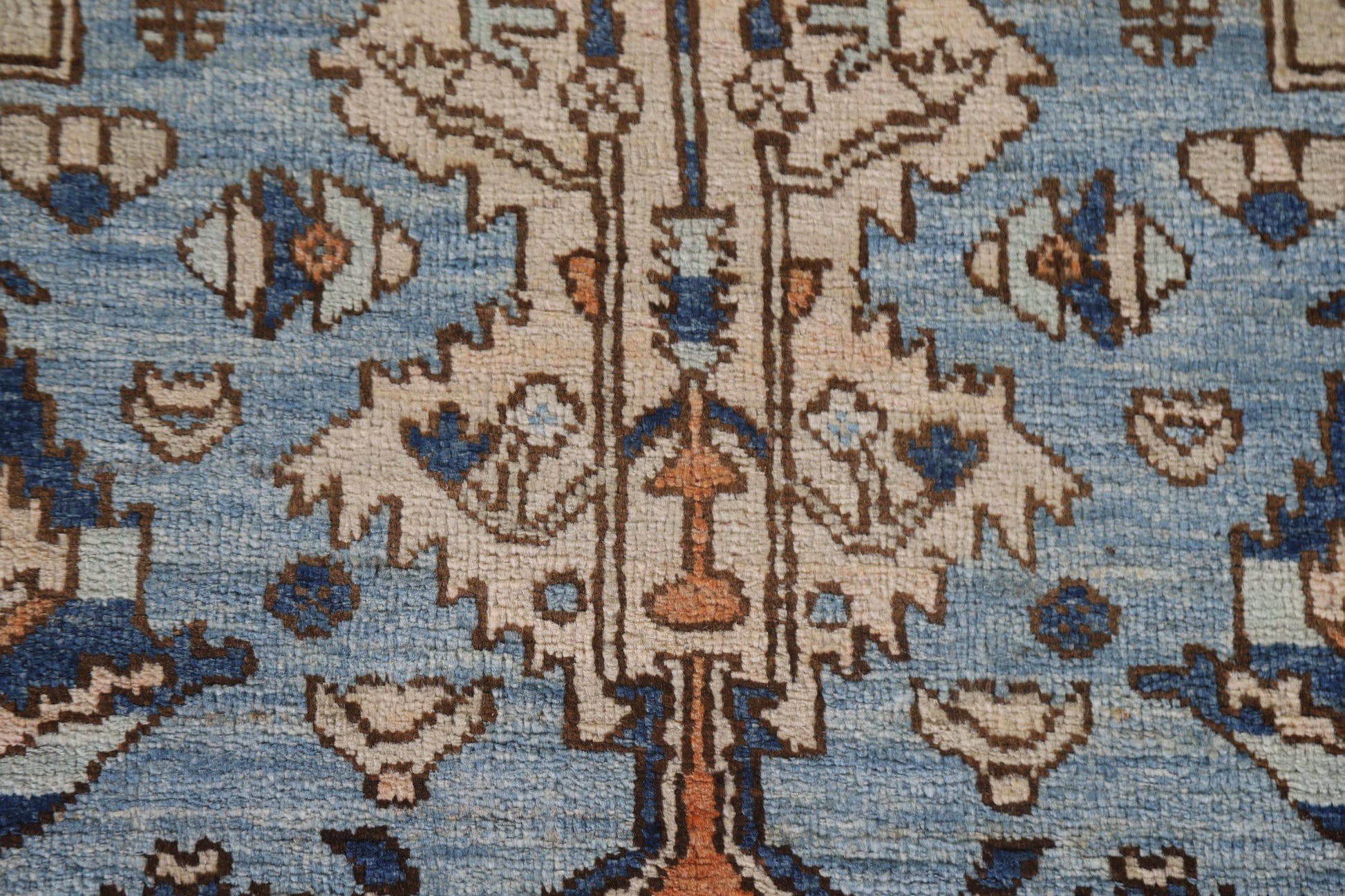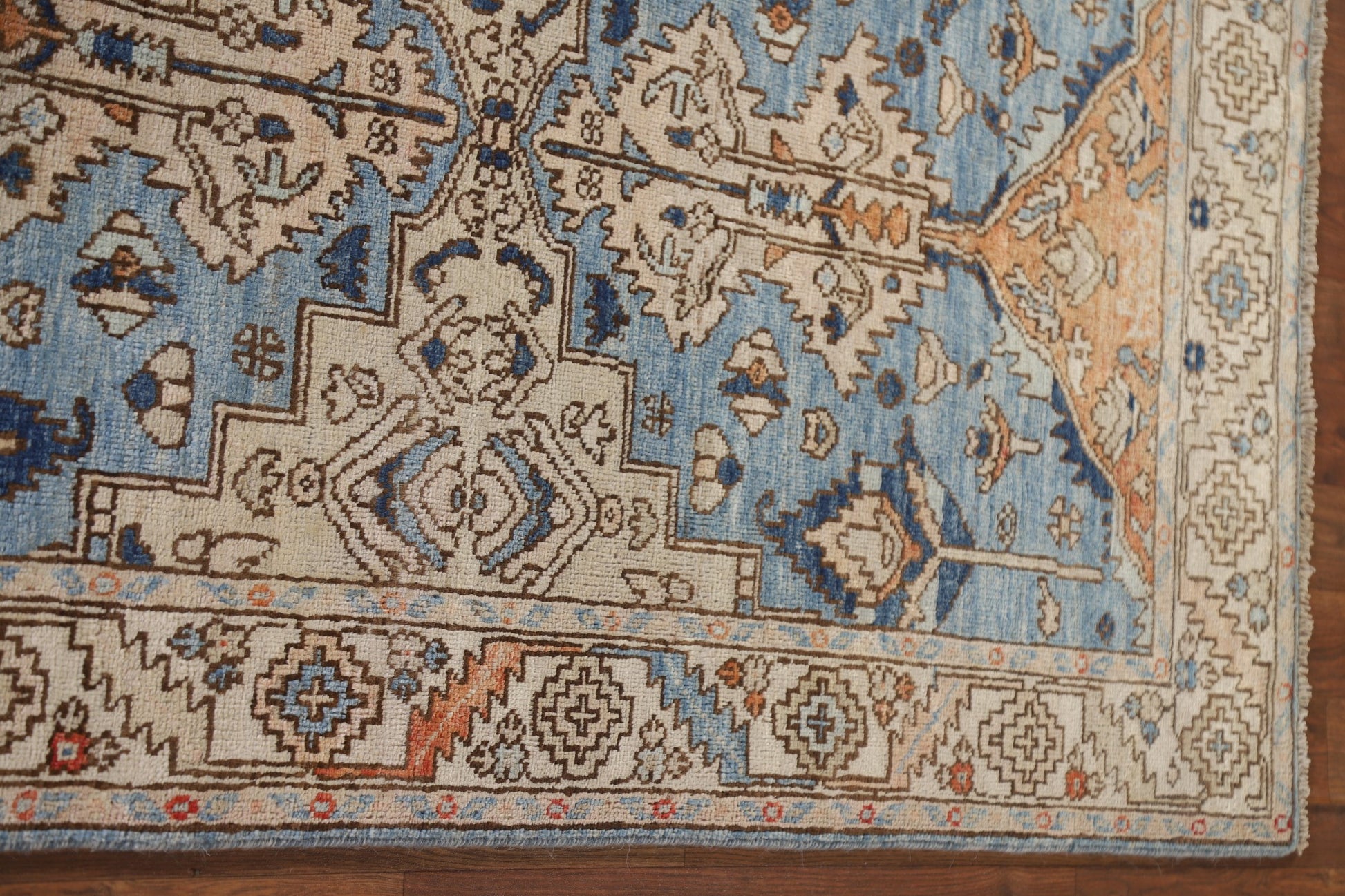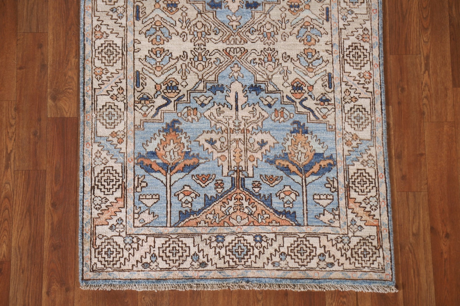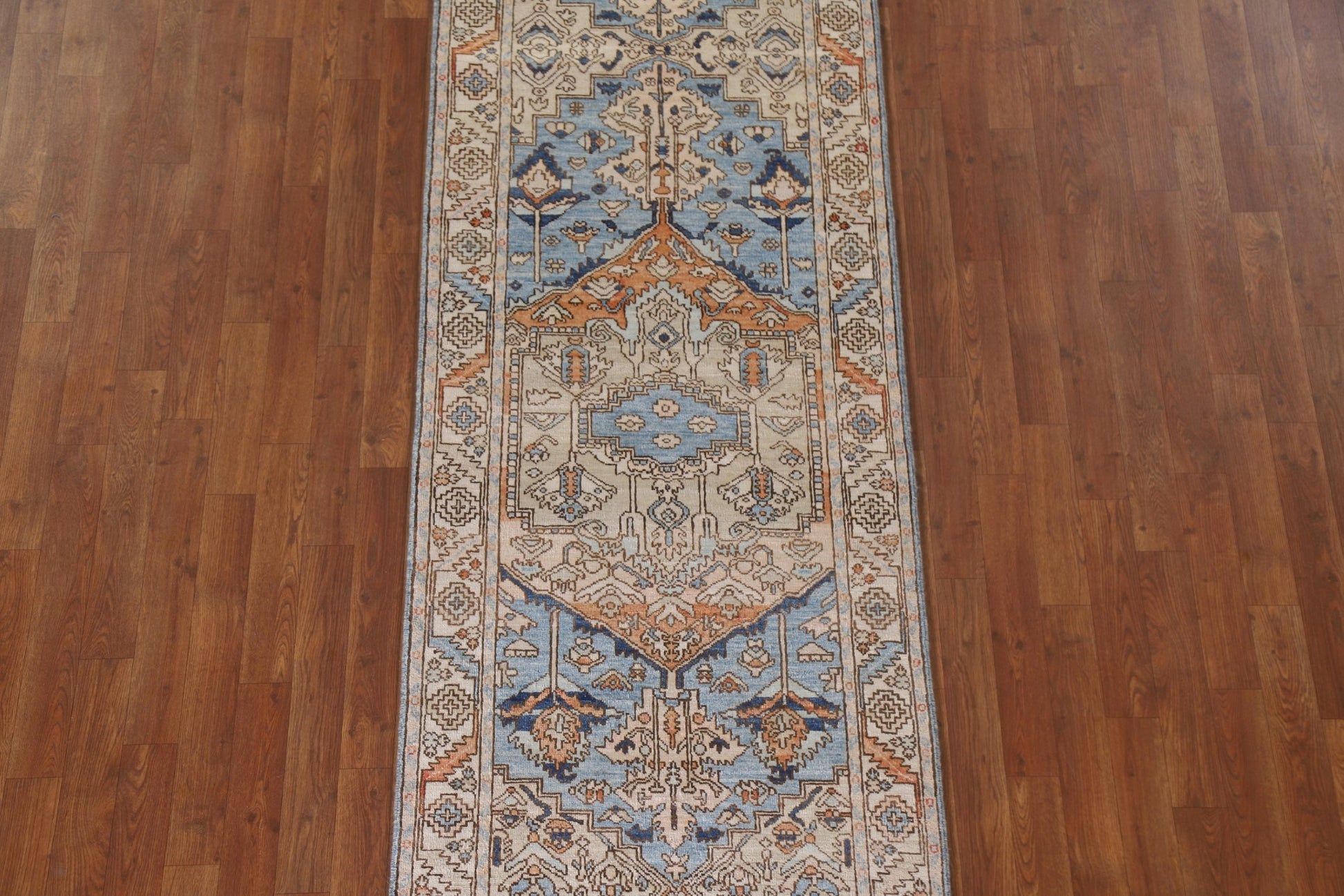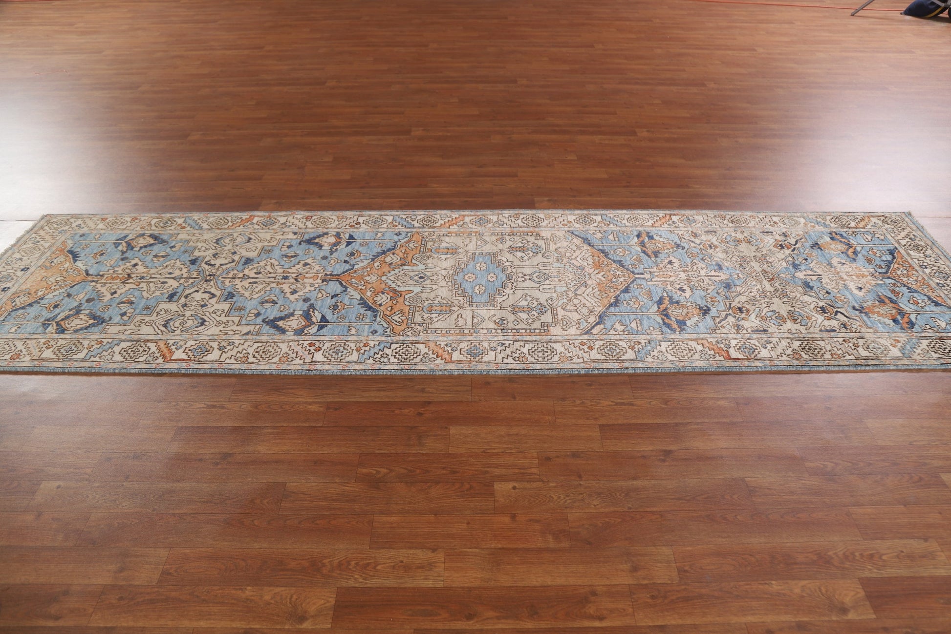A Beautiful Genuine Pakistan Heriz (serapi) rug is Hand Knotted by skillful weavers in Pakistan with 100% Wool Material. This rug is in New, First Quality condition. dimensions are 10' 5'' X 2' 10'' in foot and 318 X 86 in centimeter. the primary color is Navy Blue & Blues.