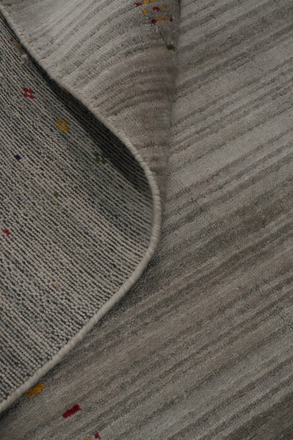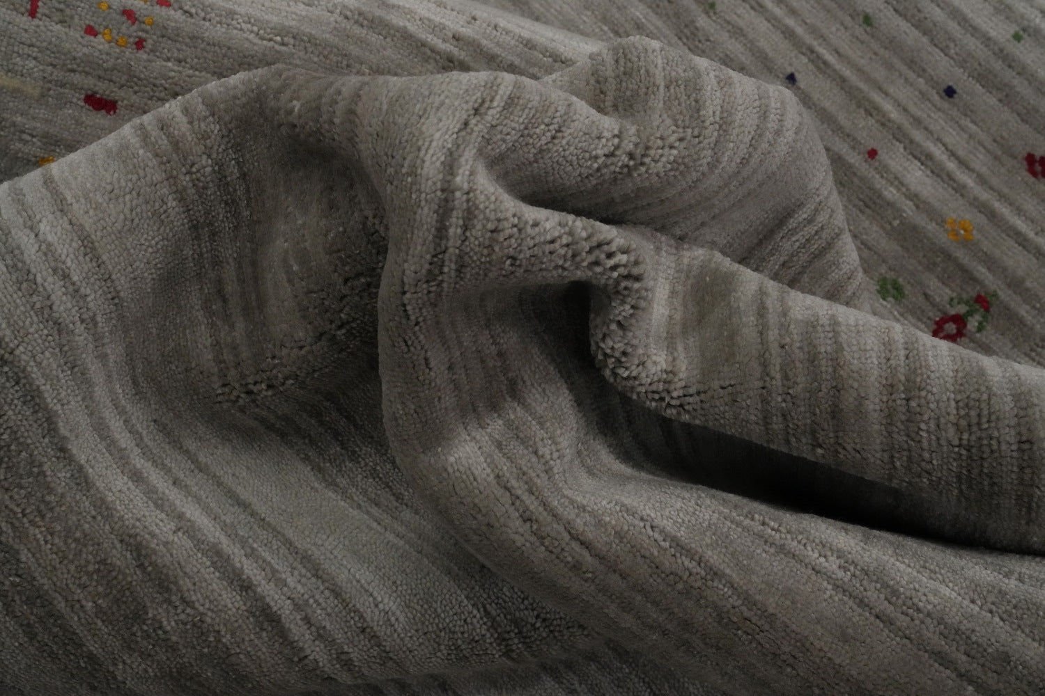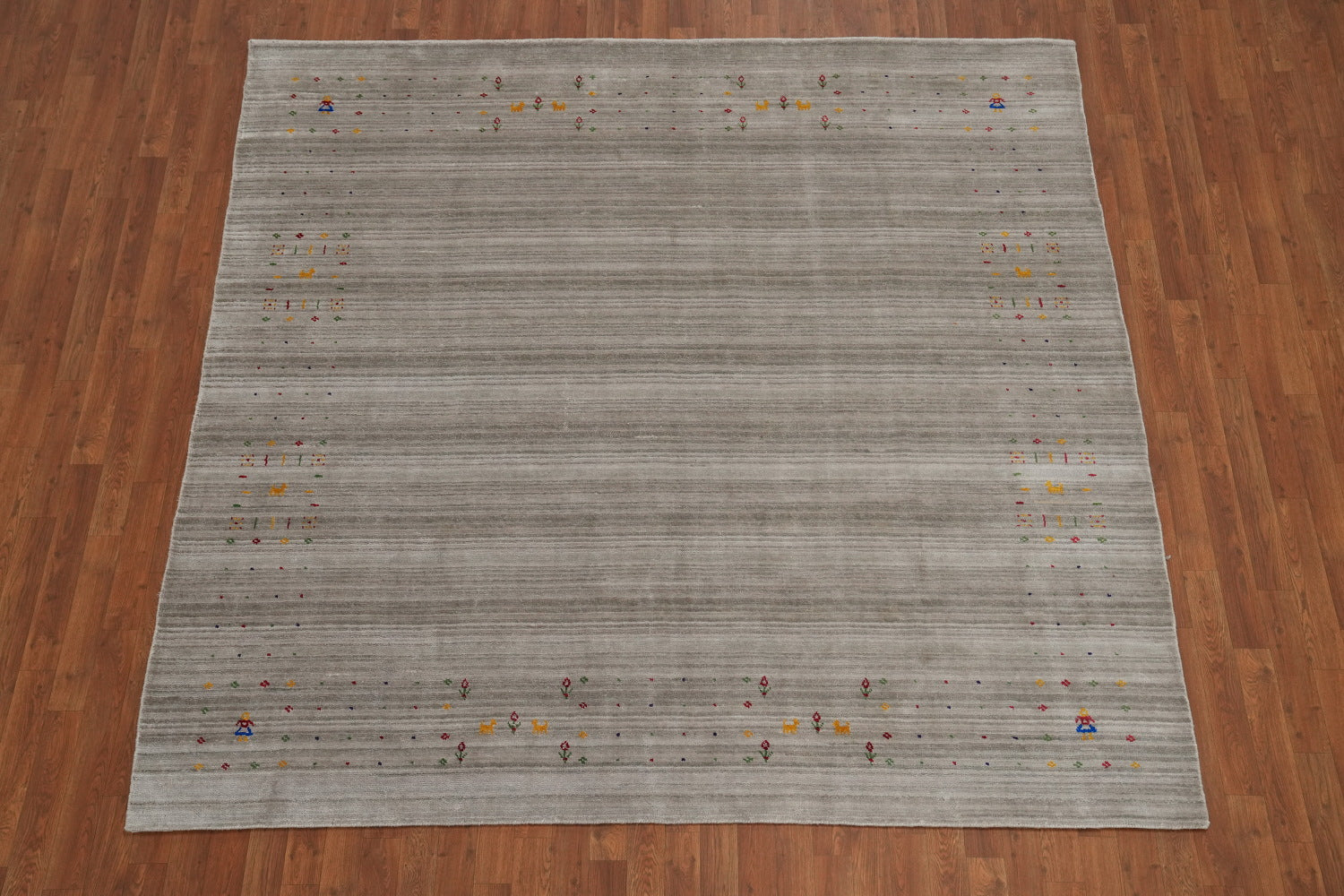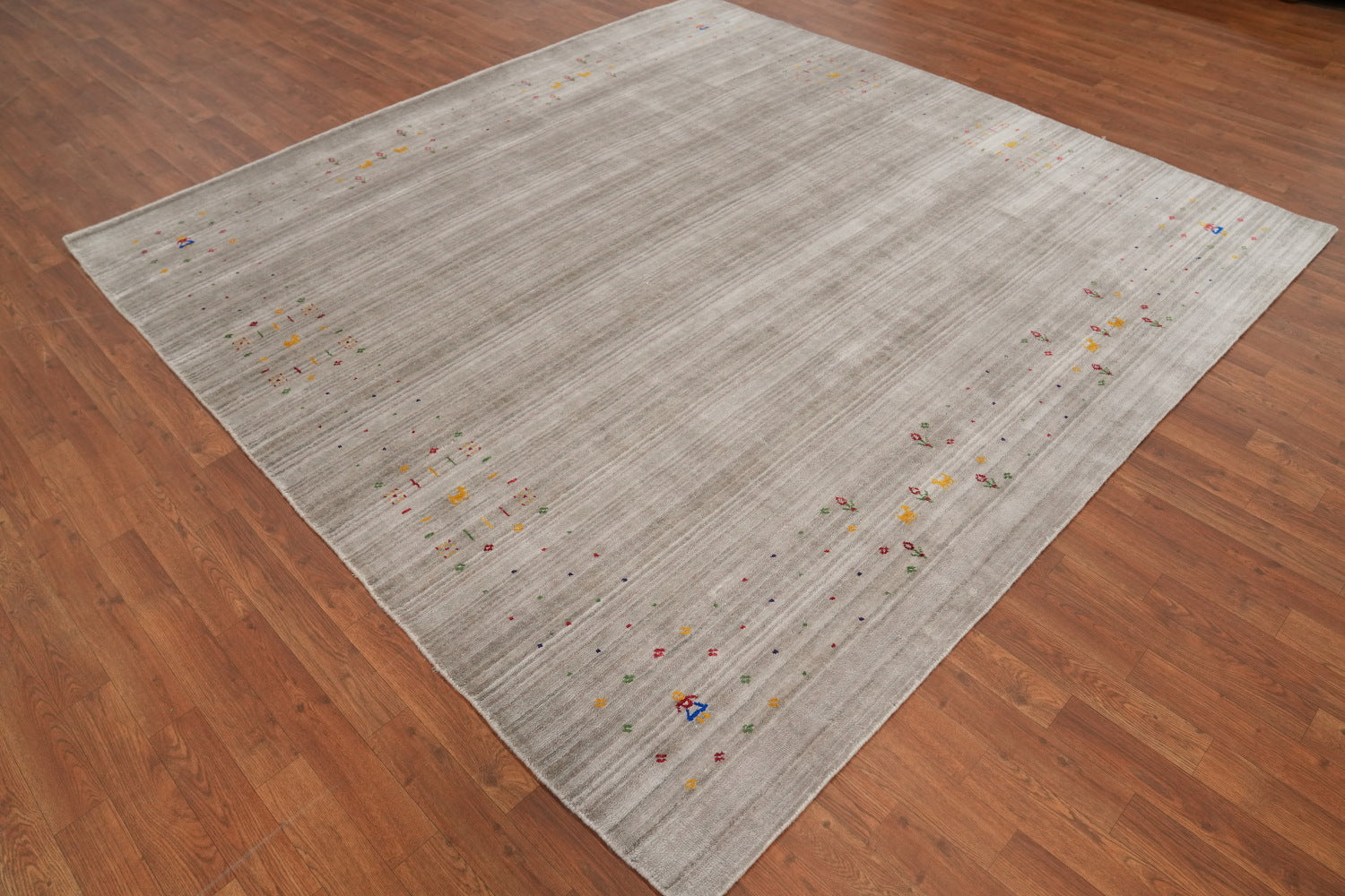 A Beautiful Genuine India Gabbeh rug is Hand Knotted by skillful weavers in India with Silk Material. This rug is in New, First Quality condition. dimensions are 7' 9'' X 7' 11'' in foot and 236 X 241 in centimeter. the primary color is Greys & Charcoal.