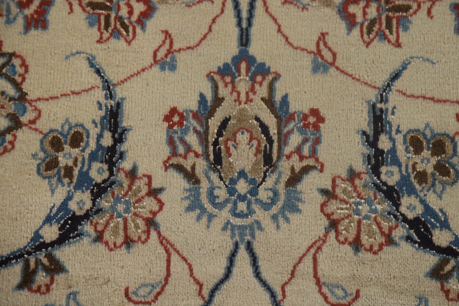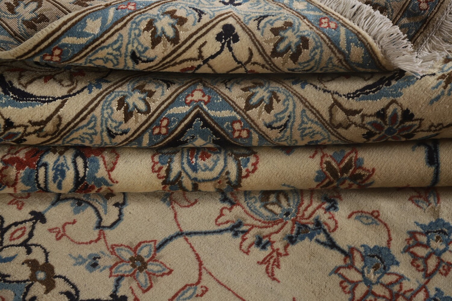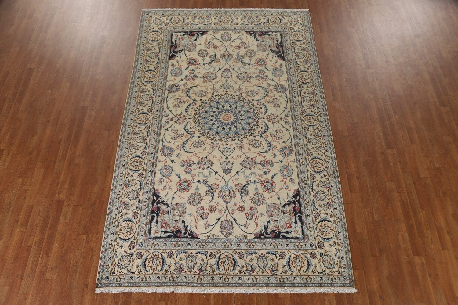 A Beautiful Genuine Persia ( Persia ) Nain rug is Hand Knotted by skillful weavers in Persia ( Persia ) with Silk & Wool Material. This rug is in Very Good (Low Pile) condition. dimensions are 10' 4'' X 6' 6'' in foot and 315 X 198 in centimeter. the primary color is Beige & Ivories.