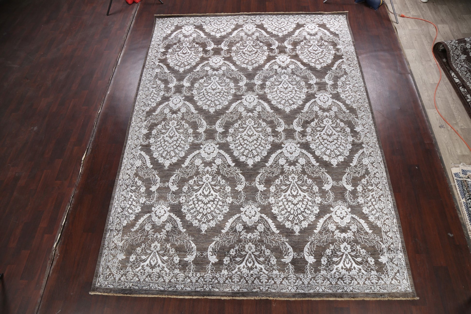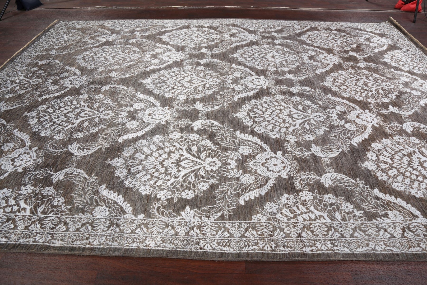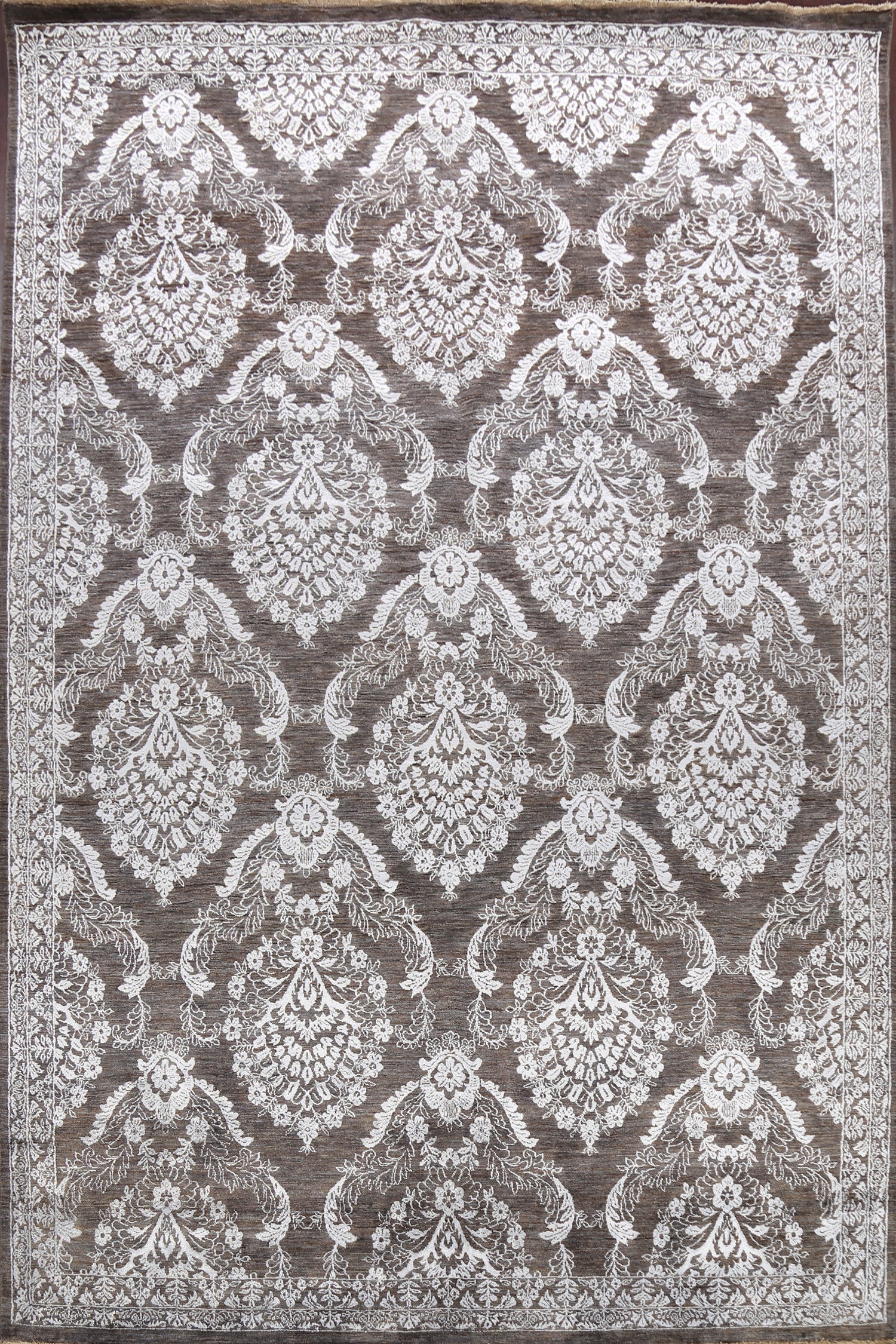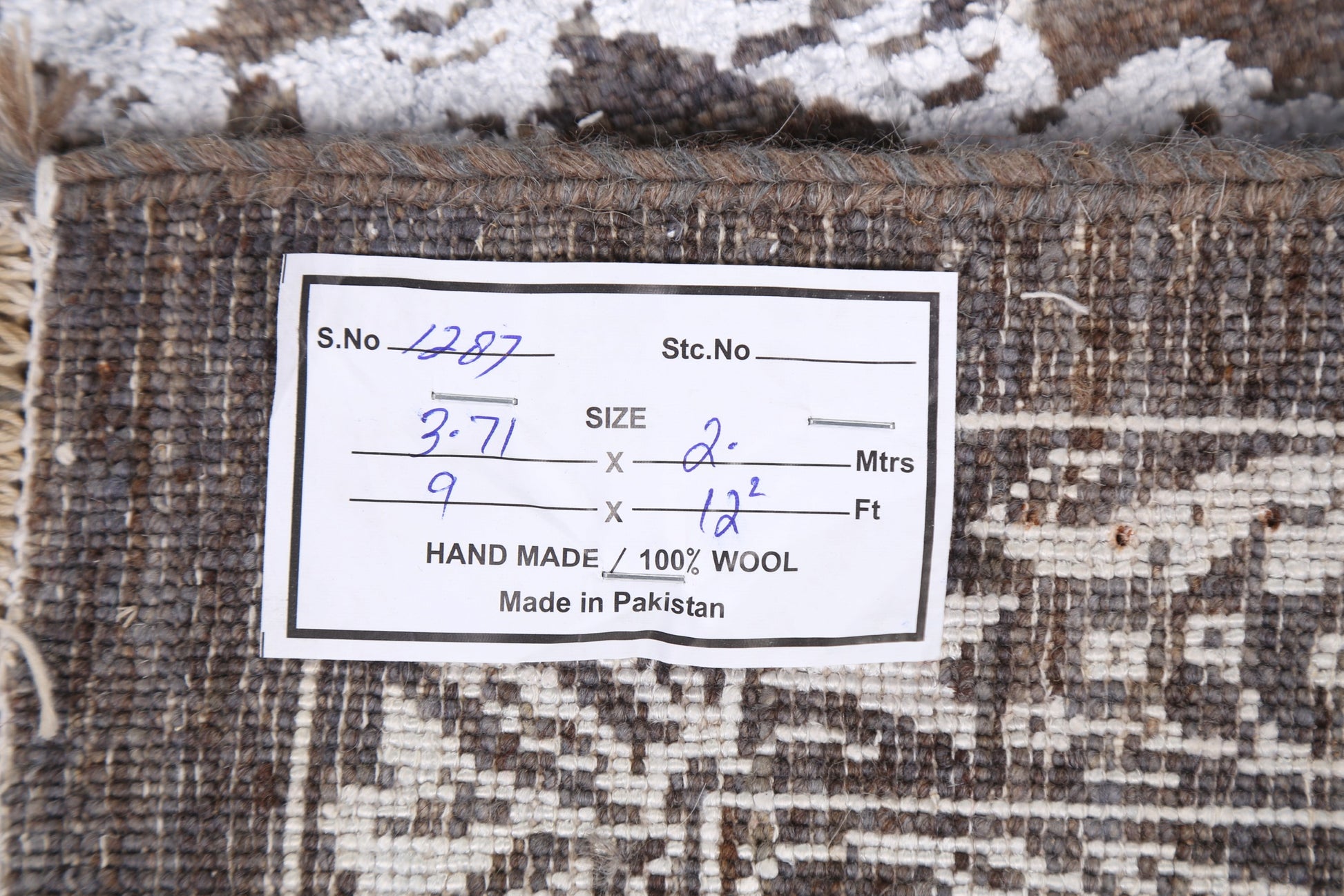 A Beautiful Genuine Pakistan Versace rug is Hand Knotted by skillful weavers in Pakistan with Wool & Silk Material. This rug is in New, First Quality condition. dimensions are 12' 3'' X 8' 11'' in foot and 373 X 272 in centimeter. the primary color is Greys & Charcoal.