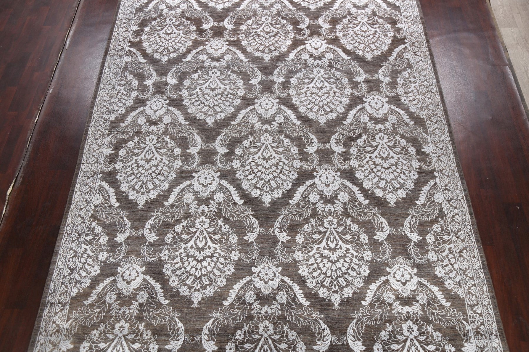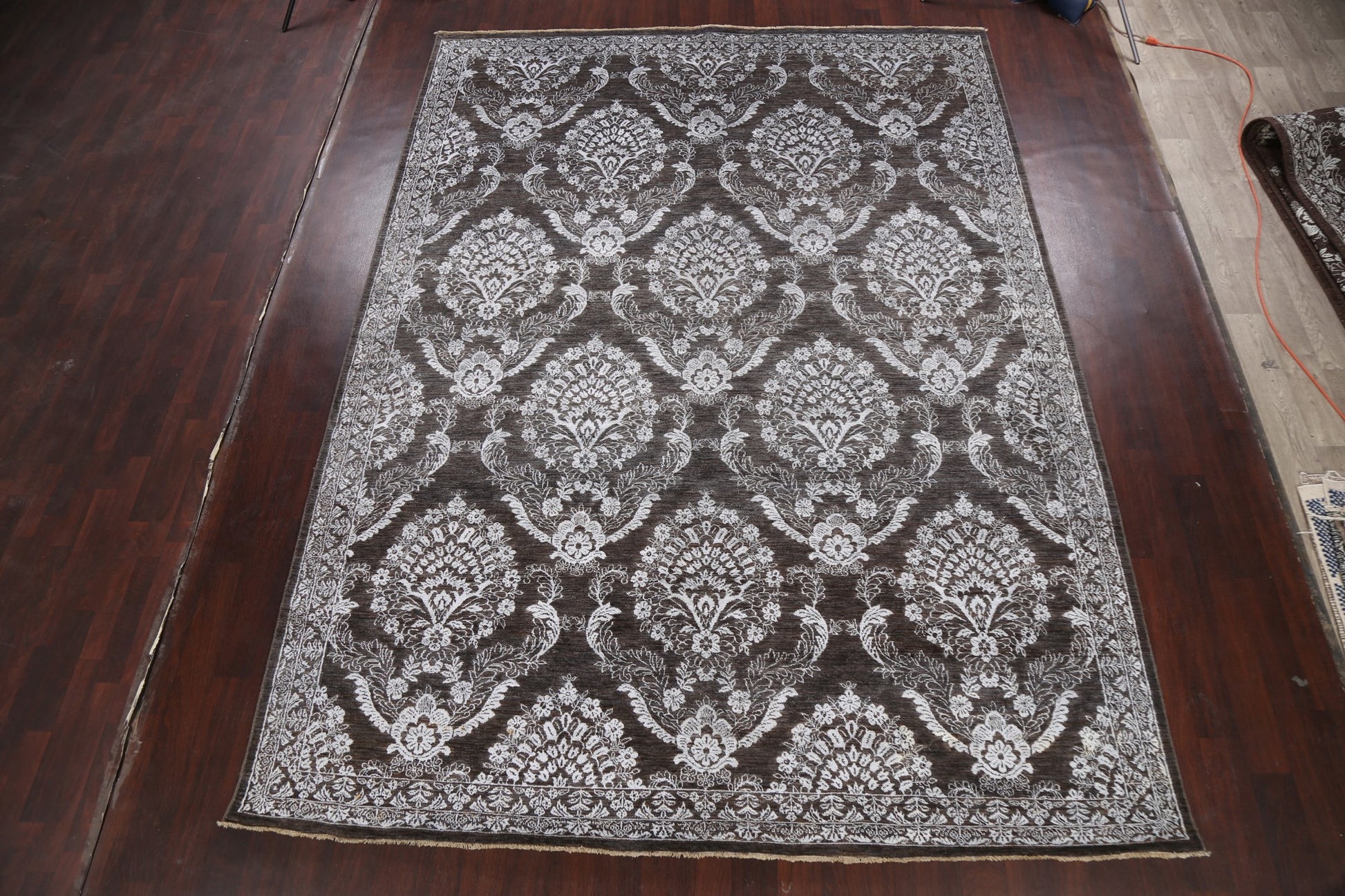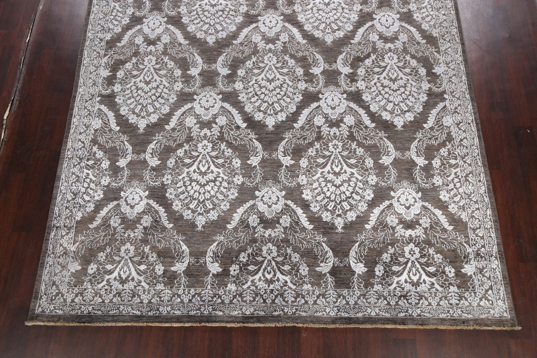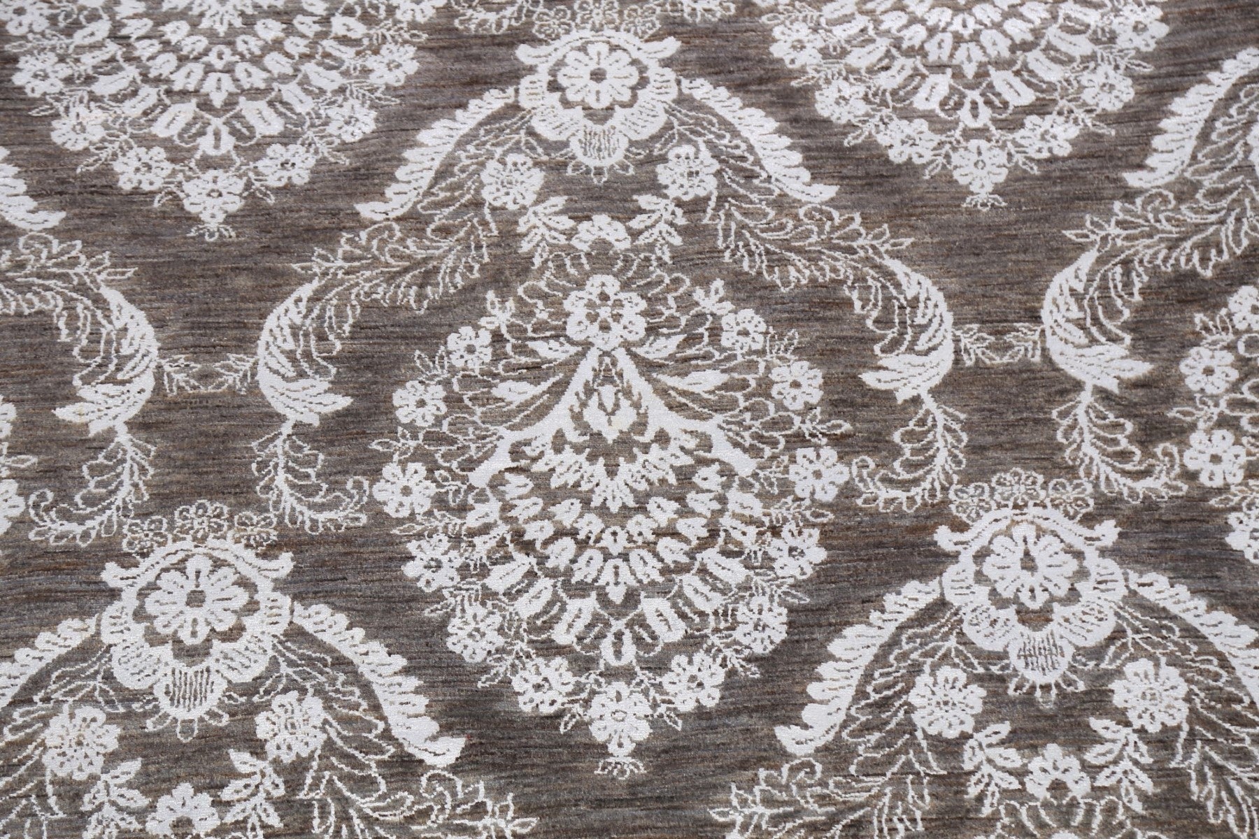 A Beautiful Genuine Pakistan Versace rug is Hand Knotted by skillful weavers in Pakistan with Wool & Silk Material. This rug is in New, First Quality condition. dimensions are 12' 3'' X 8' 11'' in foot and 373 X 272 in centimeter. the primary color is Greys & Charcoal.