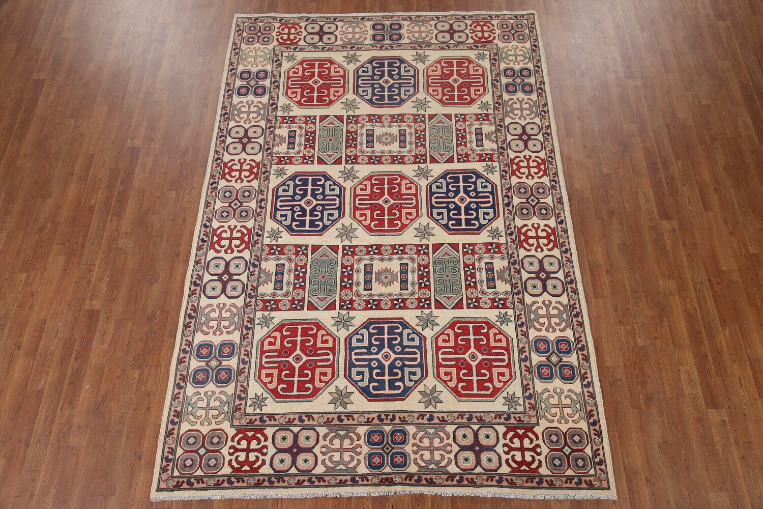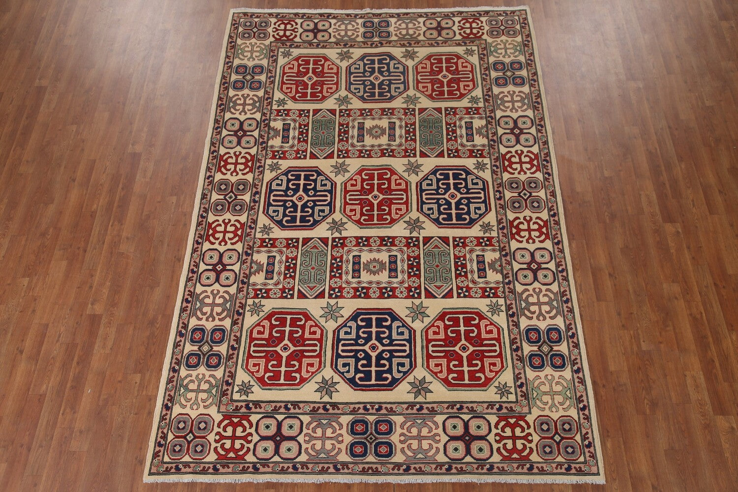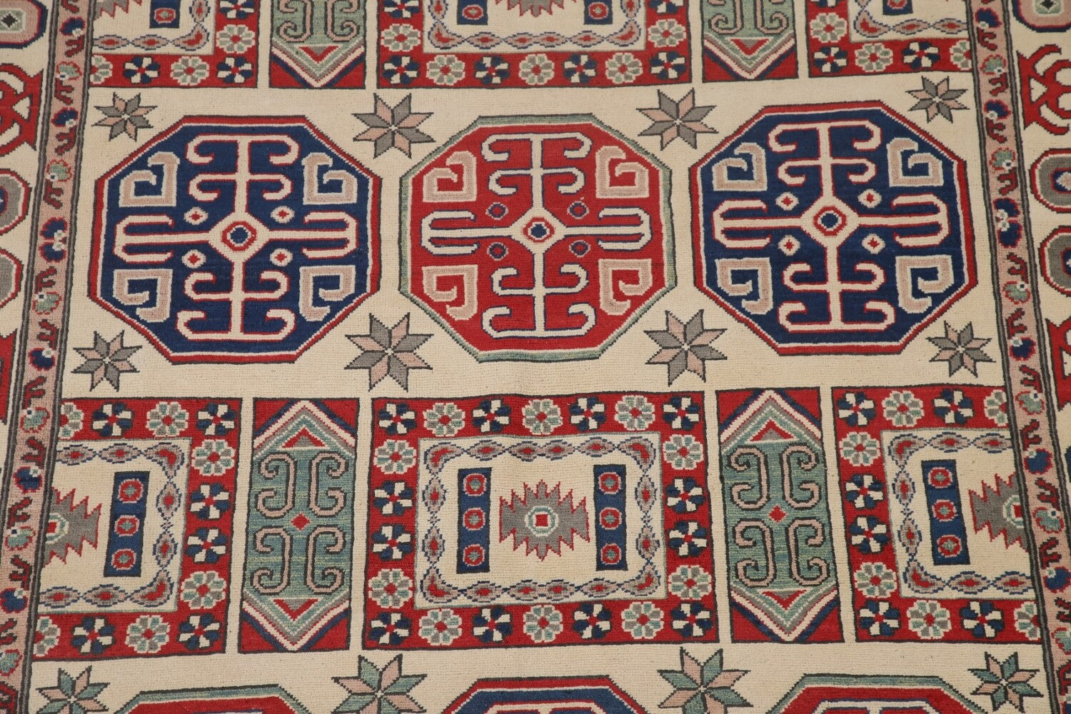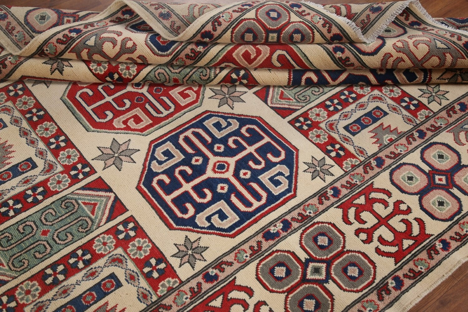 A Beautiful Genuine Pakistan Kazak rug is Hand Knotted by skillful weavers in Pakistan with 100% Wool Material. This rug is in condition. dimensions are 9' 7'' X 6' 6'' in foot and 292 X 198 in centimeter. the primary color is Beige & Ivories.
