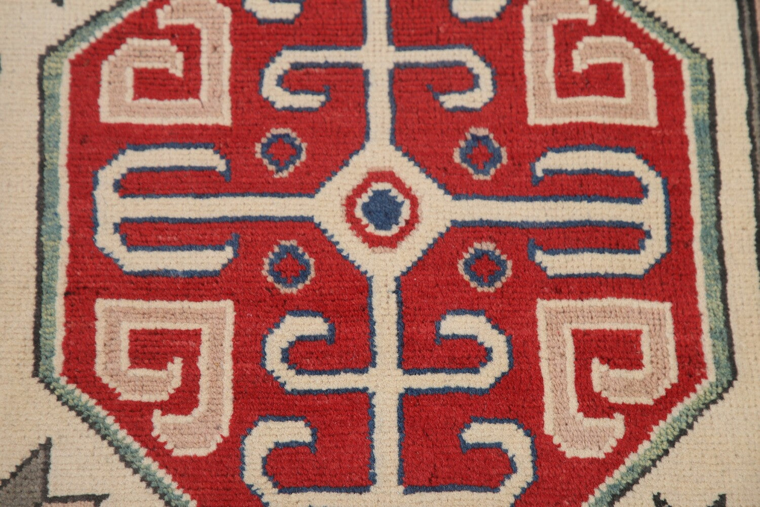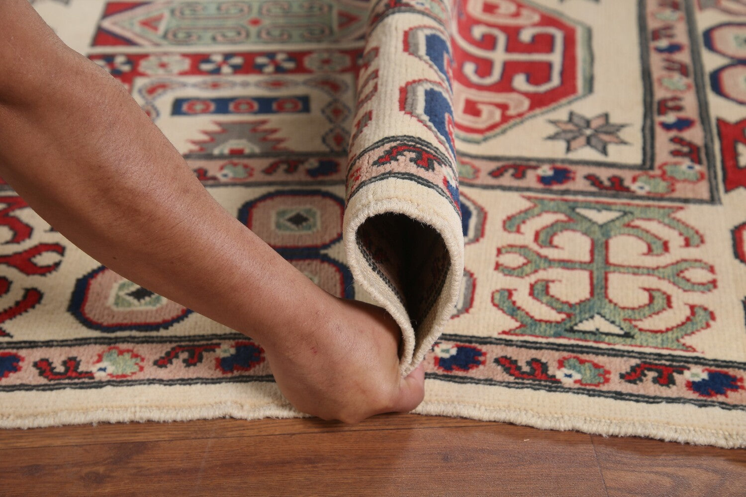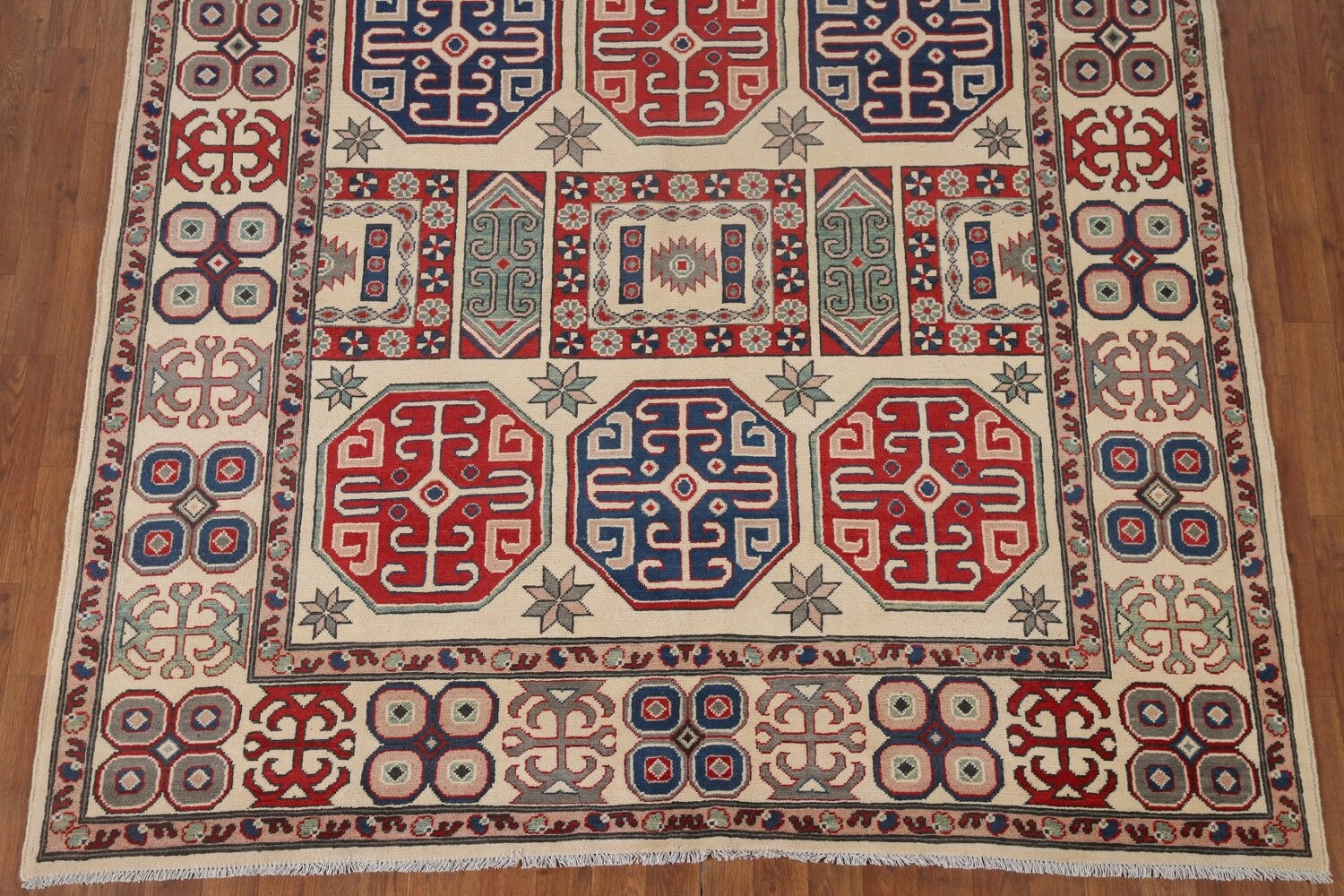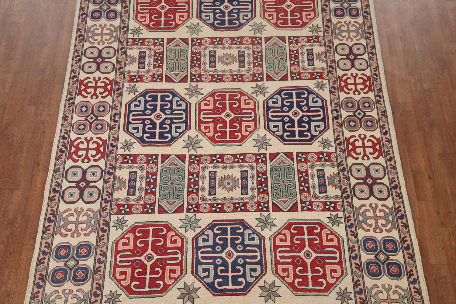 A Beautiful Genuine Pakistan Kazak rug is Hand Knotted by skillful weavers in Pakistan with 100% Wool Material. This rug is in condition. dimensions are 9' 7'' X 6' 6'' in foot and 292 X 198 in centimeter. the primary color is Beige & Ivories.
