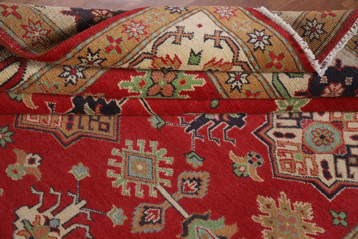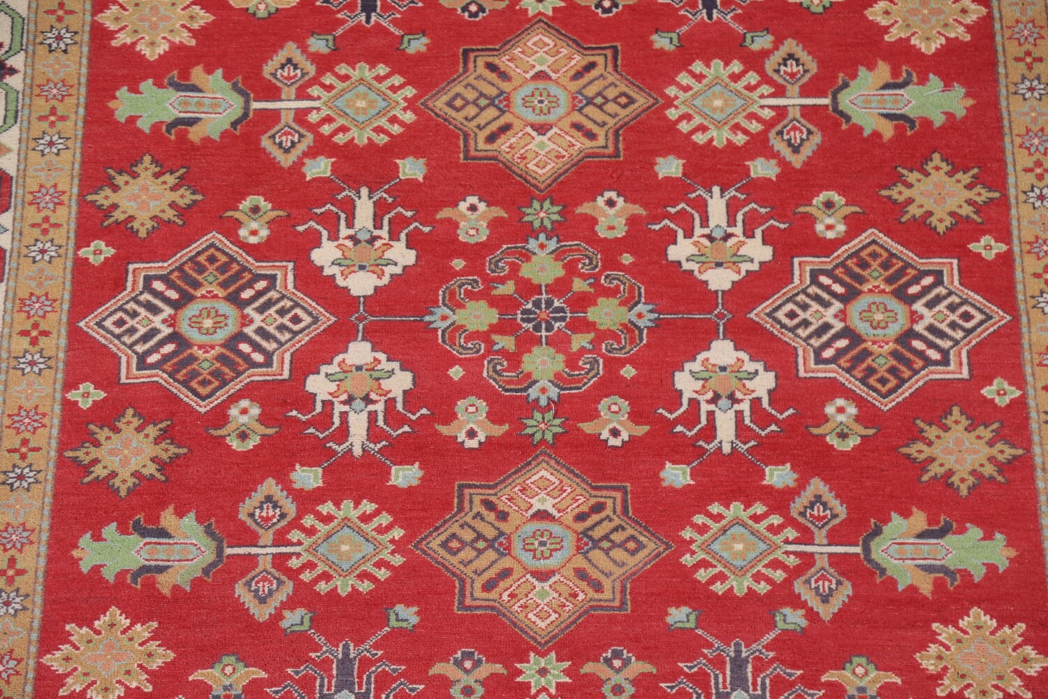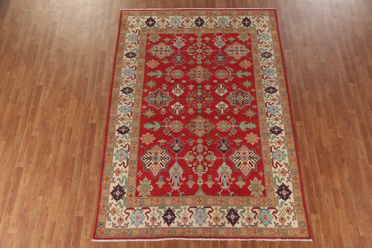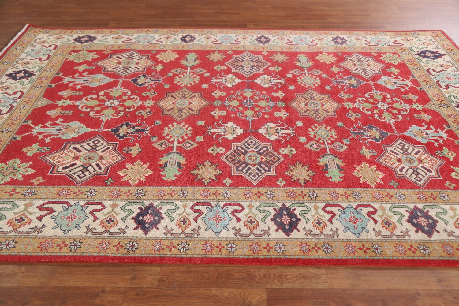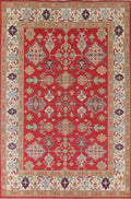 A Beautiful Genuine Pakistan Kazak rug is Hand Knotted by skillful weavers in Pakistan with 100% Wool Material. This rug is in New, First Quality condition. dimensions are 9' 6'' X 6' 8'' in foot and 290 X 203 in centimeter. the primary color is Red.