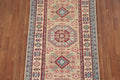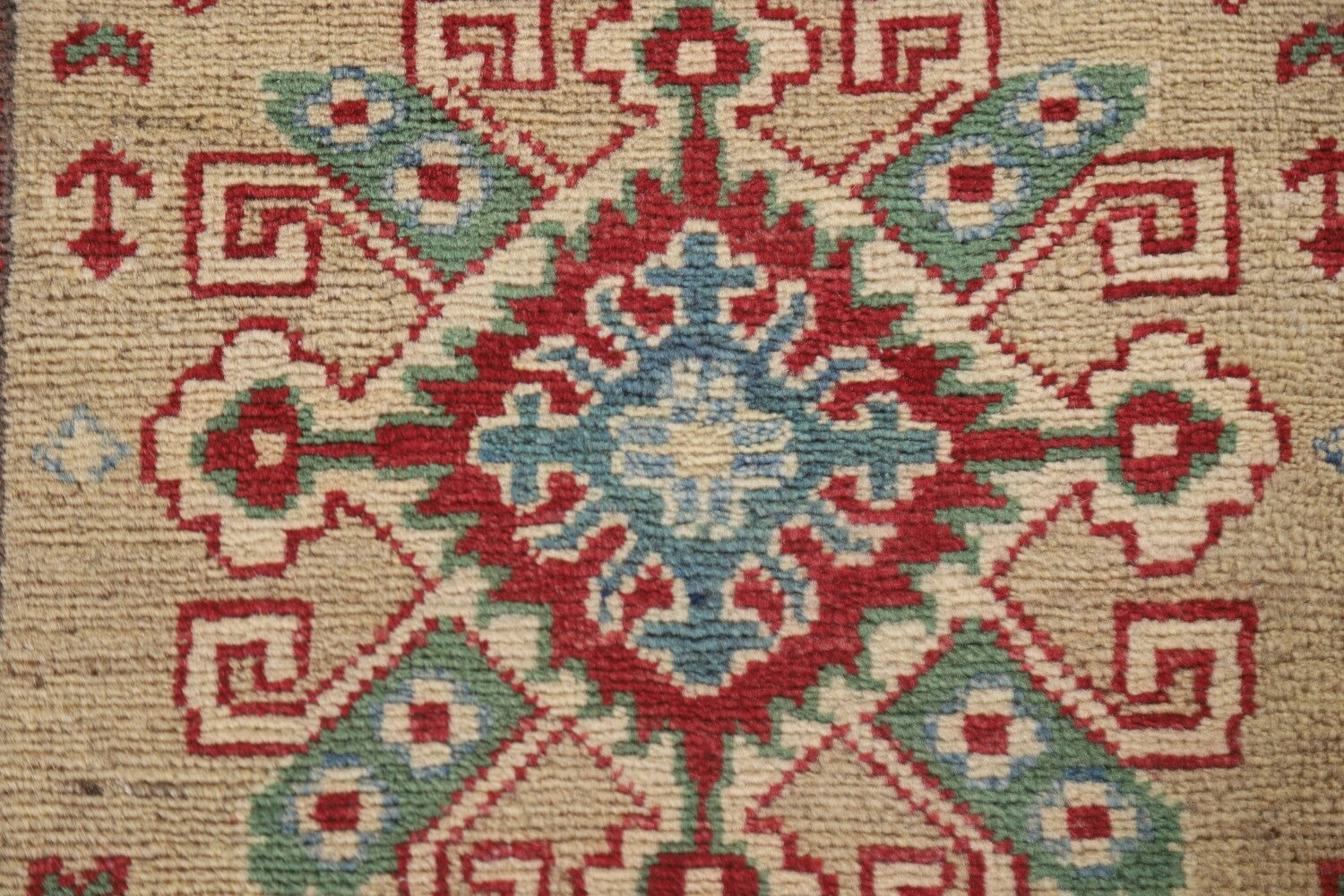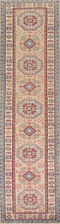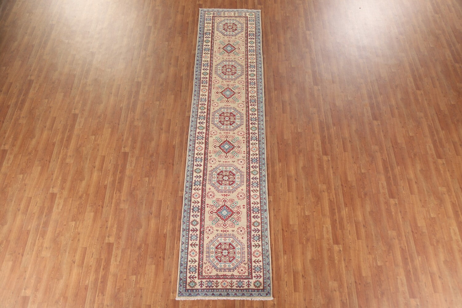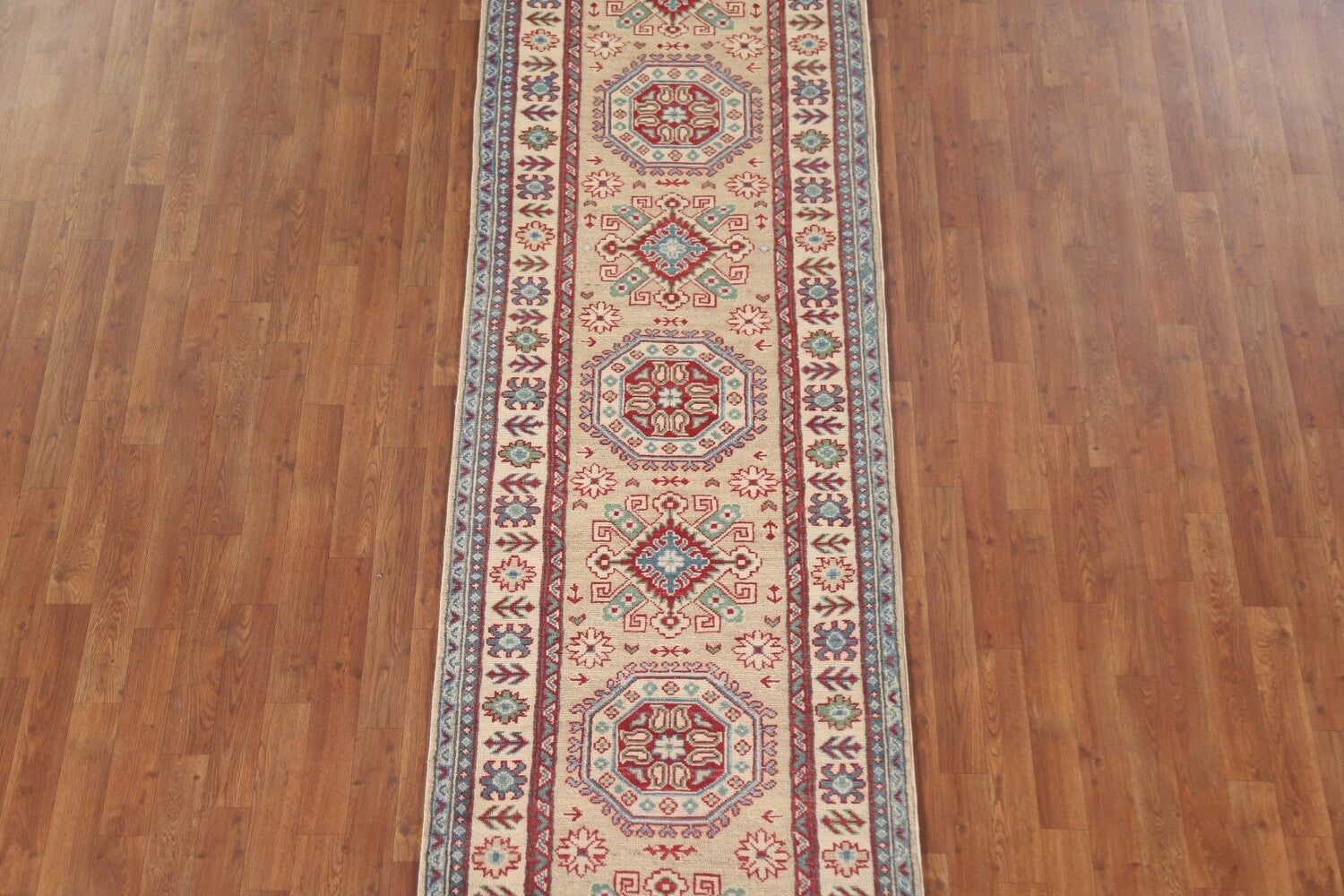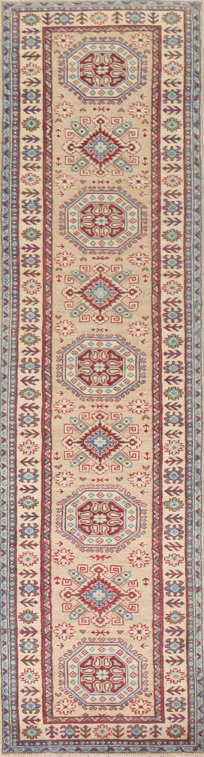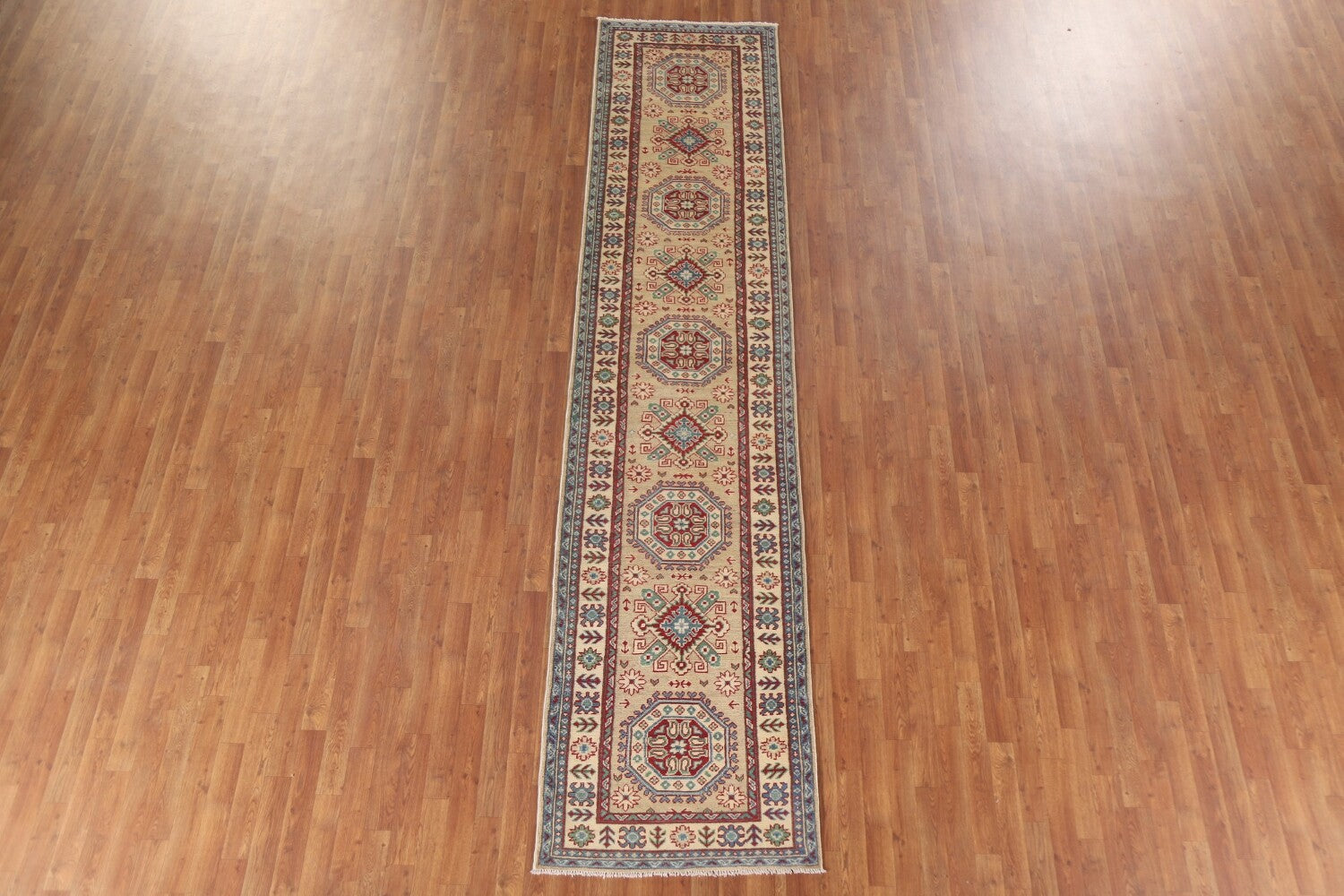 A Beautiful Genuine Pakistan Kazak rug is Hand Knotted by skillful weavers in Pakistan with 100% Wool Material. This rug is in New, First Quality condition. dimensions are 12' 8'' X 2' 10'' in foot and 386 X 86 in centimeter. the primary color is Beige & Ivories.
