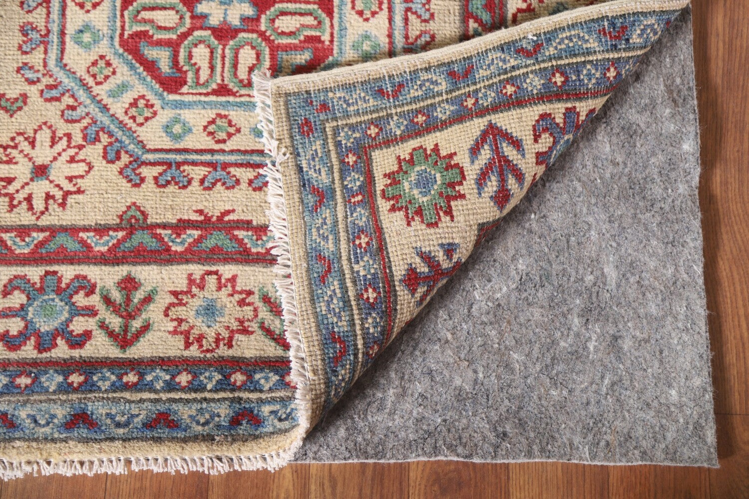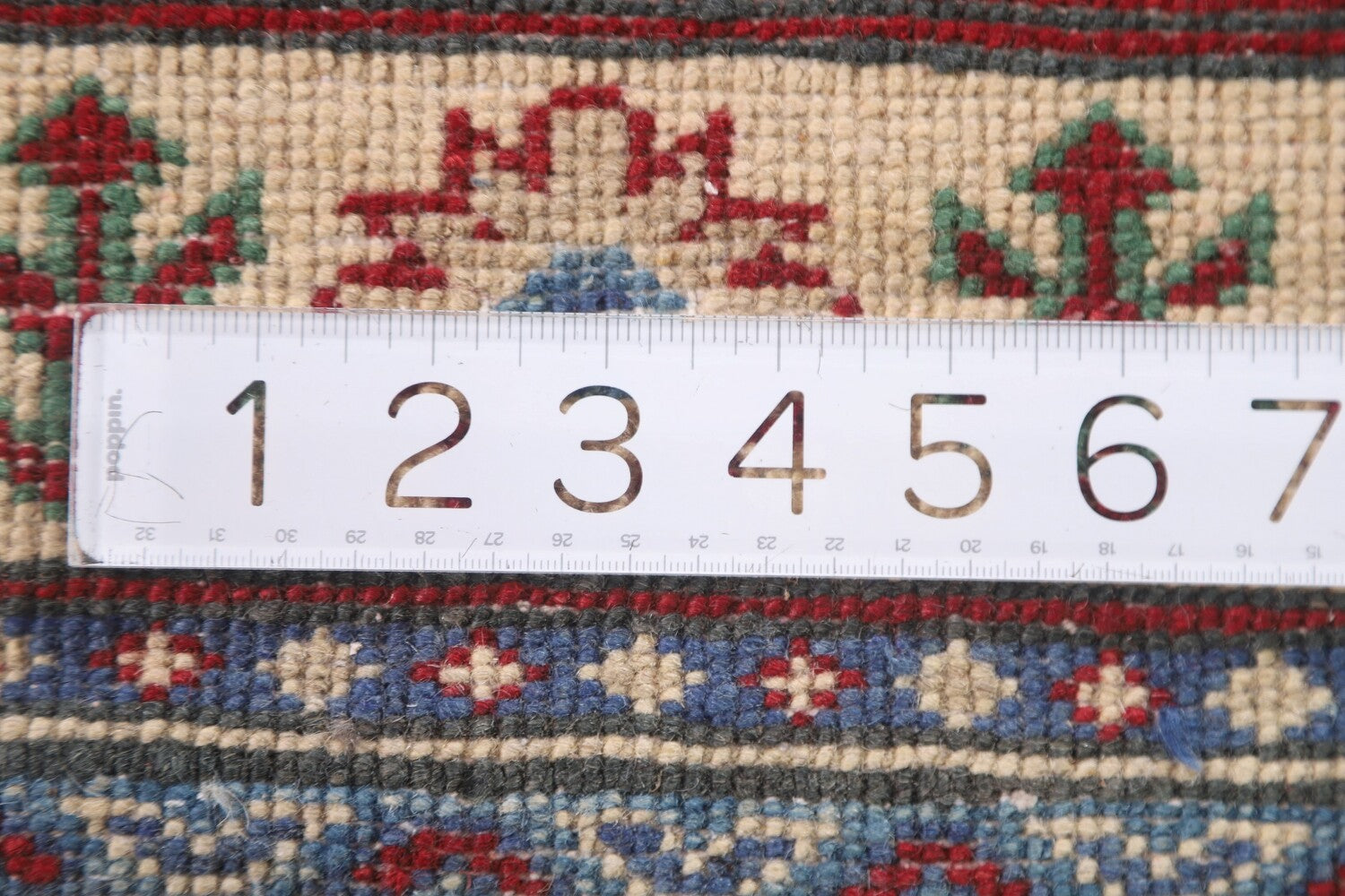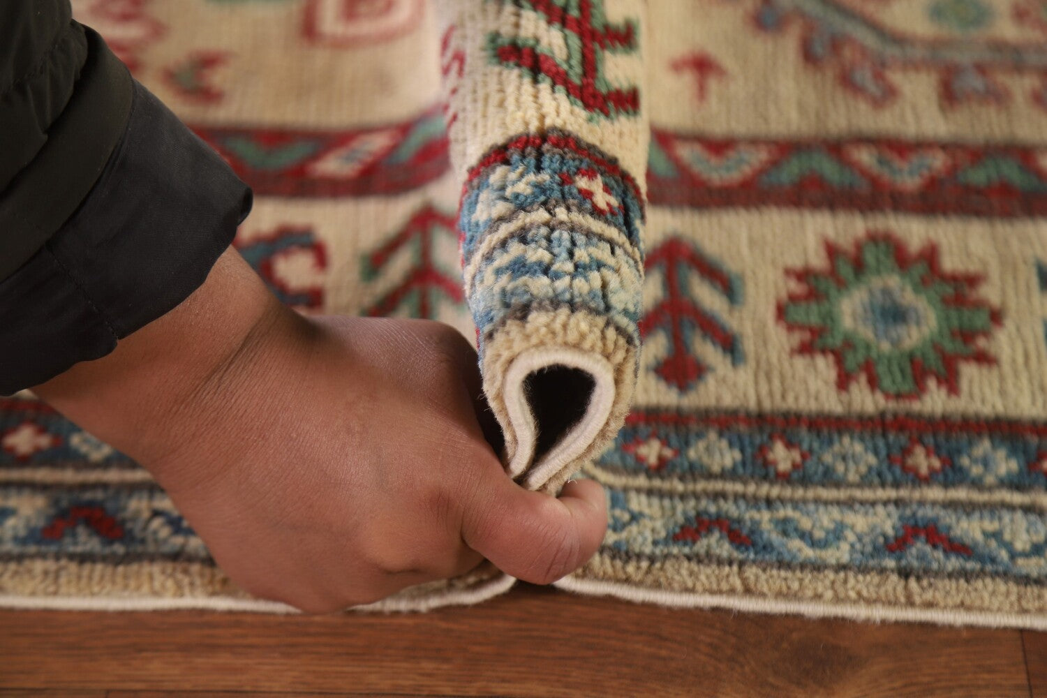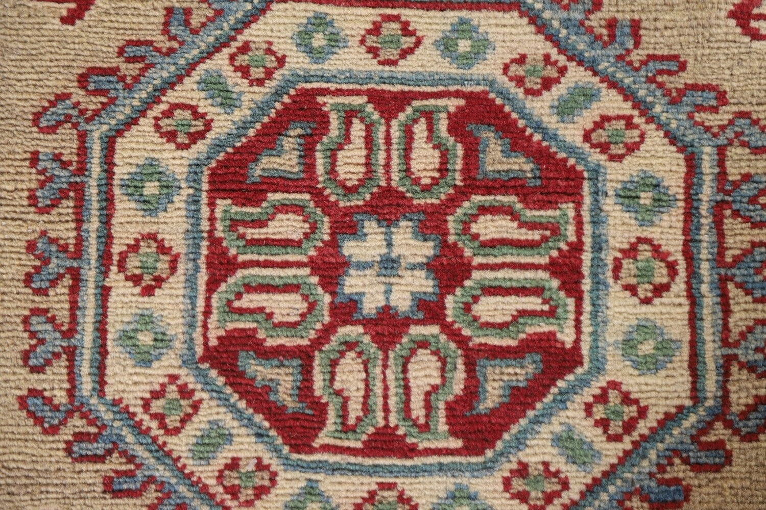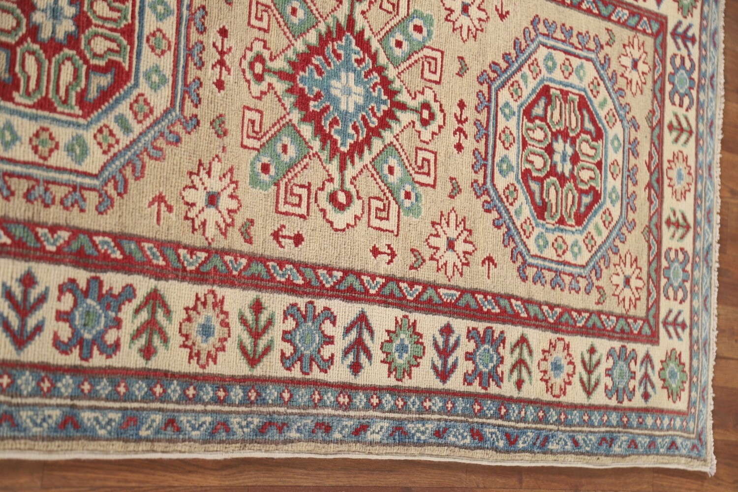 A Beautiful Genuine Pakistan Kazak rug is Hand Knotted by skillful weavers in Pakistan with 100% Wool Material. This rug is in New, First Quality condition. dimensions are 12' 8'' X 2' 10'' in foot and 386 X 86 in centimeter. the primary color is Beige & Ivories.