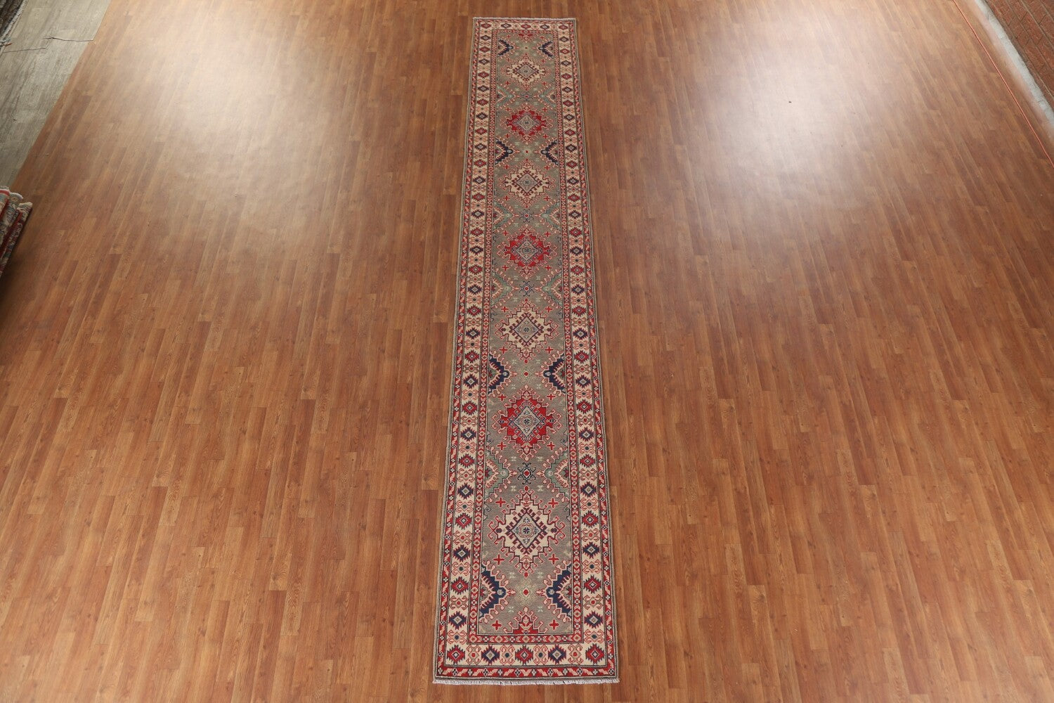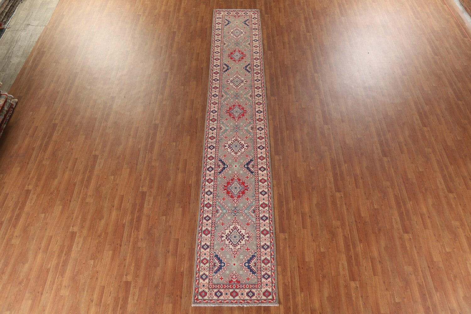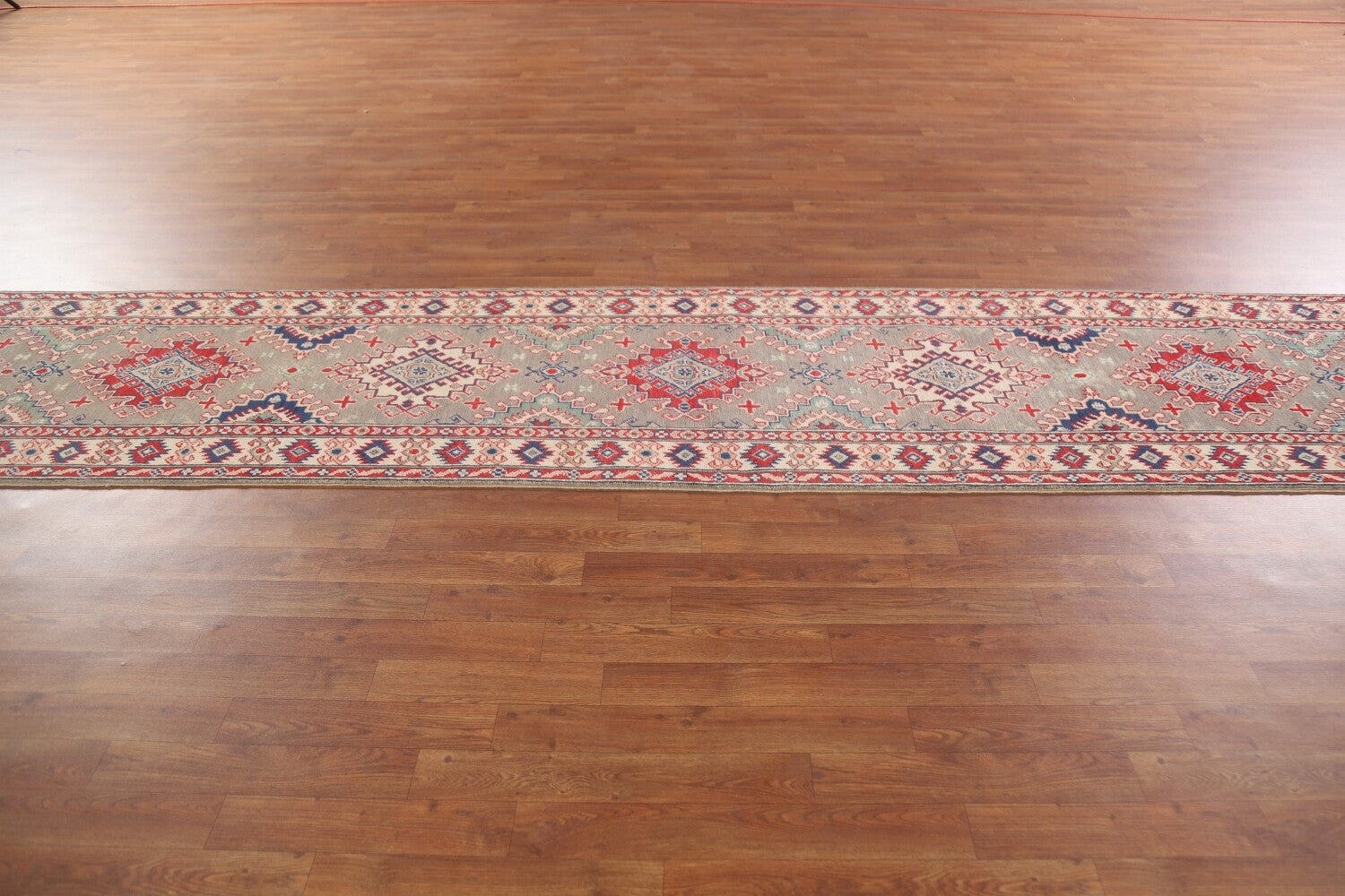 A Beautiful Genuine Pakistan Kazak rug is Hand Knotted by skillful weavers in Pakistan with 100% Wool Material. This rug is in New, First Quality condition. dimensions are 15' 11'' X 2' 8'' in foot and 485 X 81 in centimeter. the primary color is Brown.