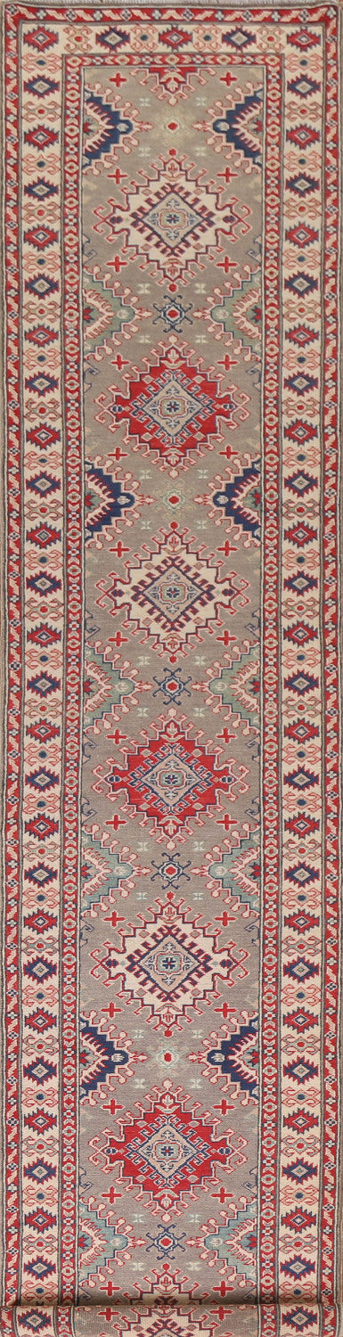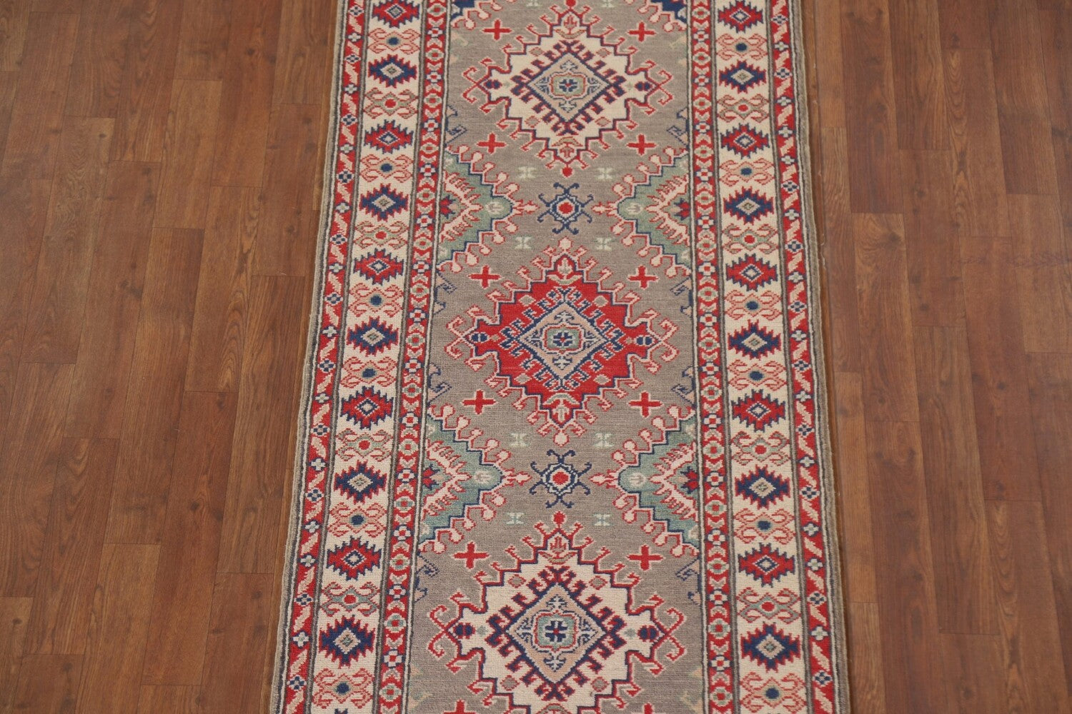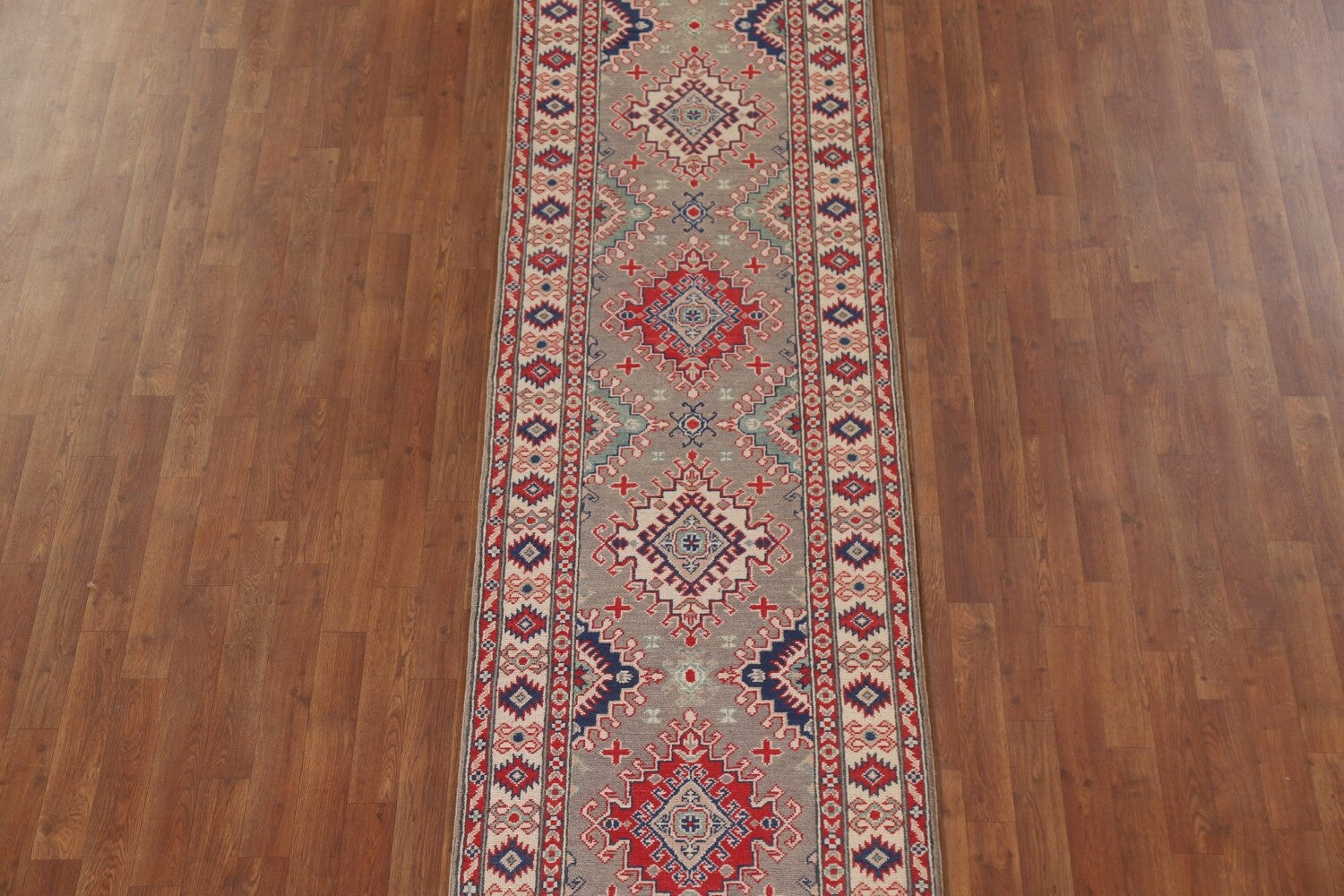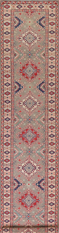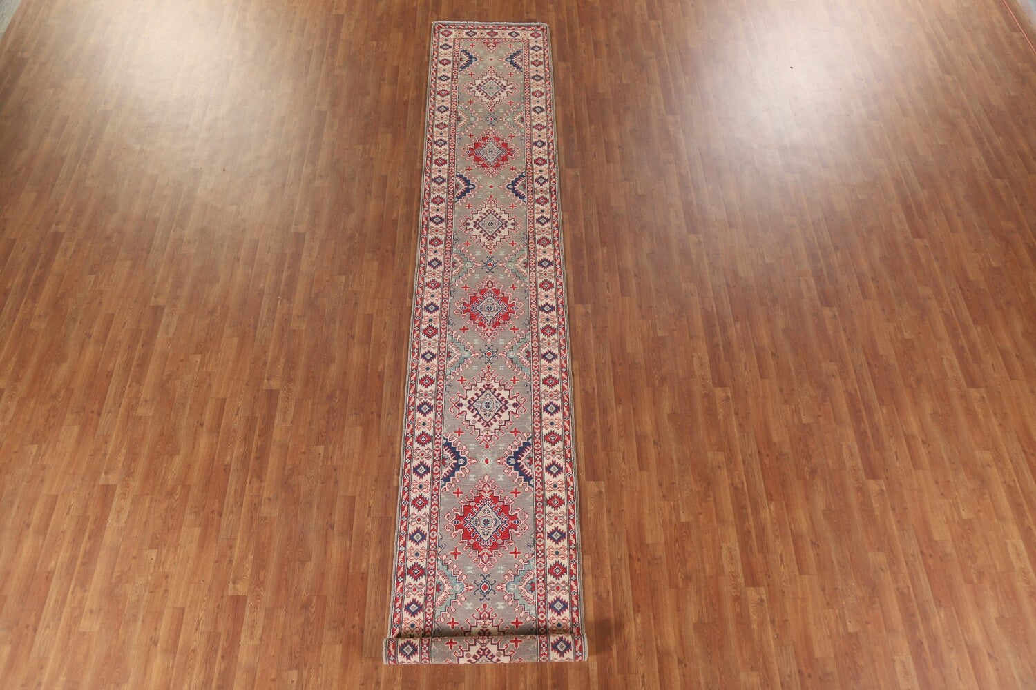 A Beautiful Genuine Pakistan Kazak rug is Hand Knotted by skillful weavers in Pakistan with 100% Wool Material. This rug is in New, First Quality condition. dimensions are 15' 11'' X 2' 8'' in foot and 485 X 81 in centimeter. the primary color is Brown.