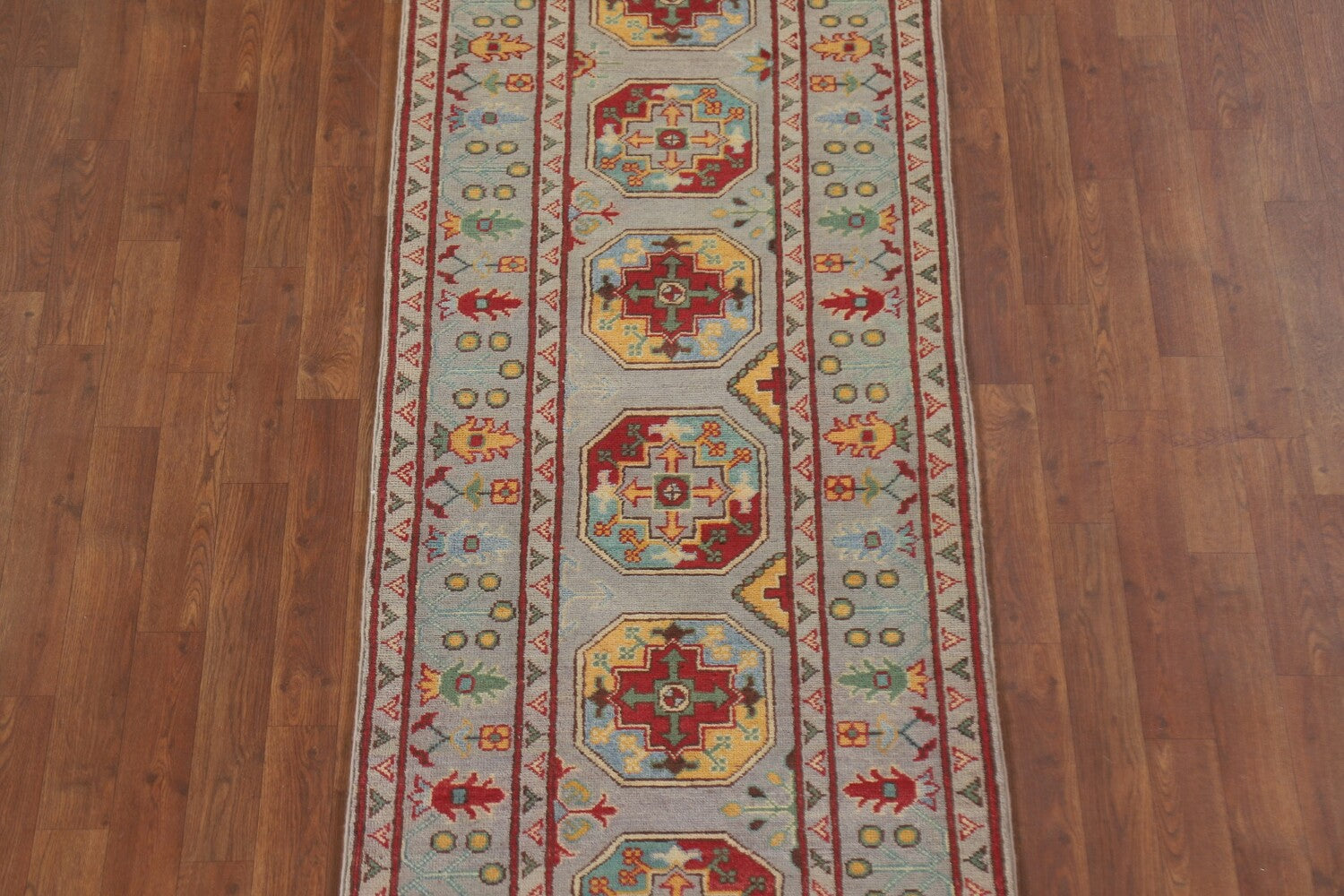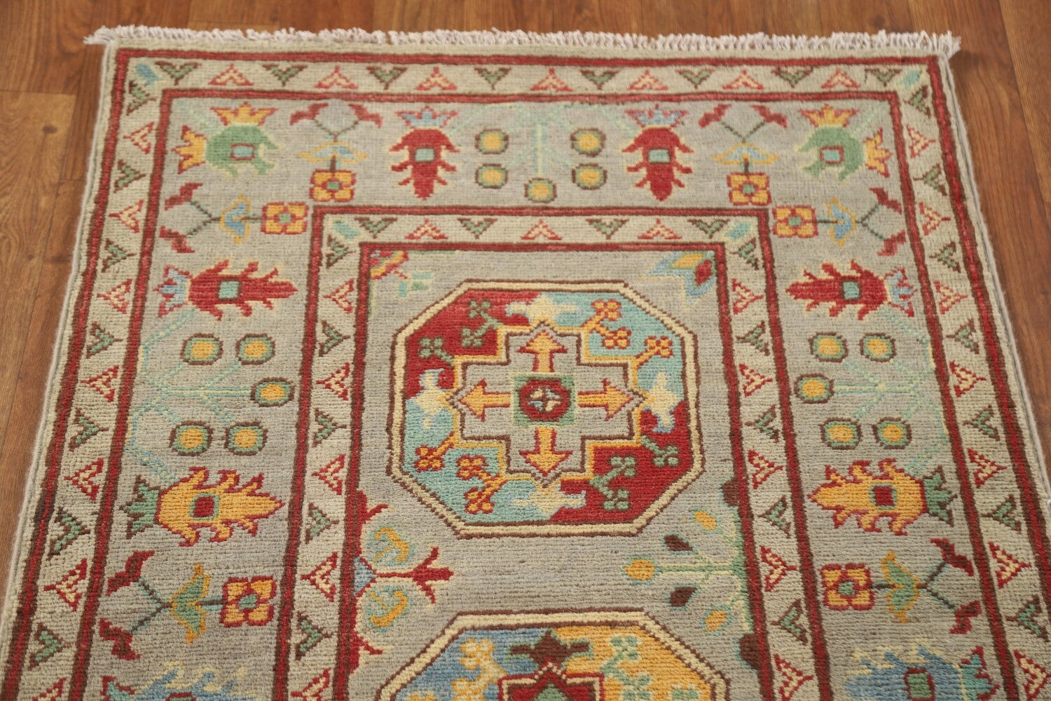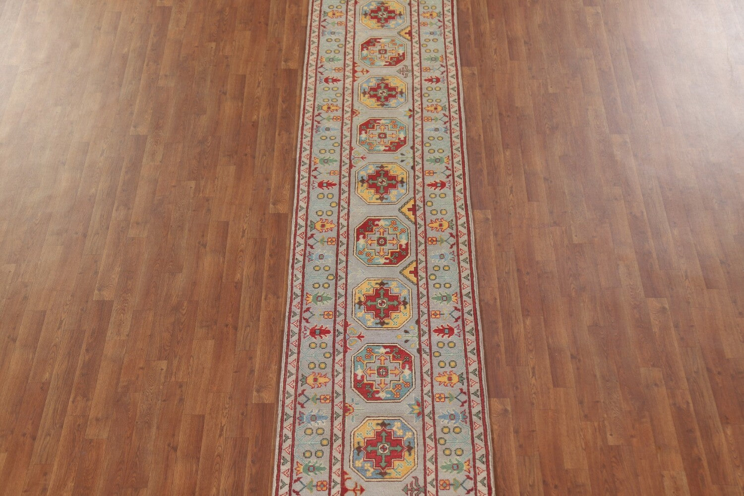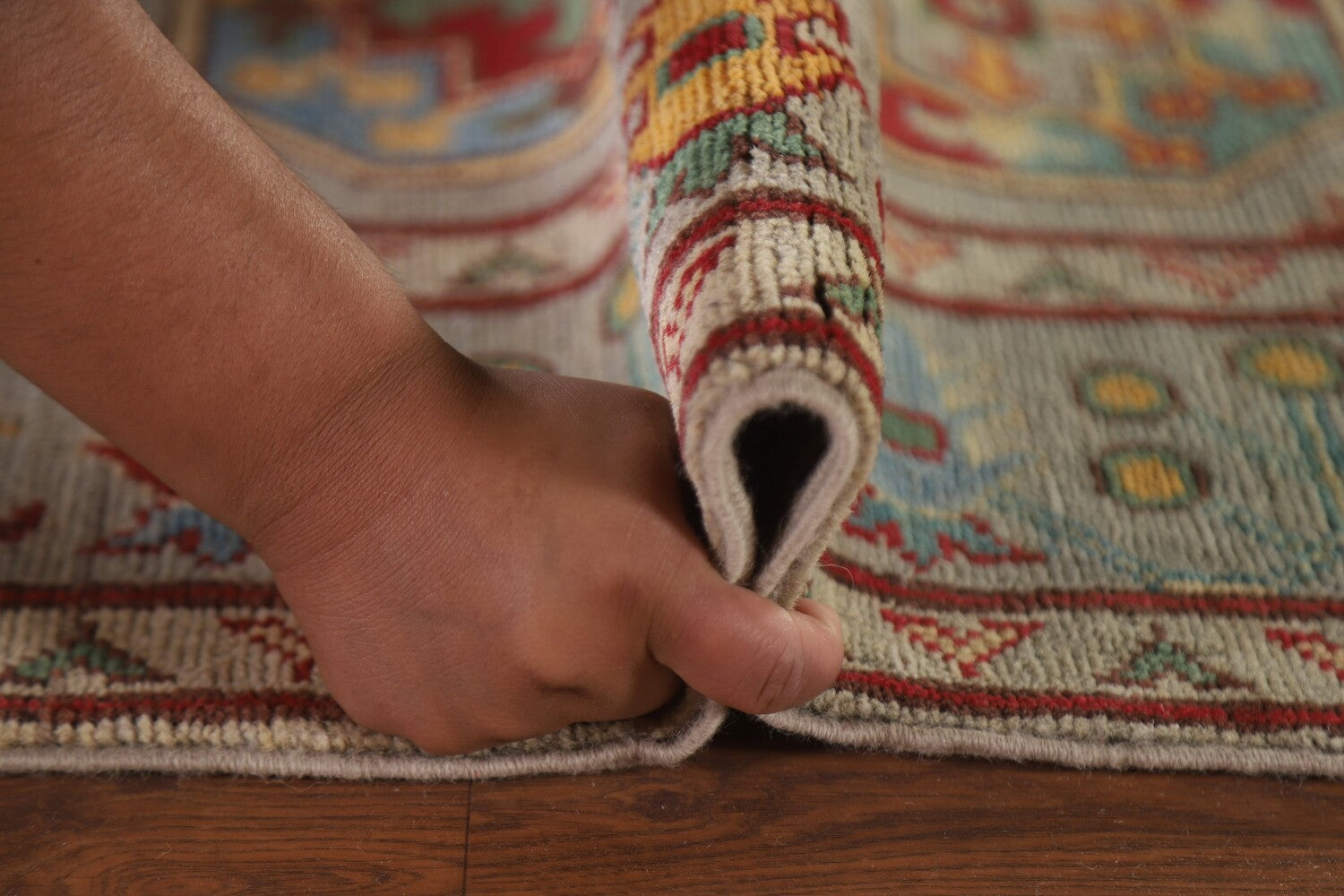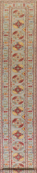 A Beautiful Genuine Pakistan Kazak rug is Hand Knotted by skillful weavers in Pakistan with 100% Wool Material. This rug is in New, First Quality condition. dimensions are 19' 10'' X 2' 6'' in foot and 605 X 76 in centimeter. the primary color is Multi-Colored.