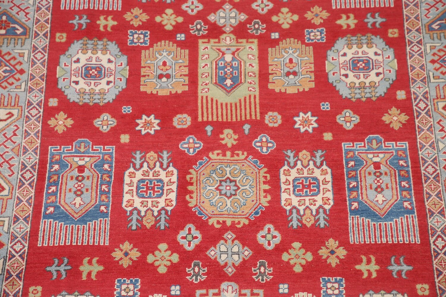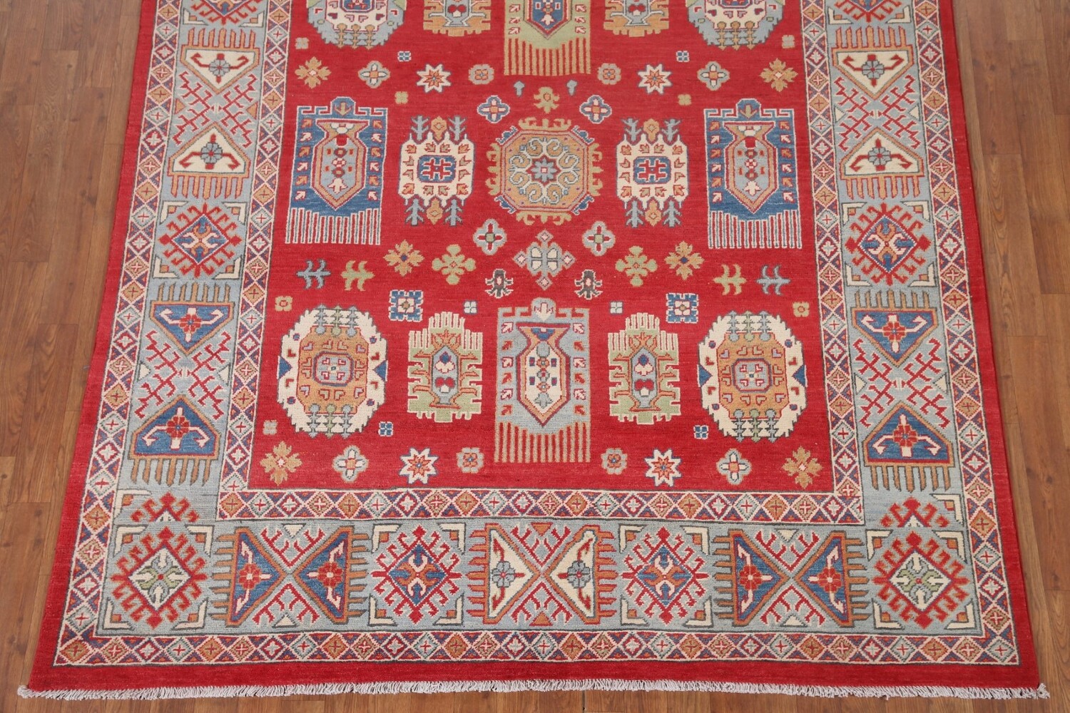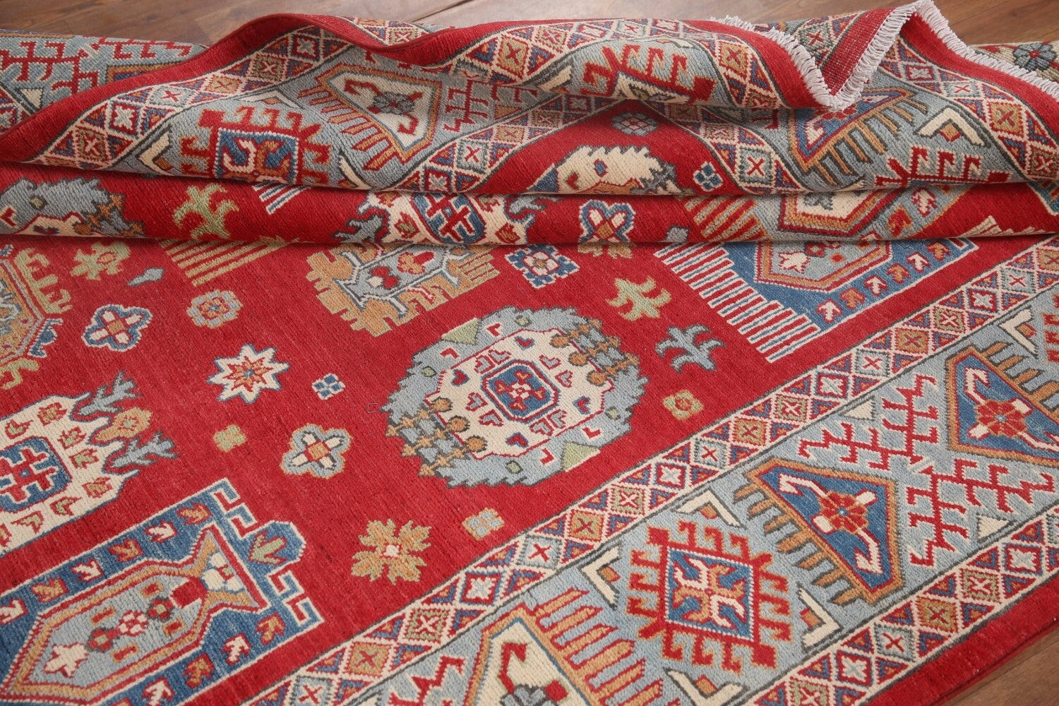 A Beautiful Genuine Pakistan Kazak rug is Hand Knotted by skillful weavers in Pakistan with 100% Wool Material. This rug is in New, First Quality condition. dimensions are 9' 8'' X 6' 4'' in foot and 295 X 193 in centimeter. the primary color is Red.