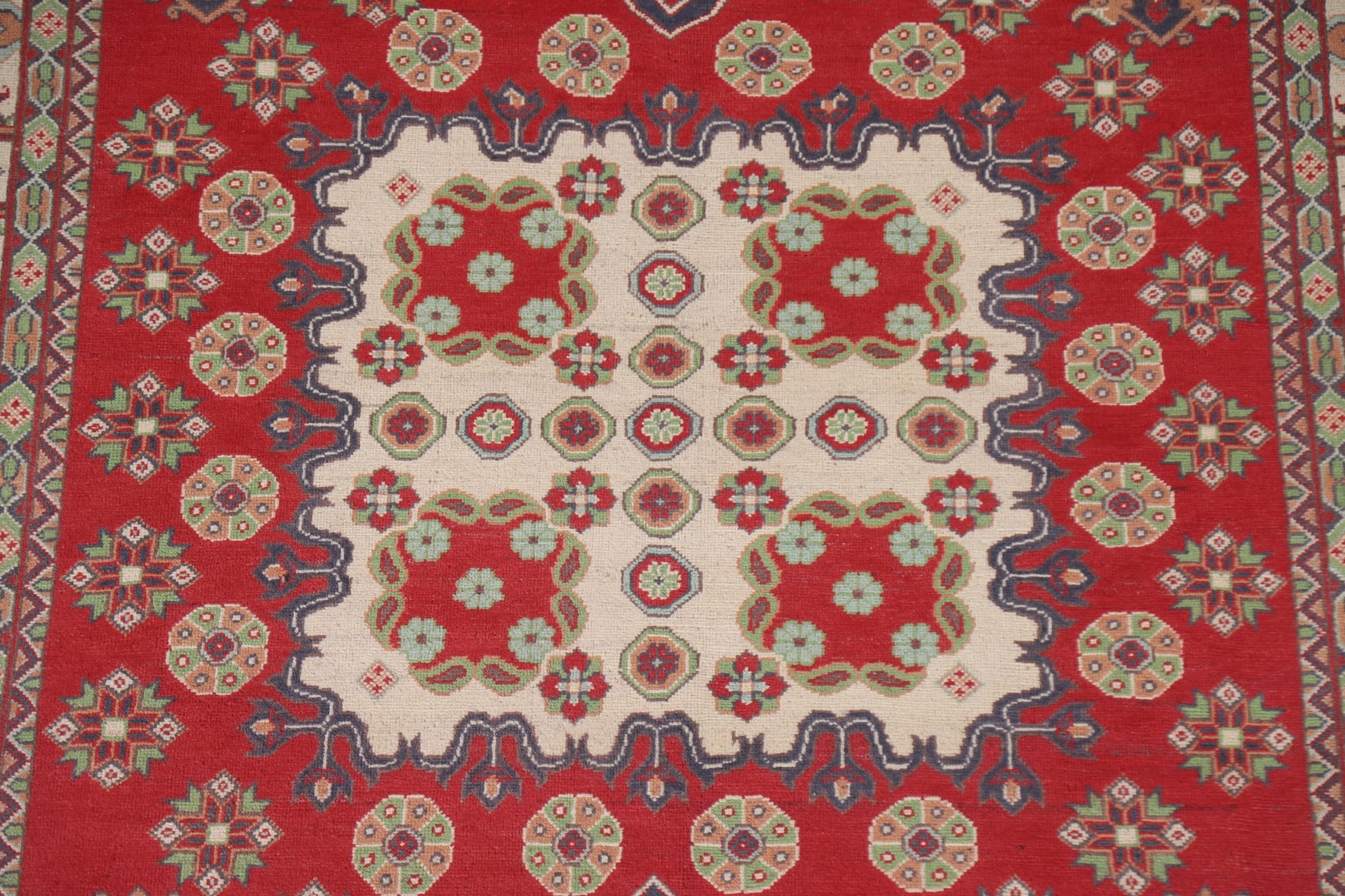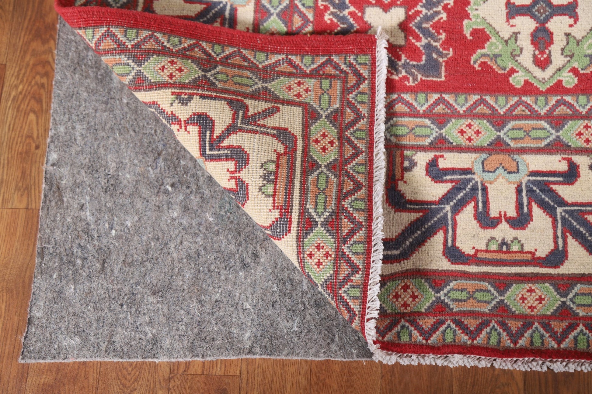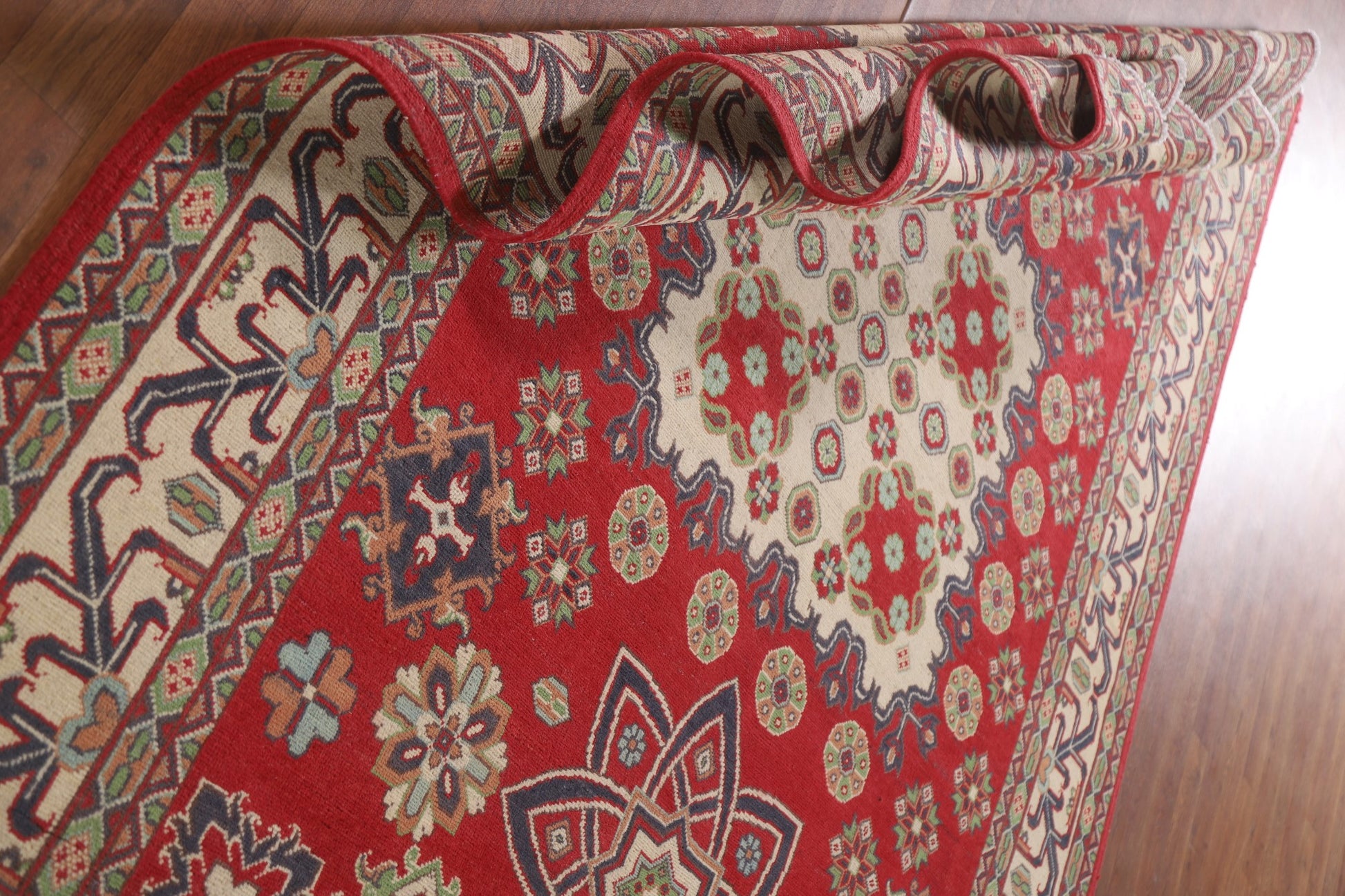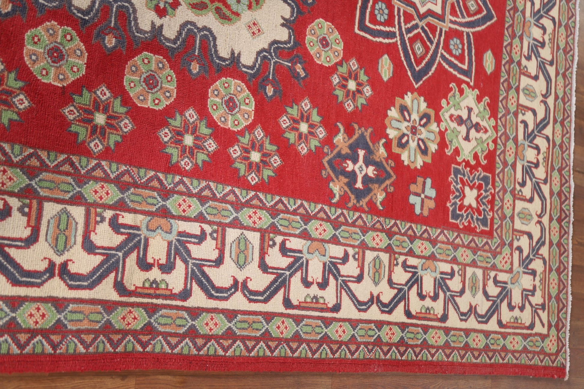 A Beautiful Genuine Pakistan Kazak rug is Hand Knotted by skillful weavers in Pakistan with 100% Wool Material. This rug is in New, First Quality condition. dimensions are 9' 8'' X 6' 6'' in foot and 295 X 198 in centimeter. the primary color is Red.