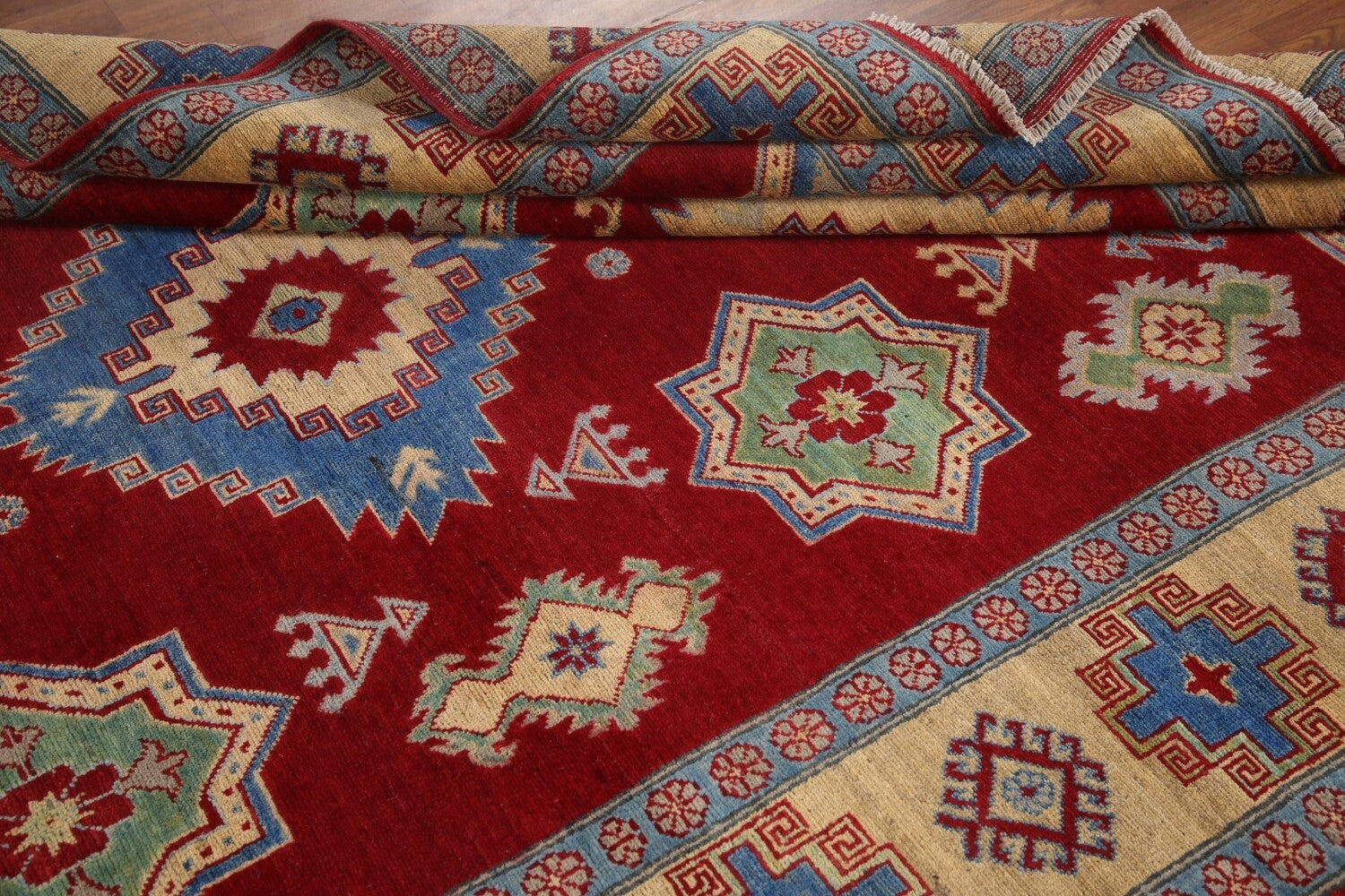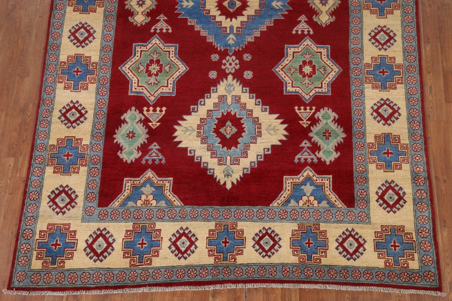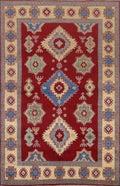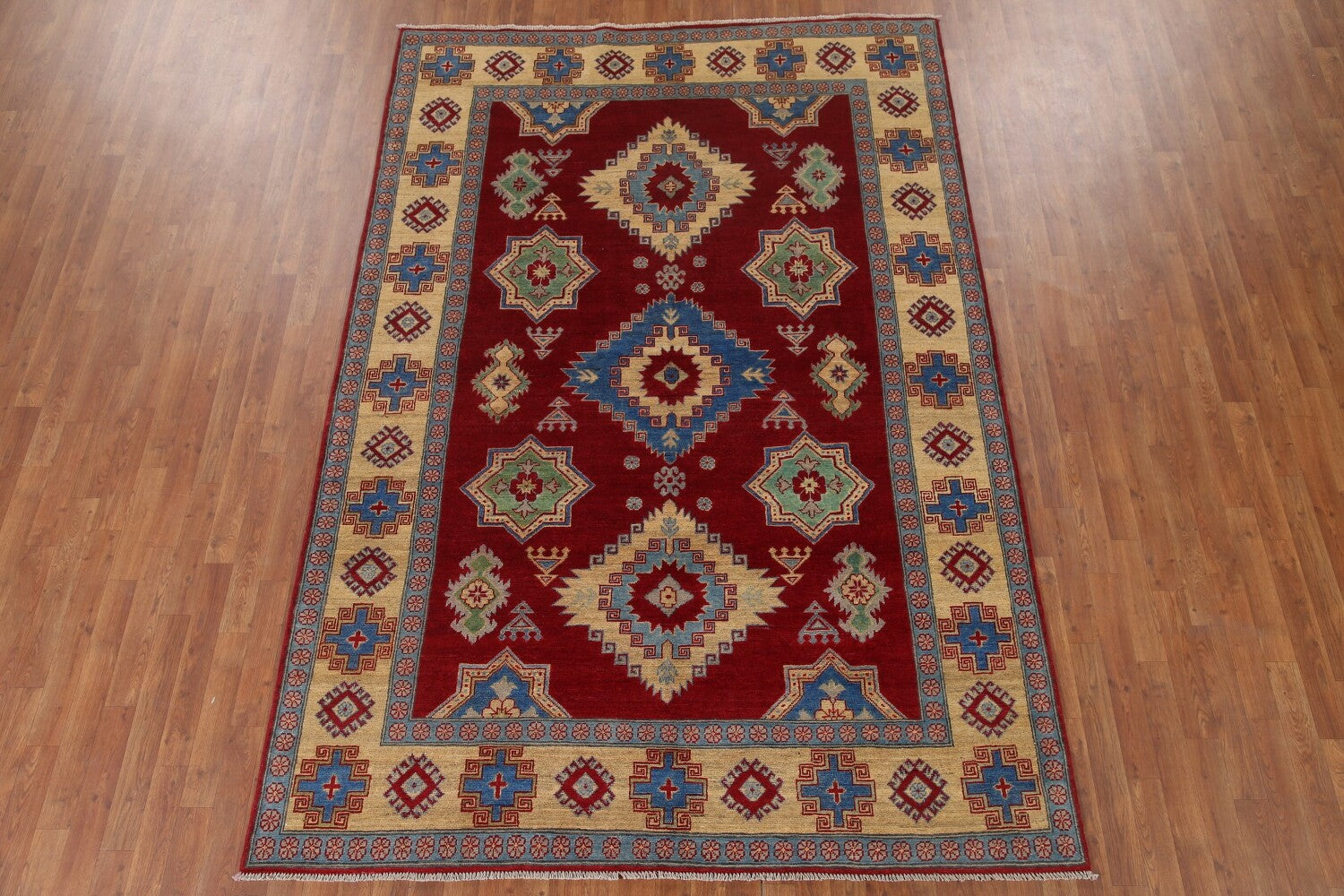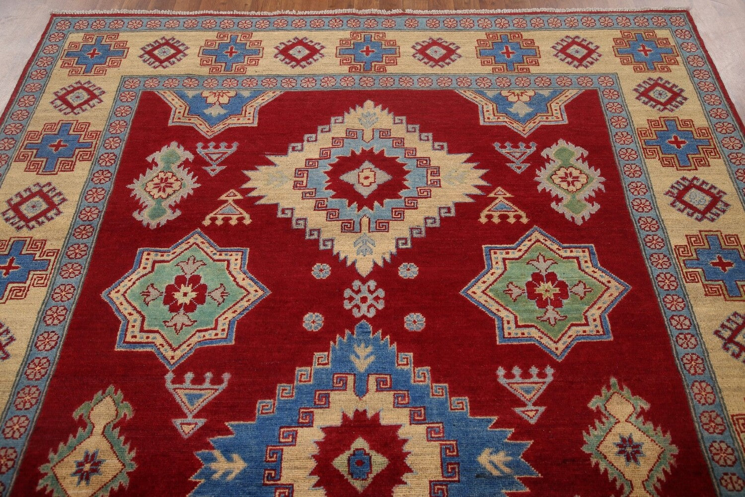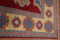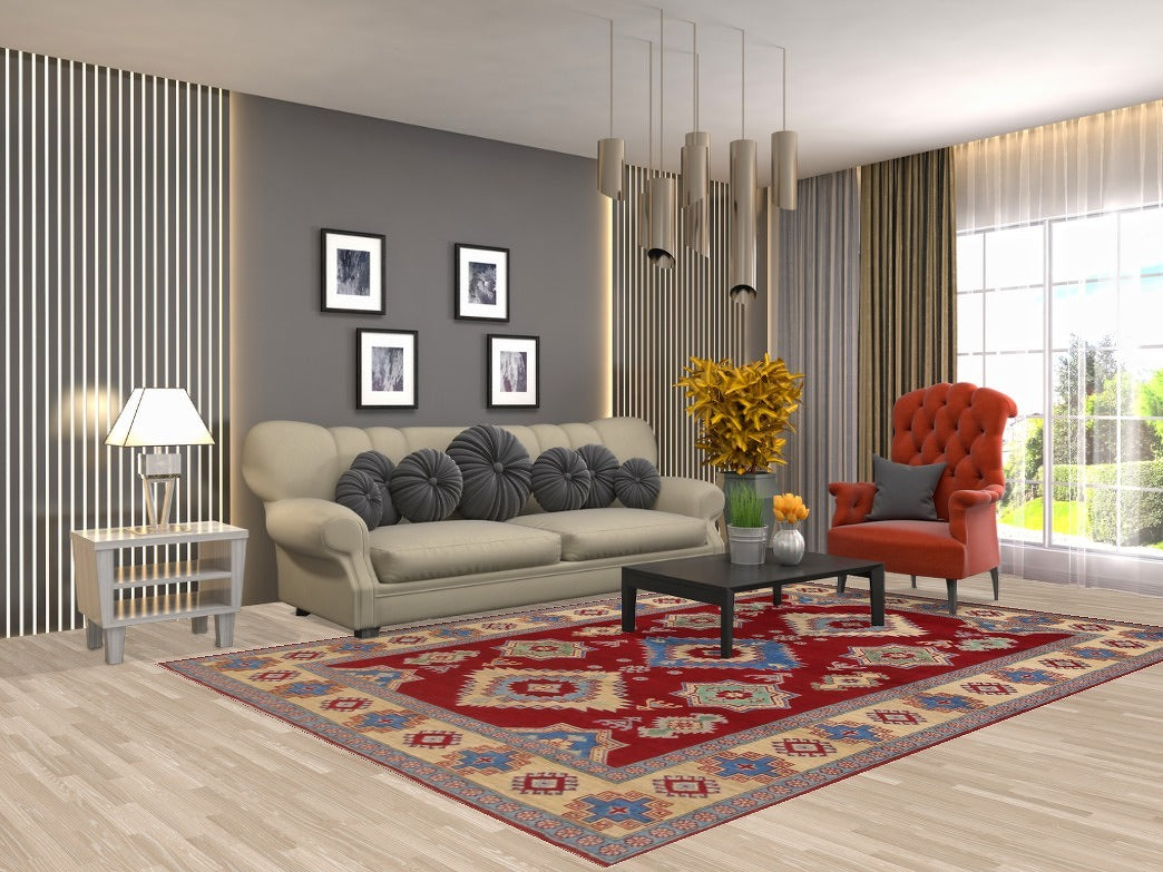 A Beautiful Genuine Pakistan Kazak rug is Hand Knotted by skillful weavers in Pakistan with 100% Wool Material. This rug is in New, First Quality condition. dimensions are 9' 8'' X 6' 7'' in foot and 295 X 201 in centimeter. the primary color is Red.