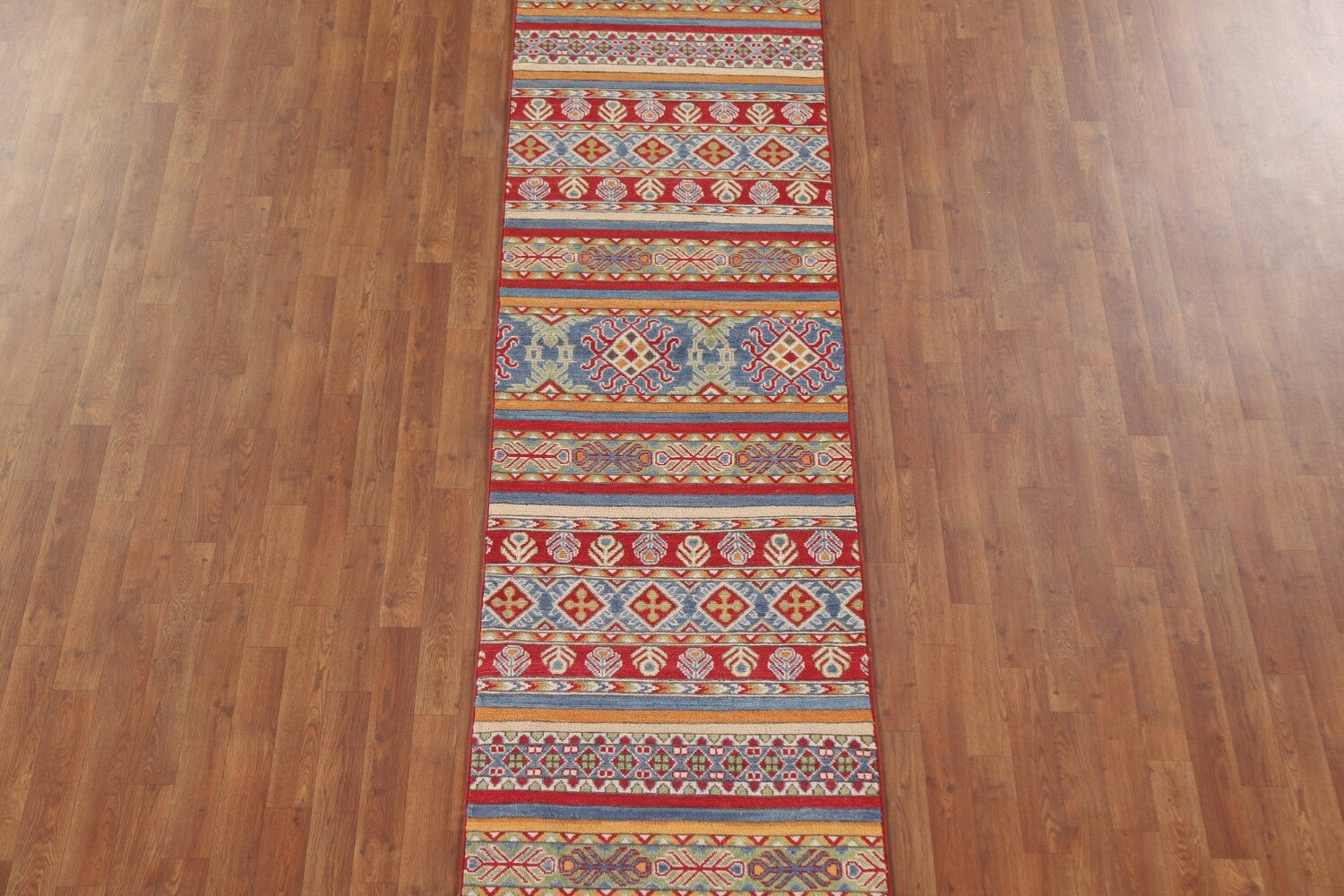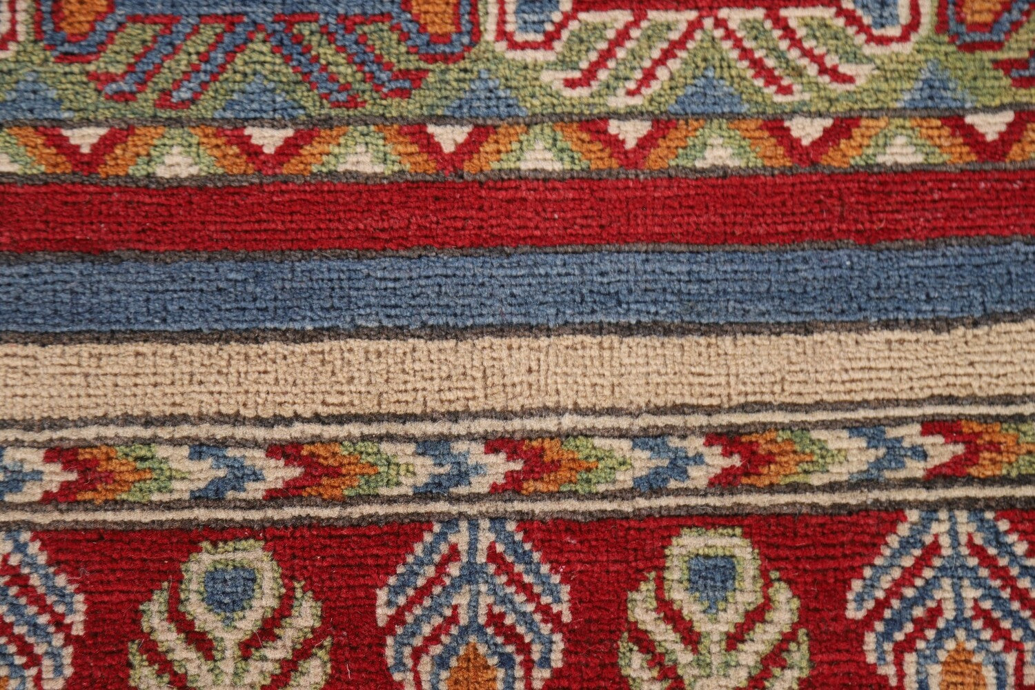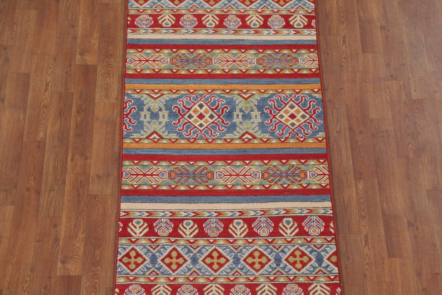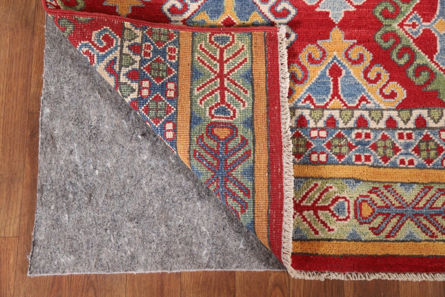 A Beautiful Genuine Pakistan Kazak rug is Hand Knotted by skillful weavers in Pakistan with 100% Wool Material. This rug is in New, First Quality condition. dimensions are 13' 10'' X 2' 6'' in foot and 422 X 76 in centimeter. the primary color is Multi-Colored.