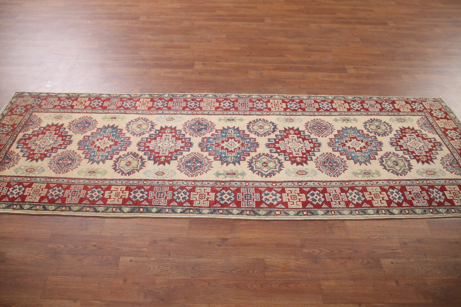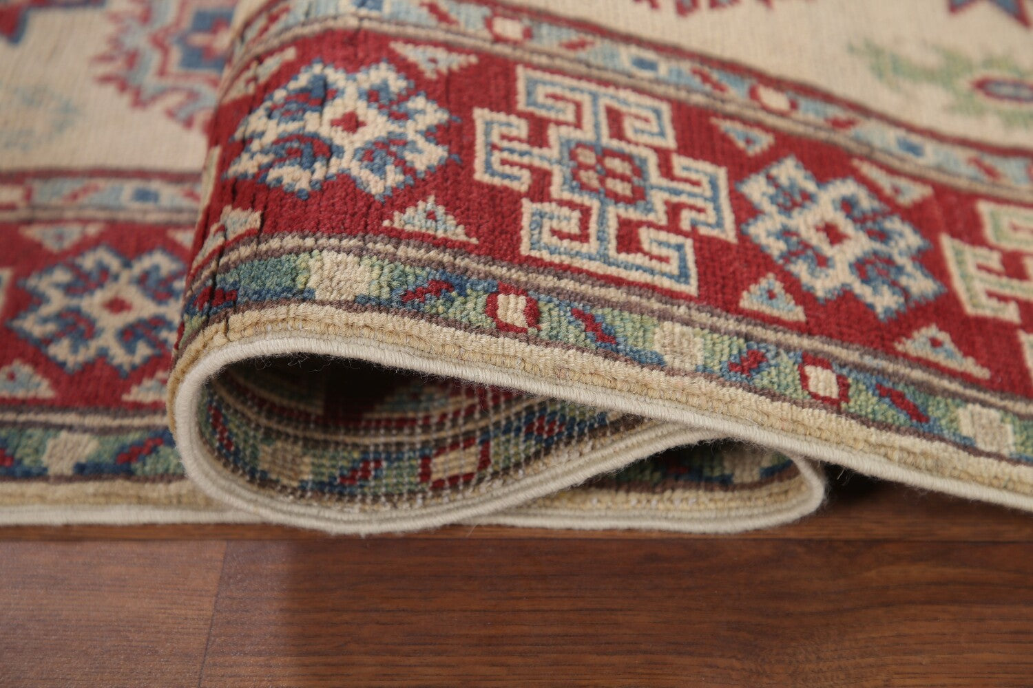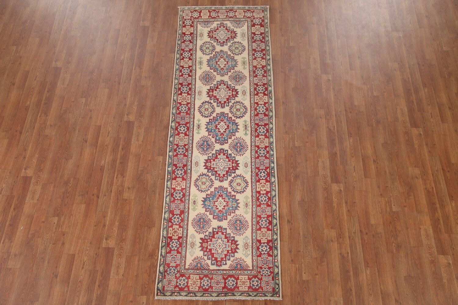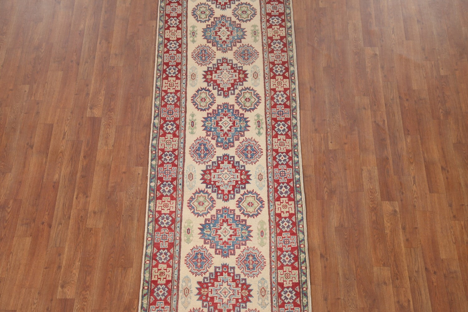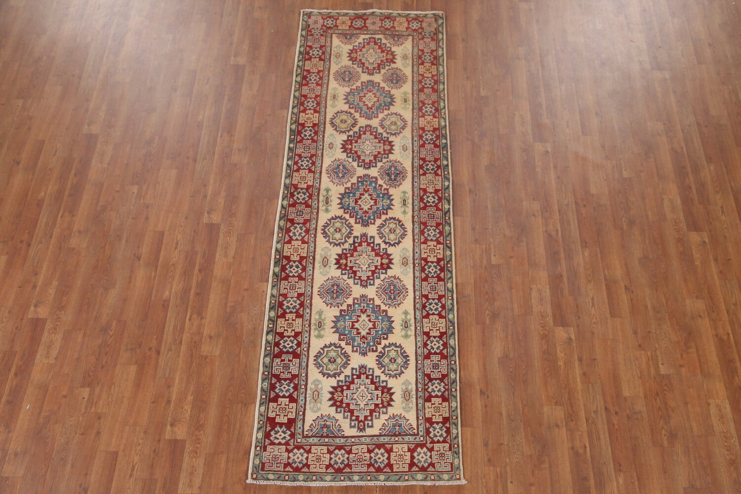 A Beautiful Genuine Pakistan Kazak rug is Hand Knotted by skillful weavers in Pakistan with 100% Wool Material. This rug is in New, First Quality condition. dimensions are 8' 5'' X 2' 9'' in foot and 257 X 84 in centimeter. the primary color is Beige & Ivories.