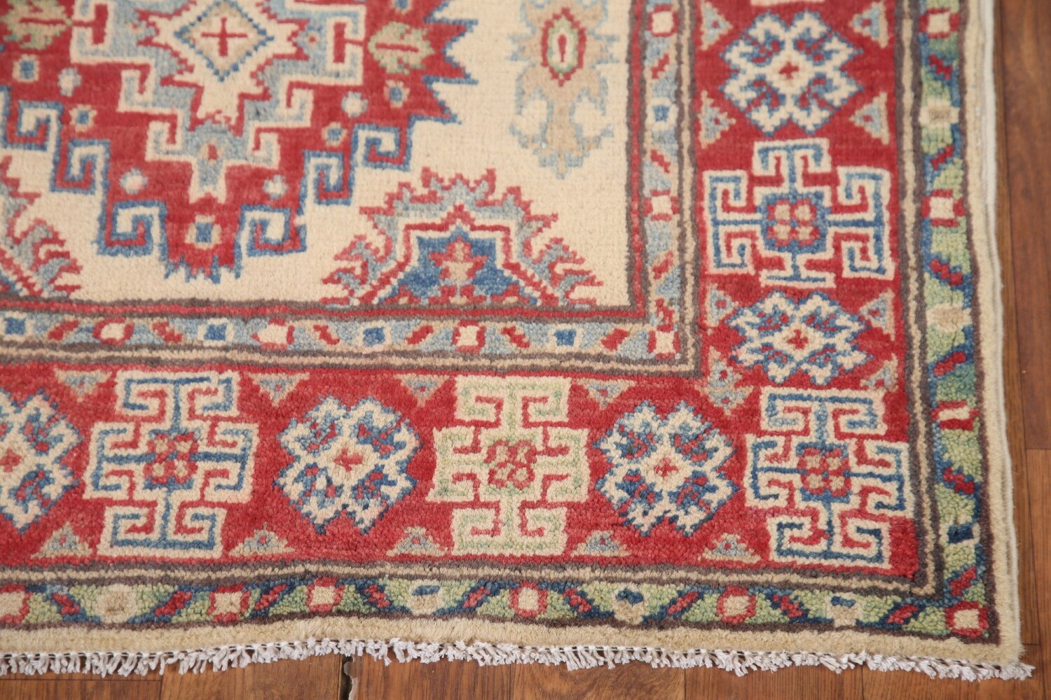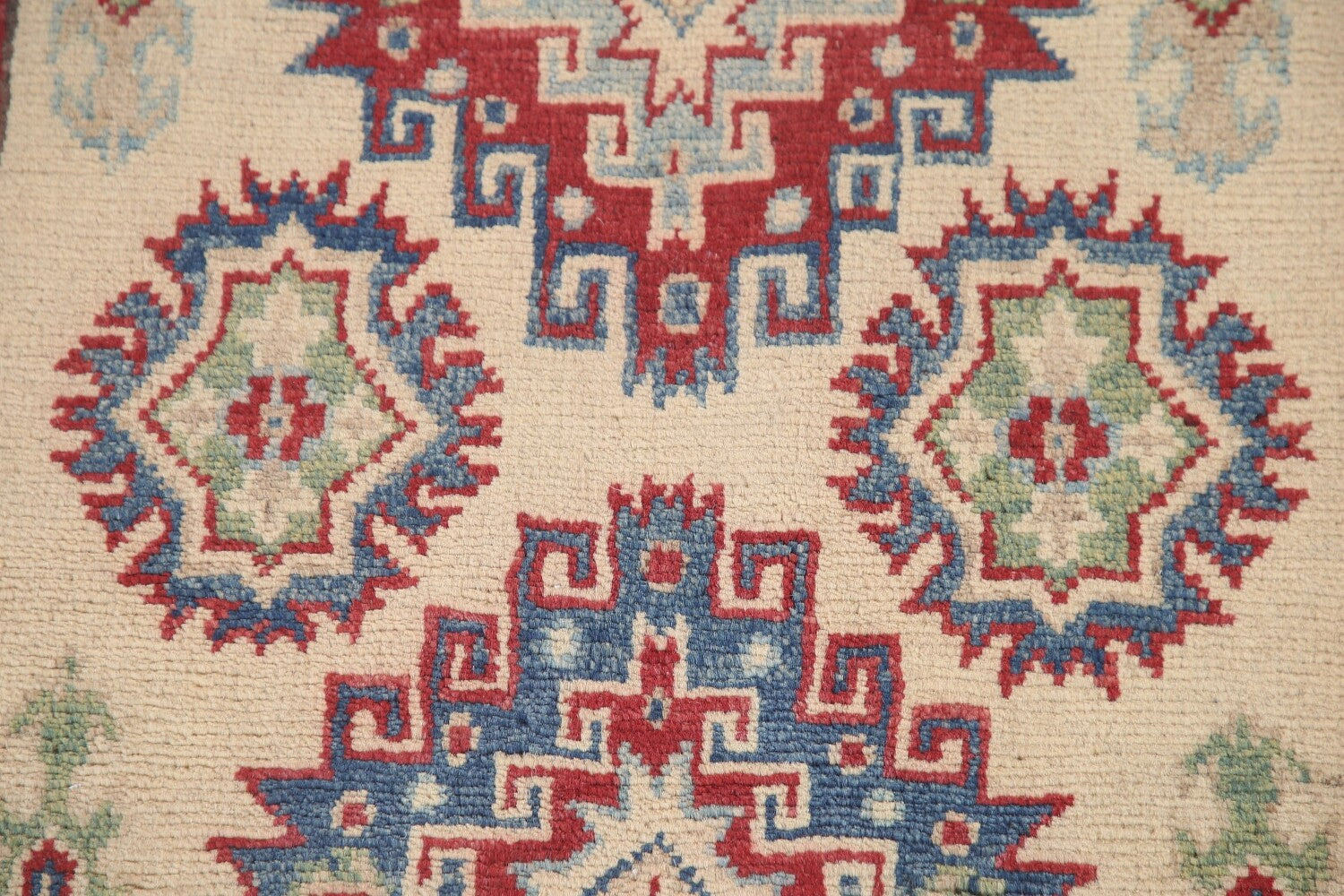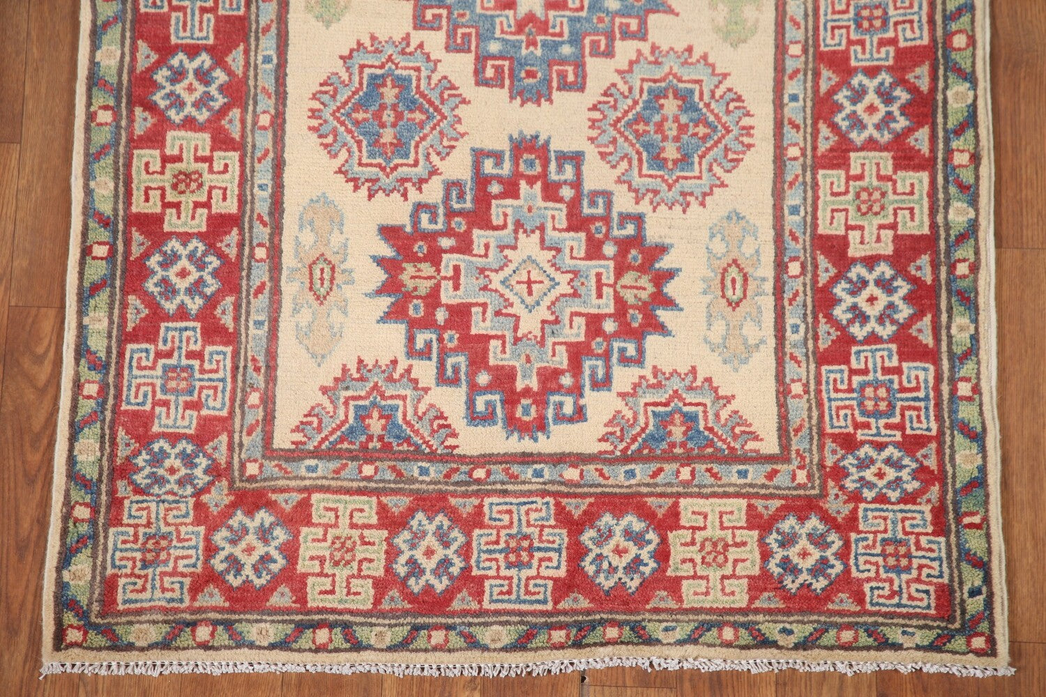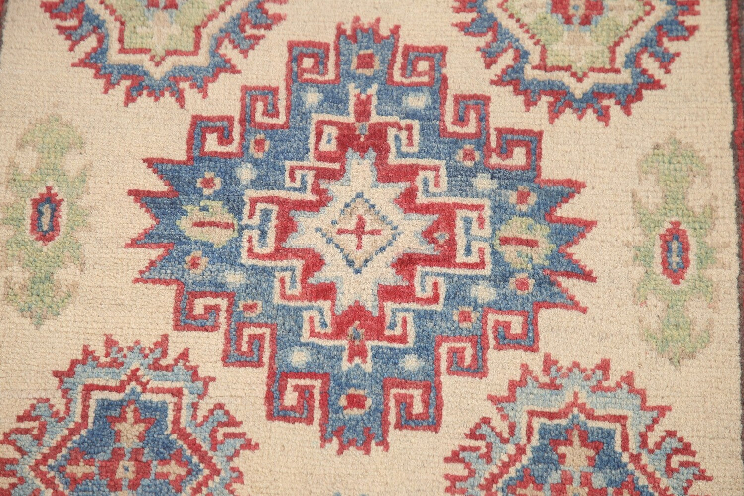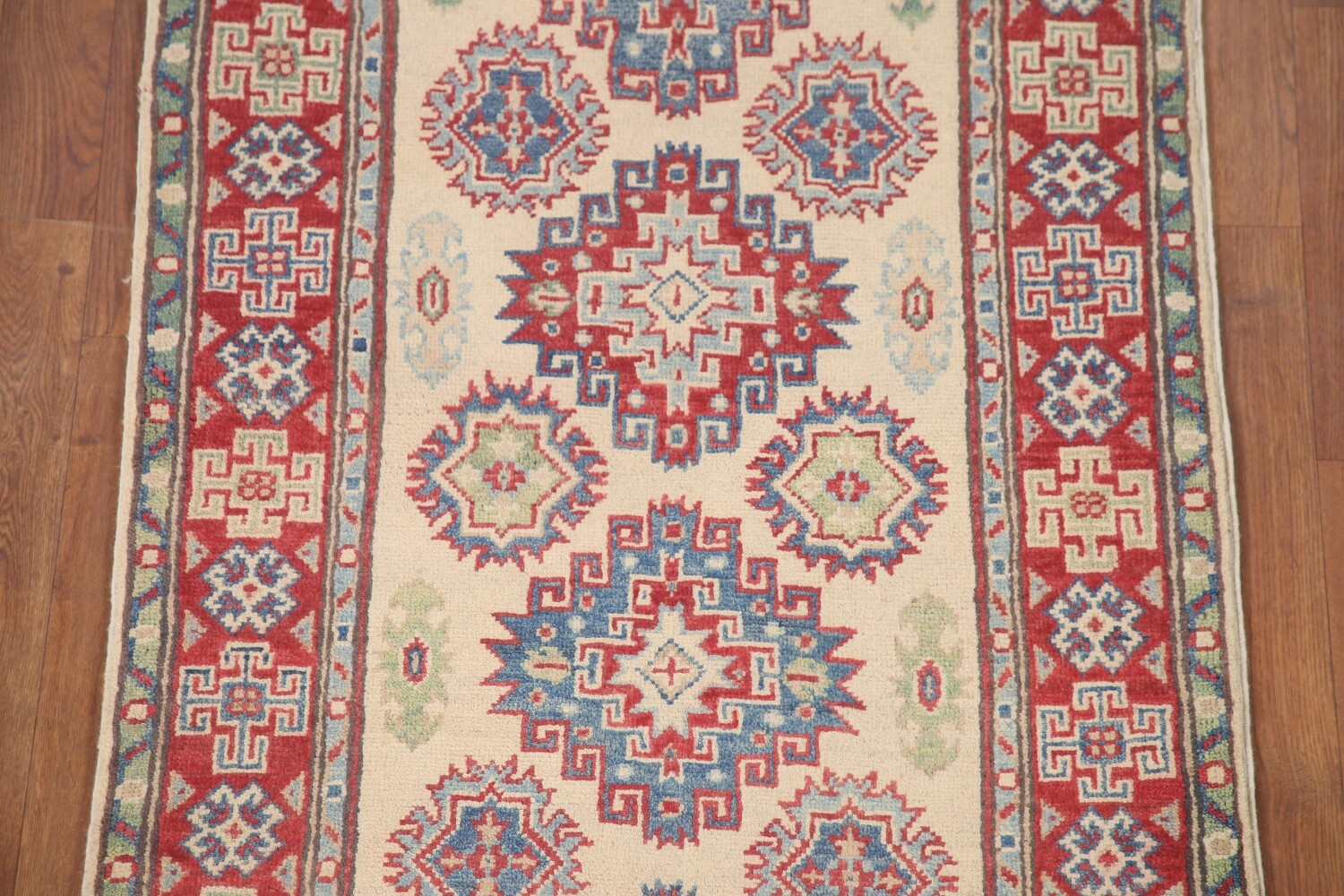 A Beautiful Genuine Pakistan Kazak rug is Hand Knotted by skillful weavers in Pakistan with 100% Wool Material. This rug is in New, First Quality condition. dimensions are 8' 5'' X 2' 9'' in foot and 257 X 84 in centimeter. the primary color is Beige & Ivories.