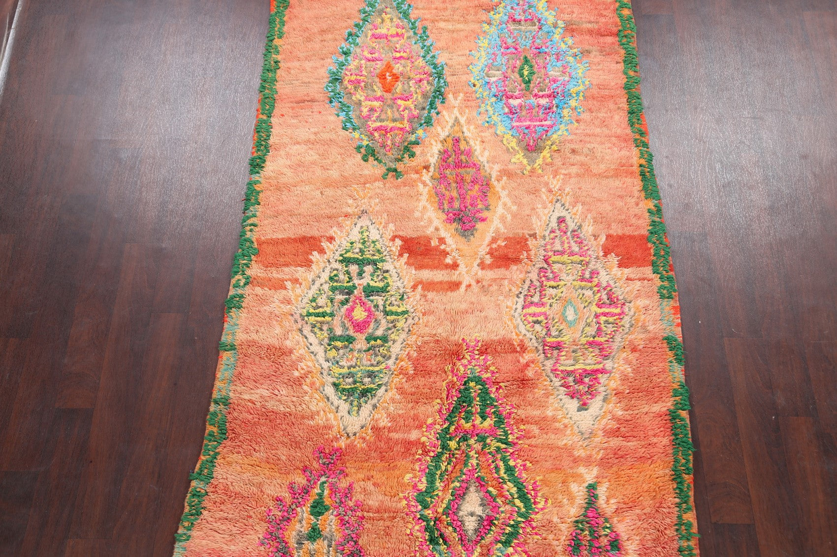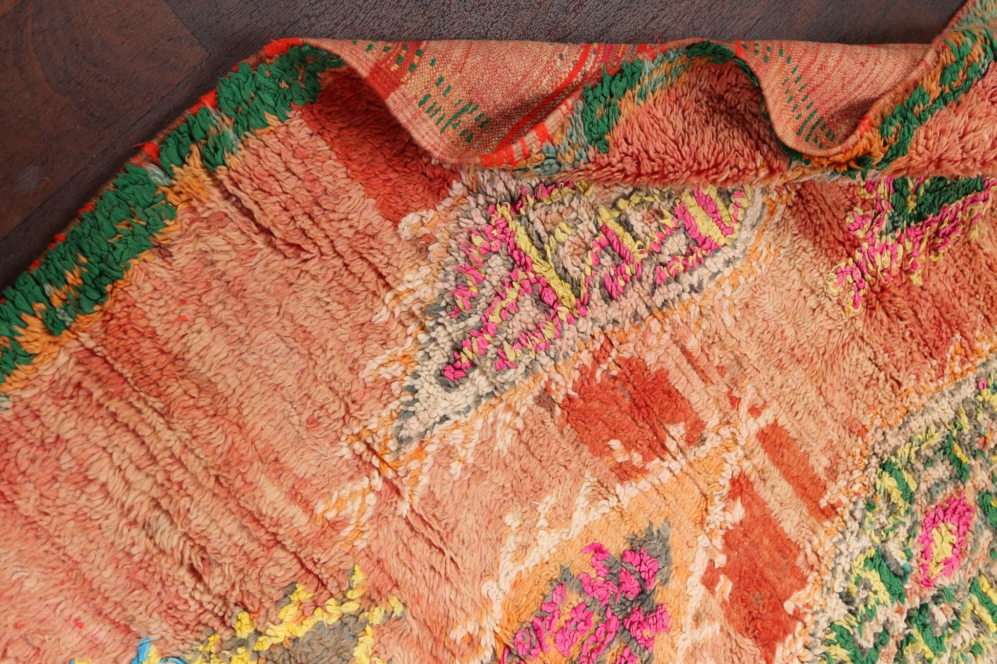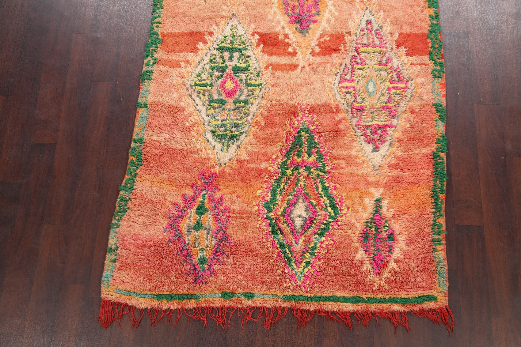 A Beautiful Genuine Morocco Moroccan rug is Hand Knotted by skillful weavers in Morocco with 100% Wool Material. This rug is in Very Good (Abrash) condition. dimensions are 9' 3'' X 4' 10'' in foot and 282 X 147 in centimeter. the primary color is Peach.
