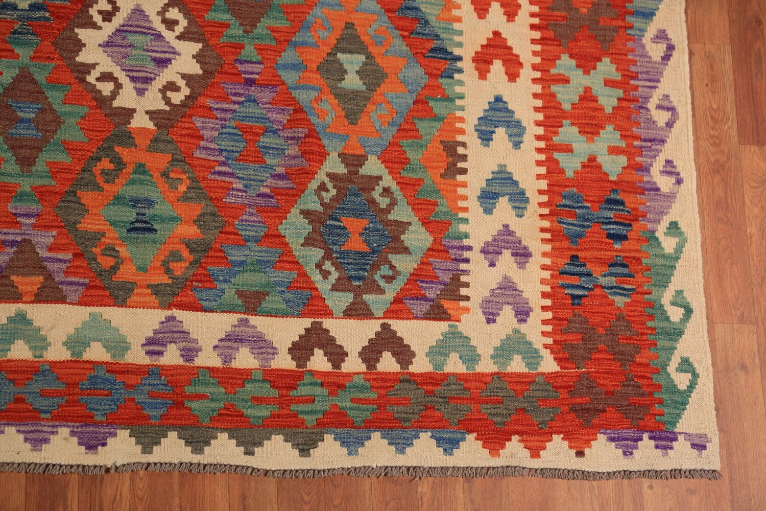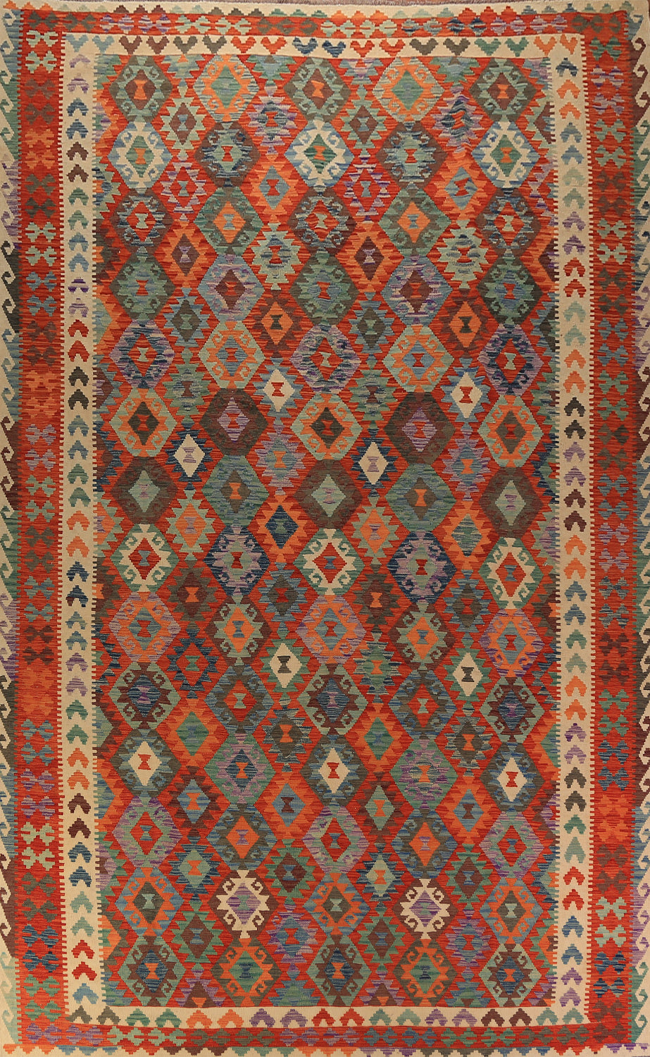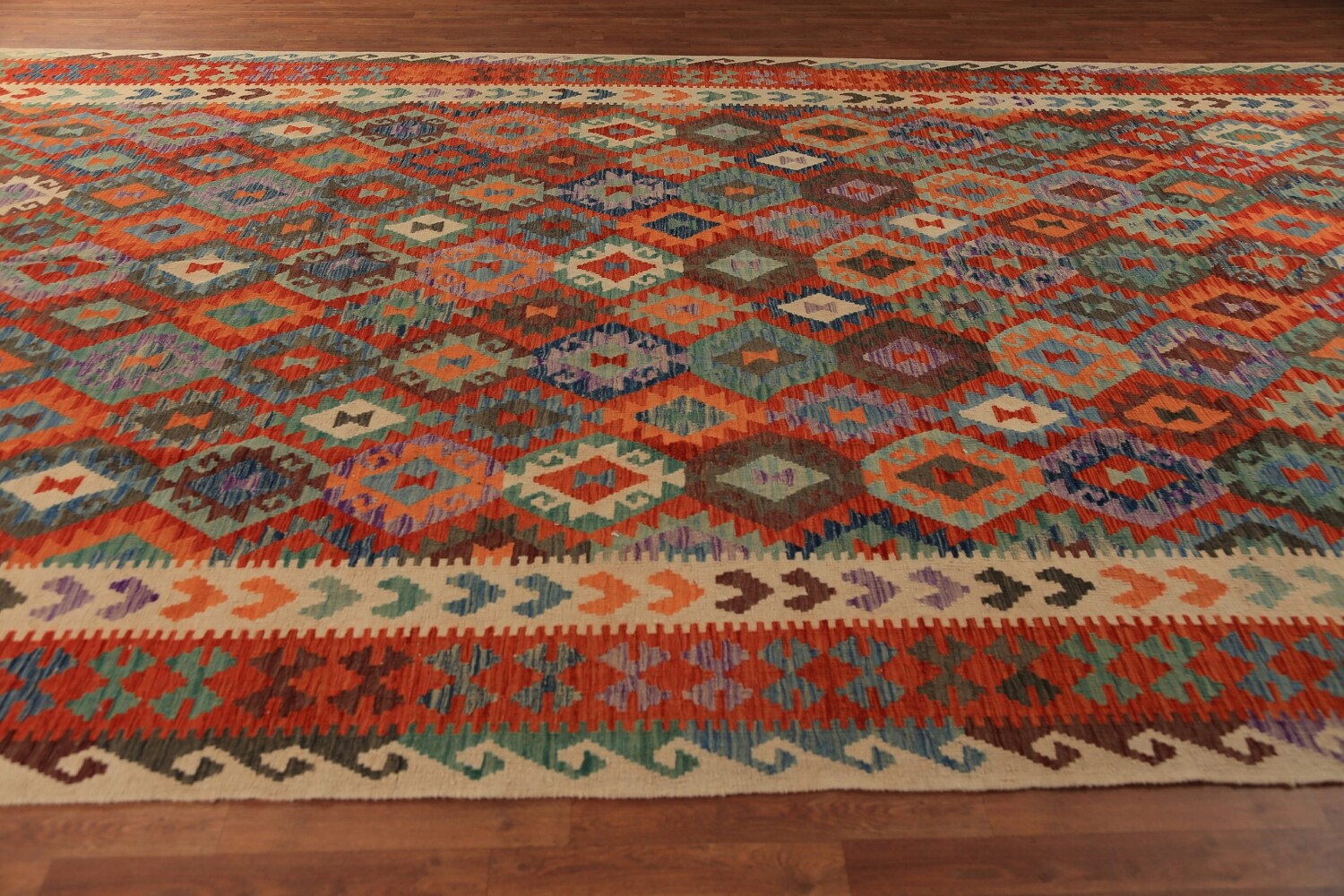 A Beautiful Genuine Pakistan Kilim rug is Hand Woven by skillful weavers in Pakistan with 100% Wool Material. This rug is in New, First Quality condition. dimensions are 16' 1'' X 9' 8'' in foot and 490 X 295 in centimeter. the primary color is Multi-Colored.
