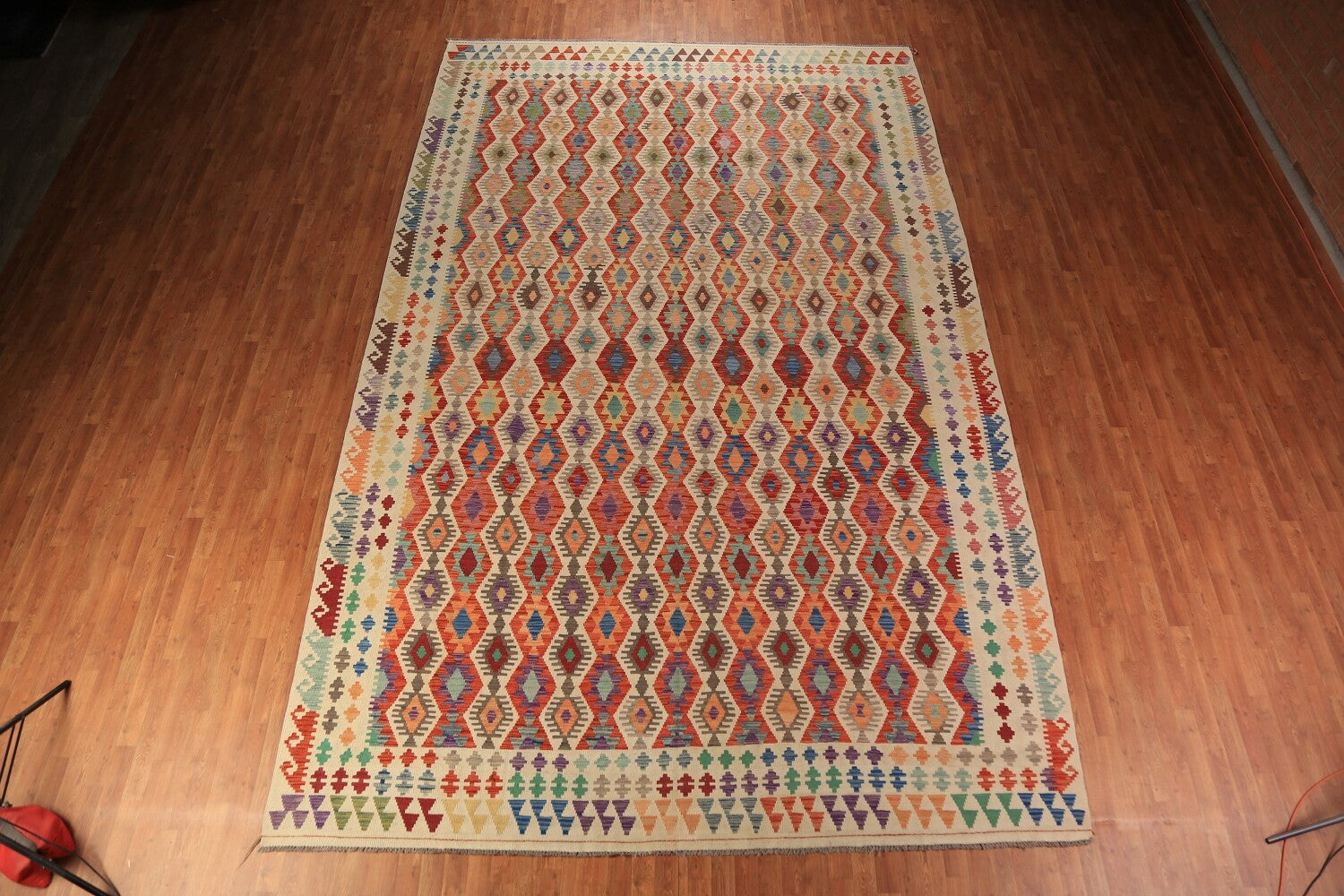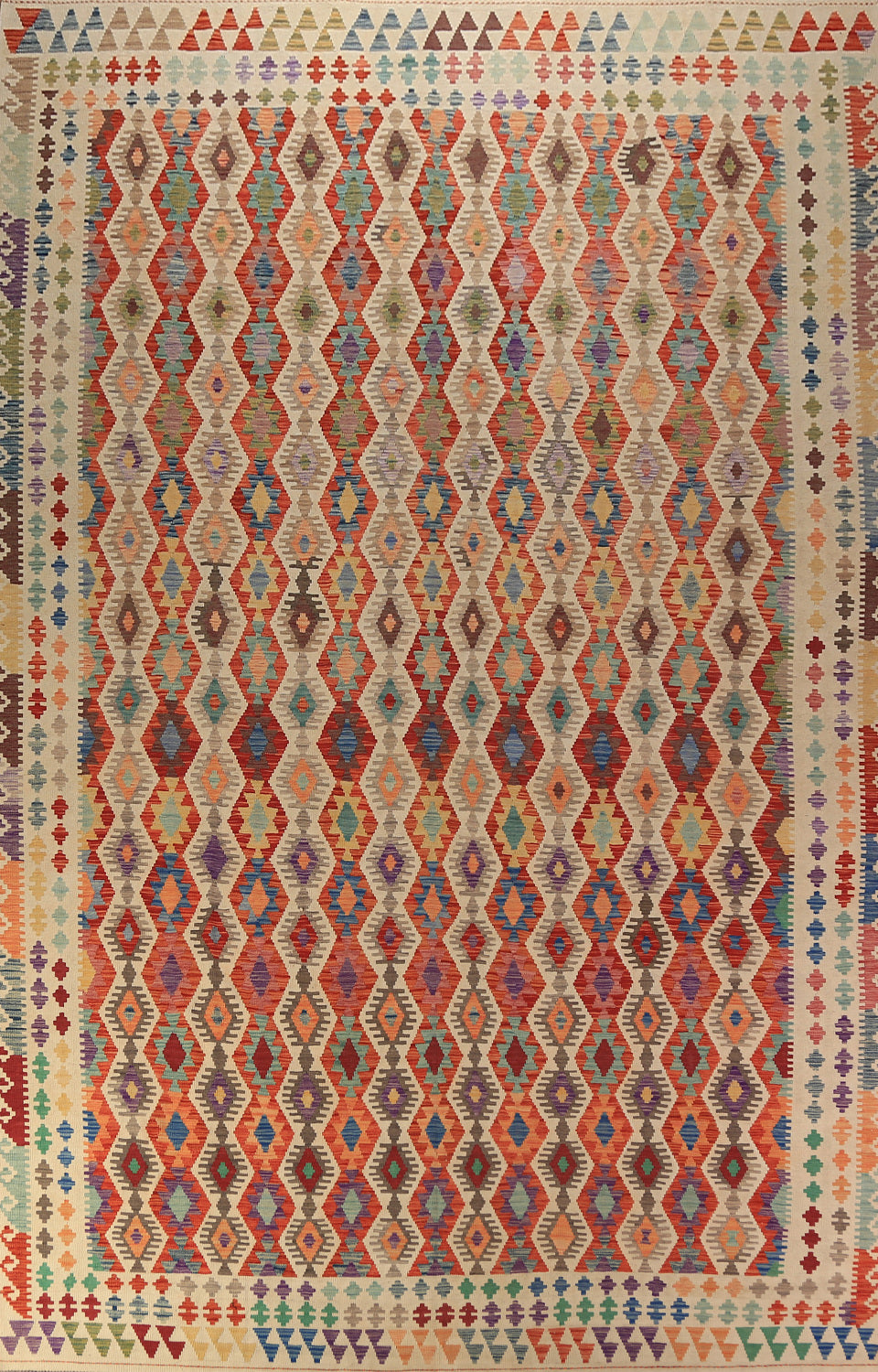 A Beautiful Genuine Pakistan Kilim rug is Hand Woven by skillful weavers in Pakistan with 100% Wool Material. This rug is in New, First Quality condition. dimensions are 16' 0'' X 10' 1'' in foot and 488 X 307 in centimeter. the primary color is Multi-Colored.