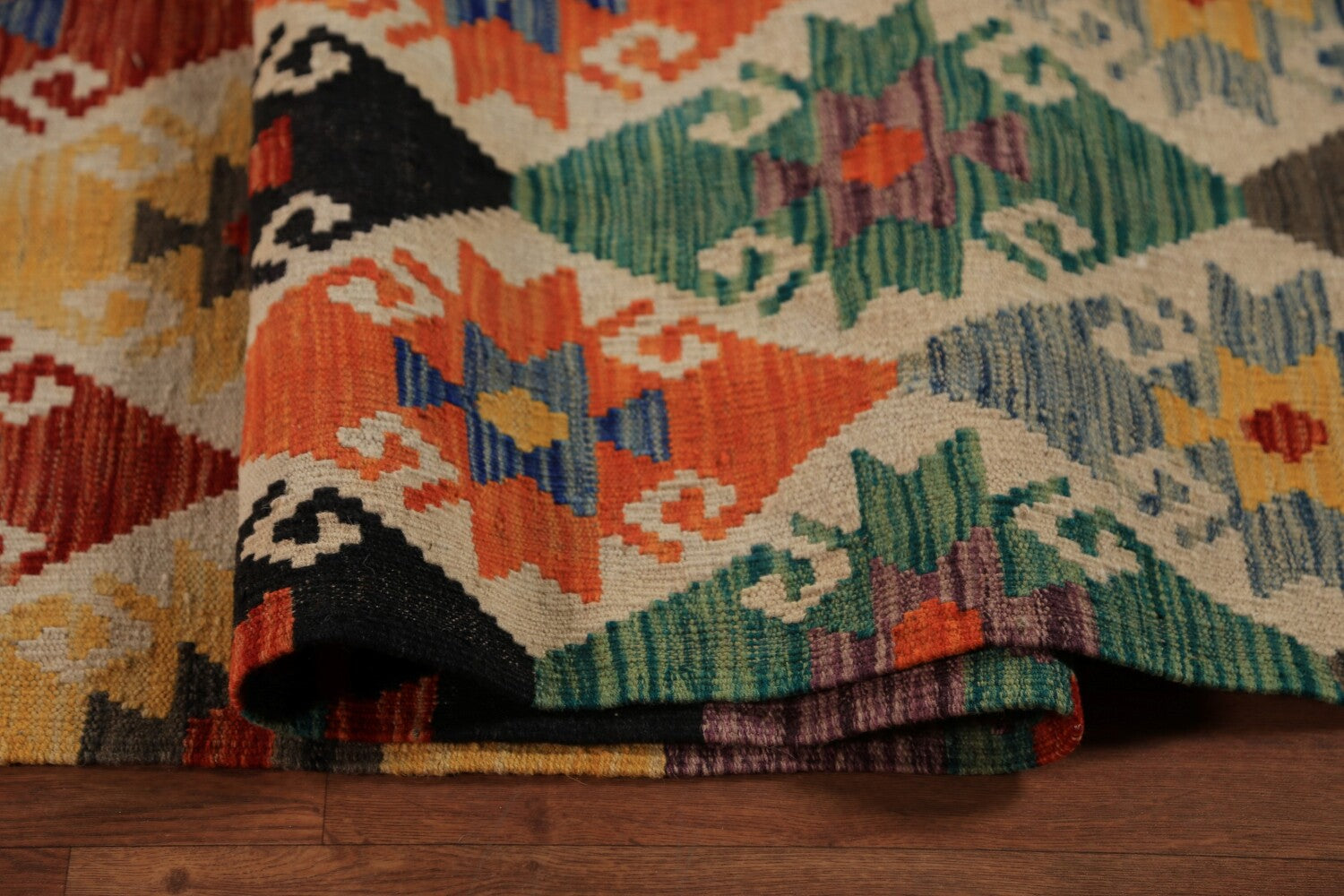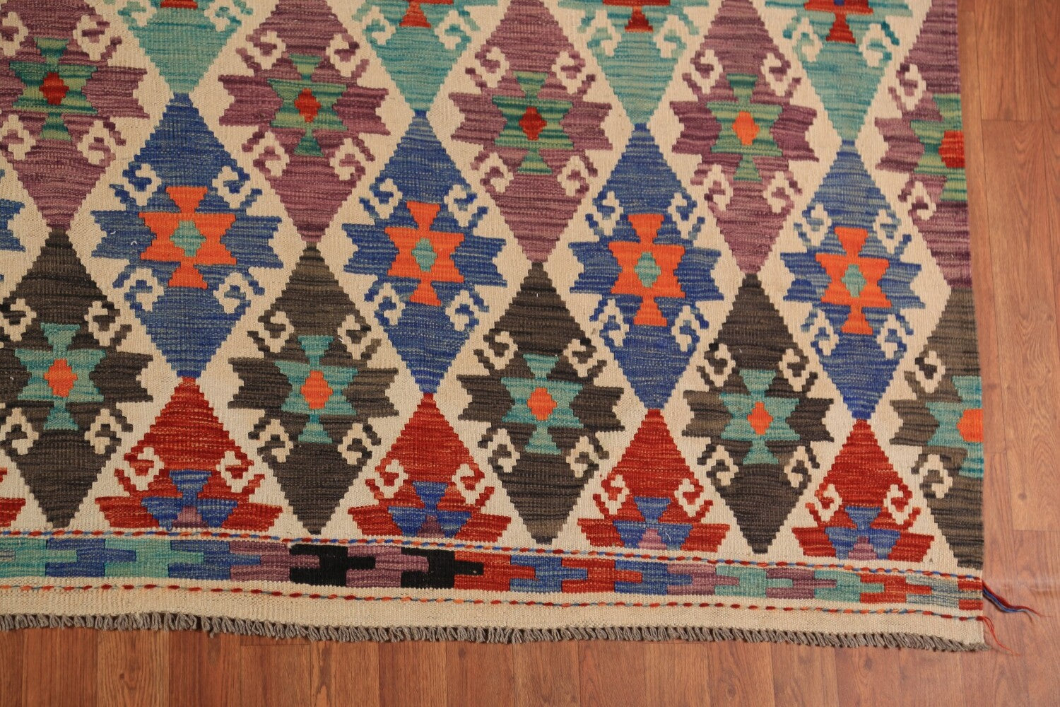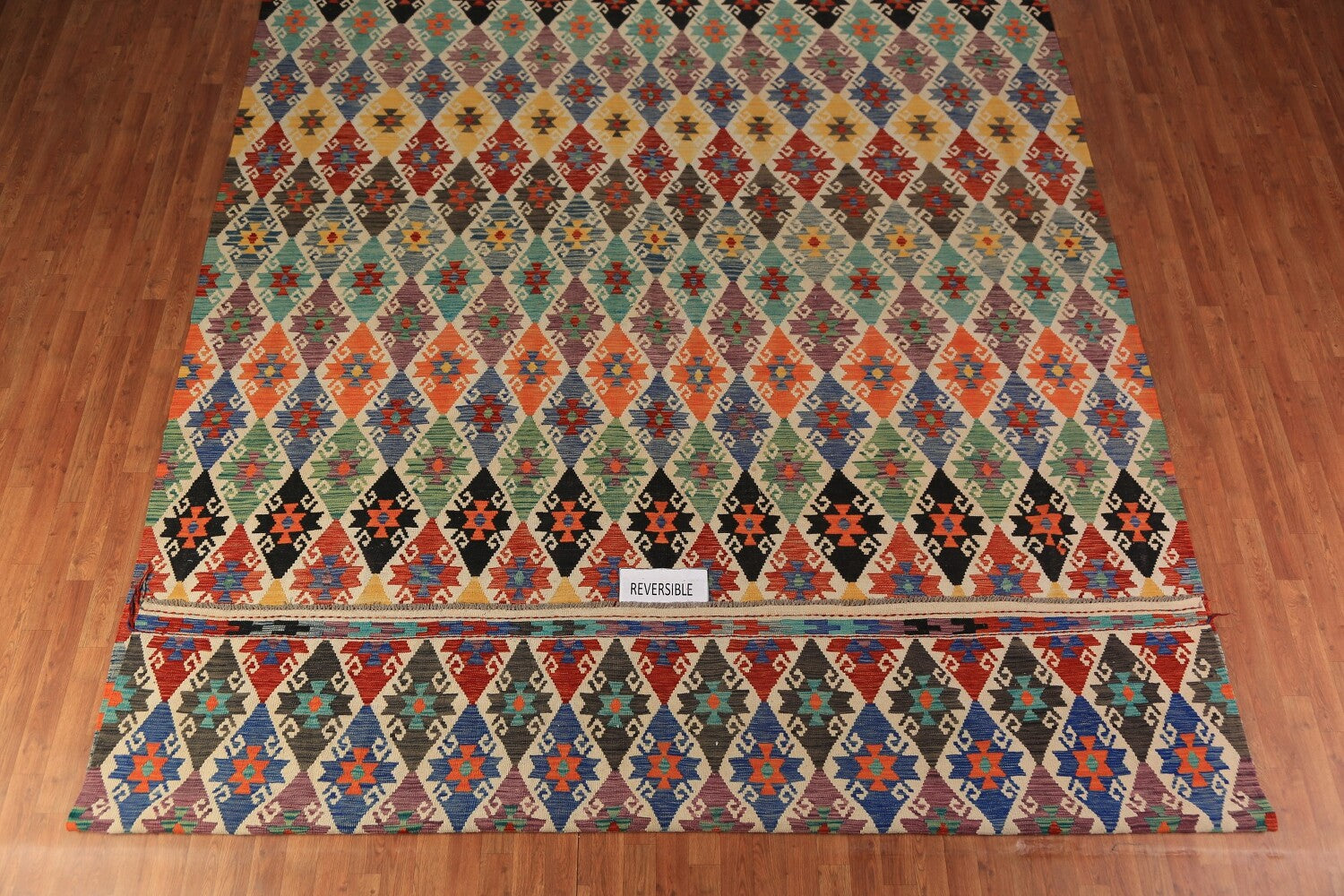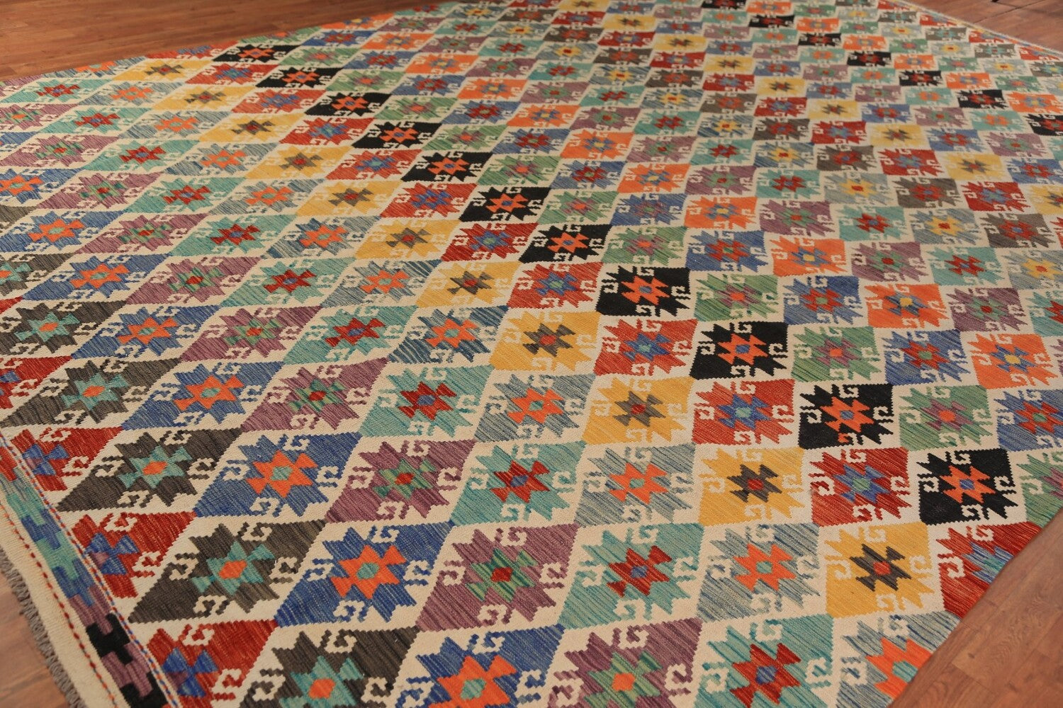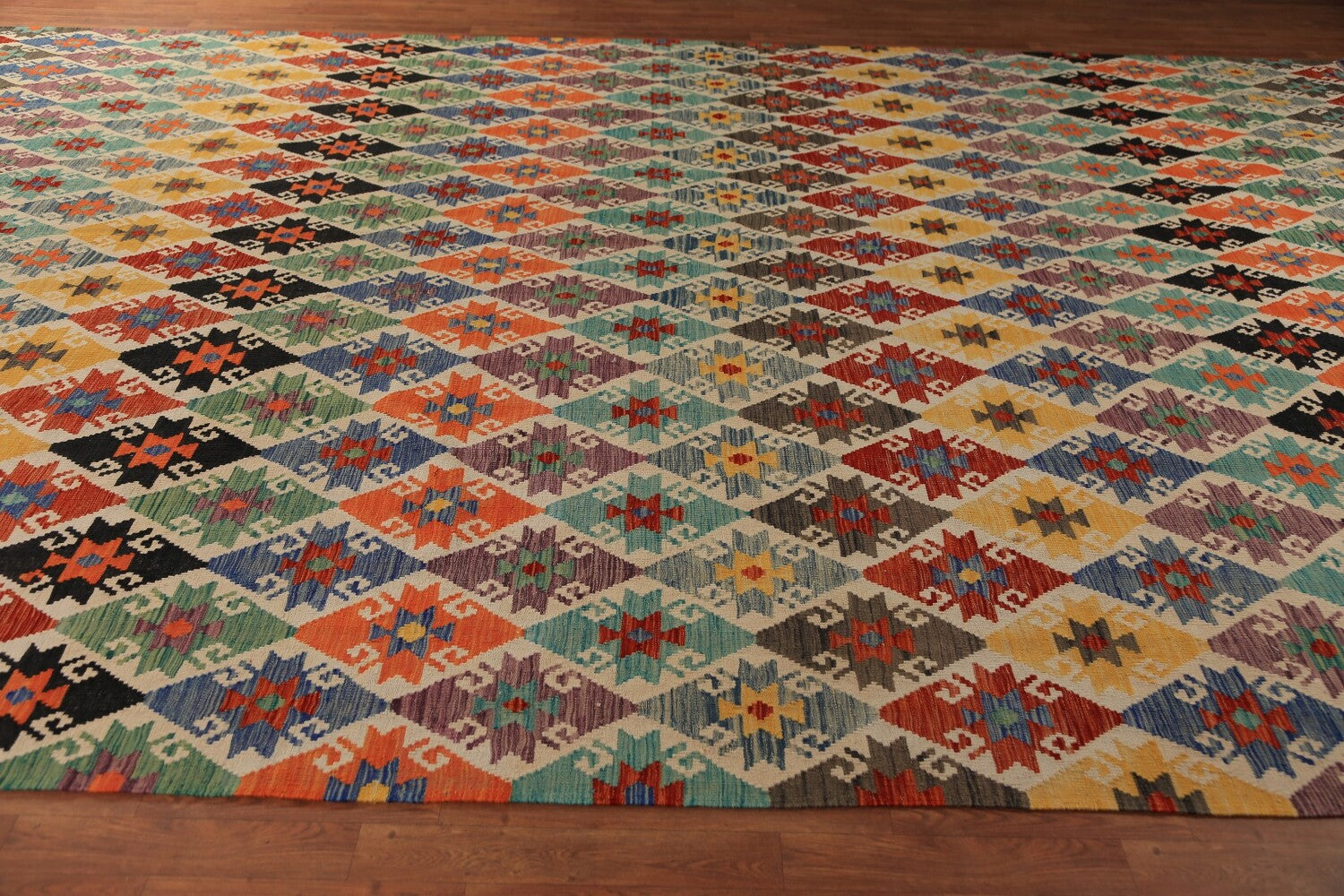 A Beautiful Genuine Pakistan Kilim rug is Hand Woven by skillful weavers in Pakistan with 100% Wool Material. This rug is in New, First Quality condition. dimensions are 16' 0'' X 10' 4'' in foot and 488 X 315 in centimeter. the primary color is Multi-Colored.