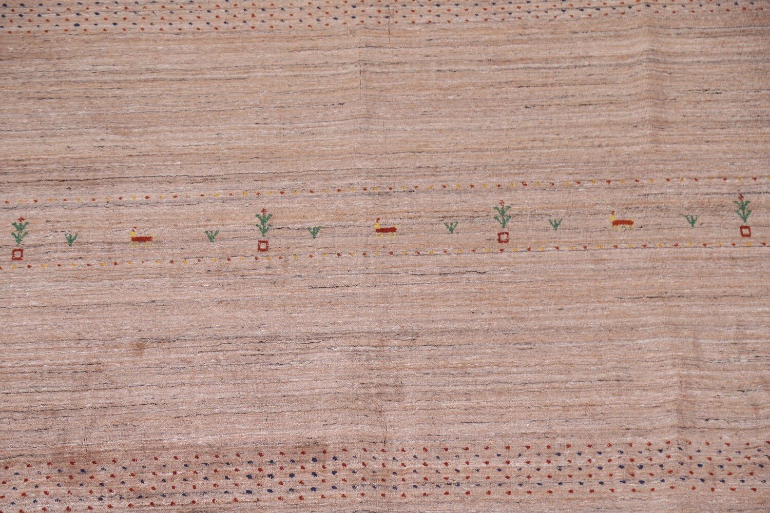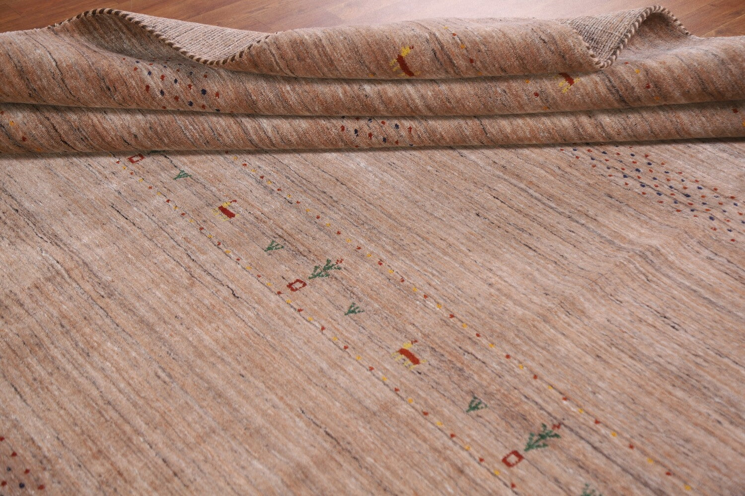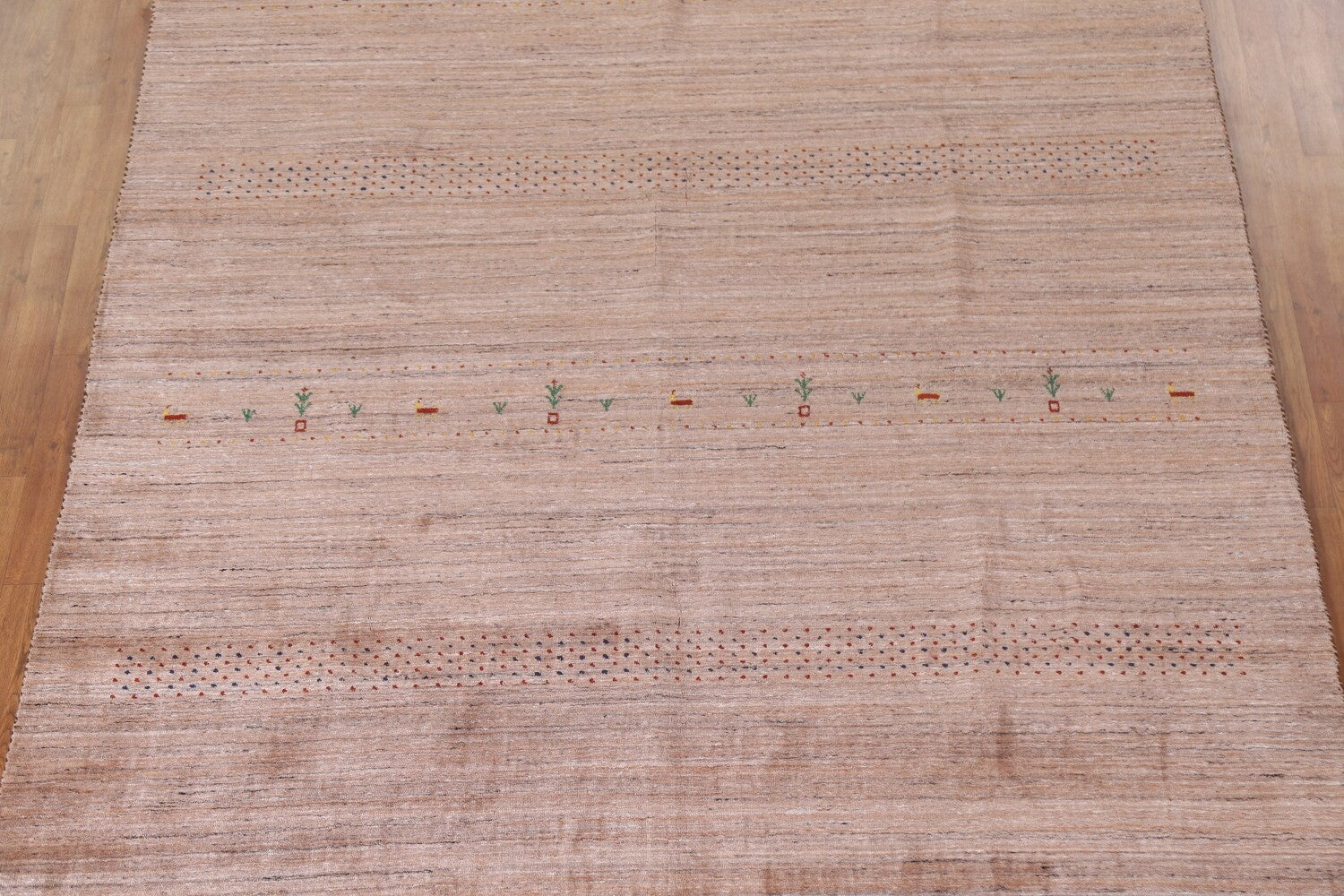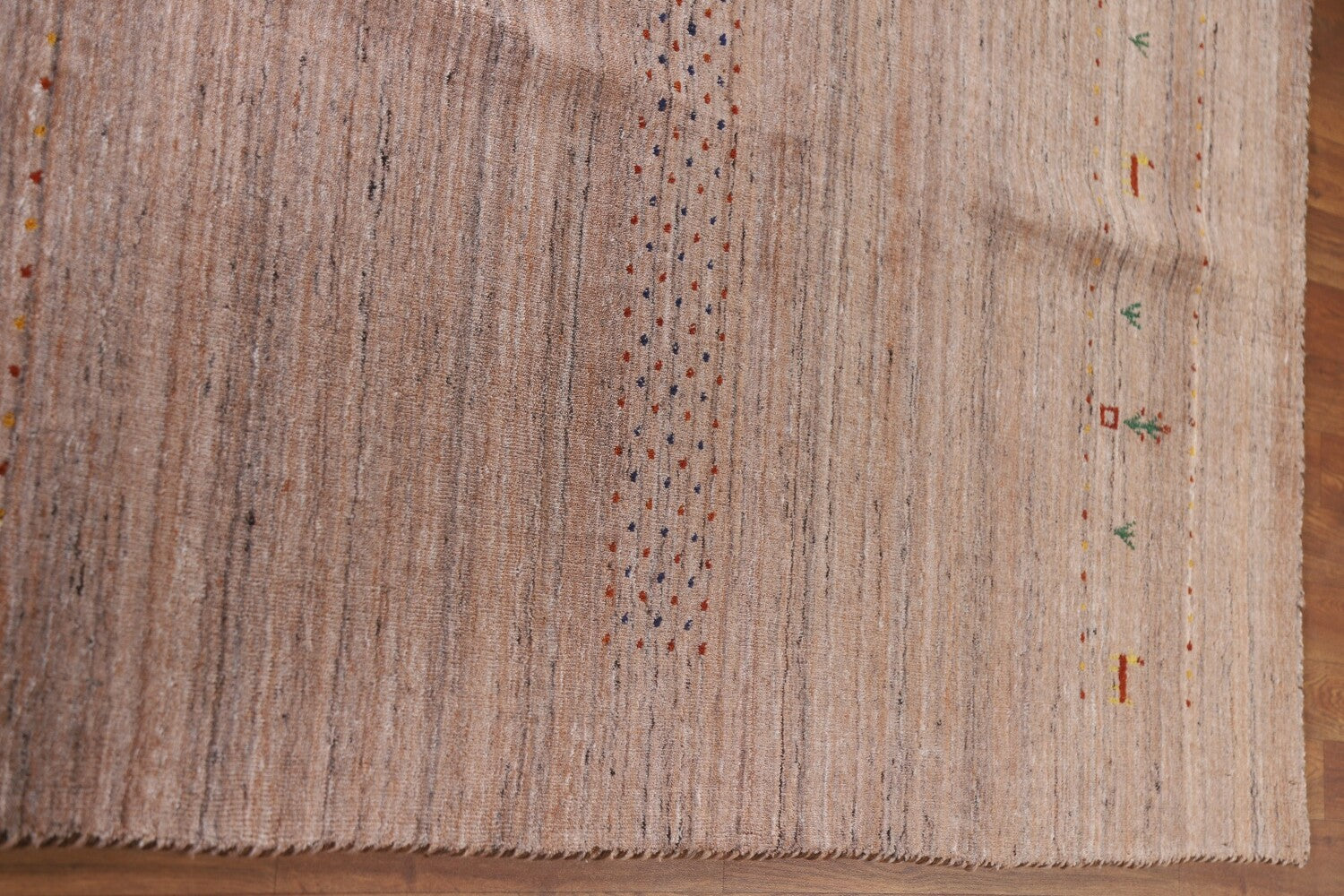 A Beautiful Genuine India Gabbeh rug is Hand Knotted by skillful weavers in India with 100% Wool Material. This rug is in New, First Quality condition. dimensions are 9' 9'' X 7' 11'' in foot and 297 X 241 in centimeter. the primary color is Peach.